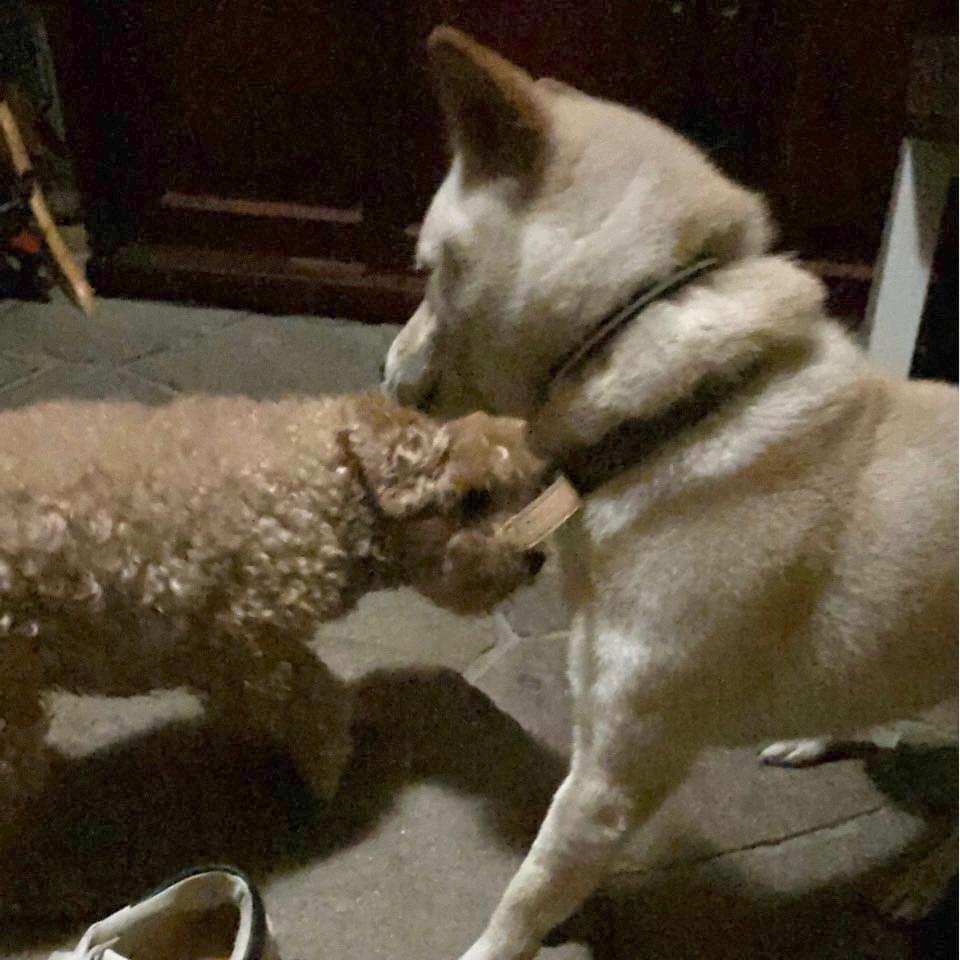 白〜ベージュの犬、グリーンの首輪にリボン付、柴犬