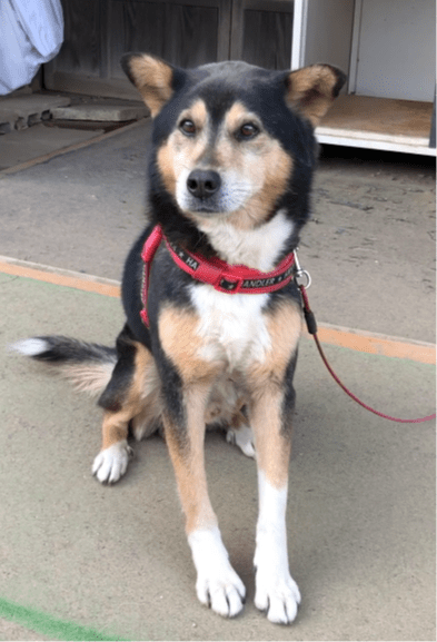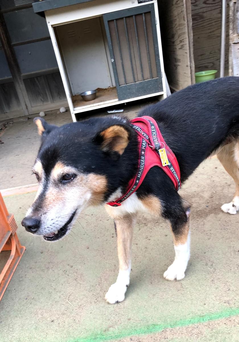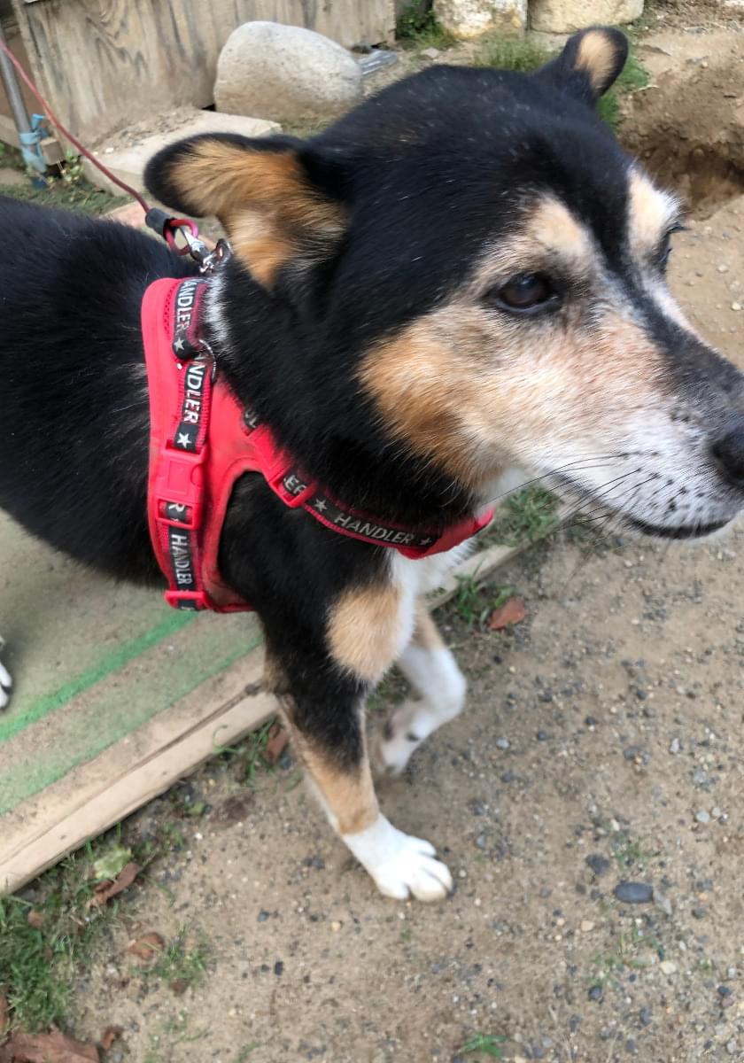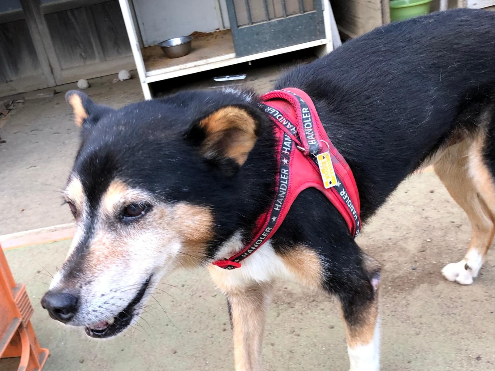赤いハーネスを付けた黒柴の雑種を探しています。事故の目撃情報数件あり