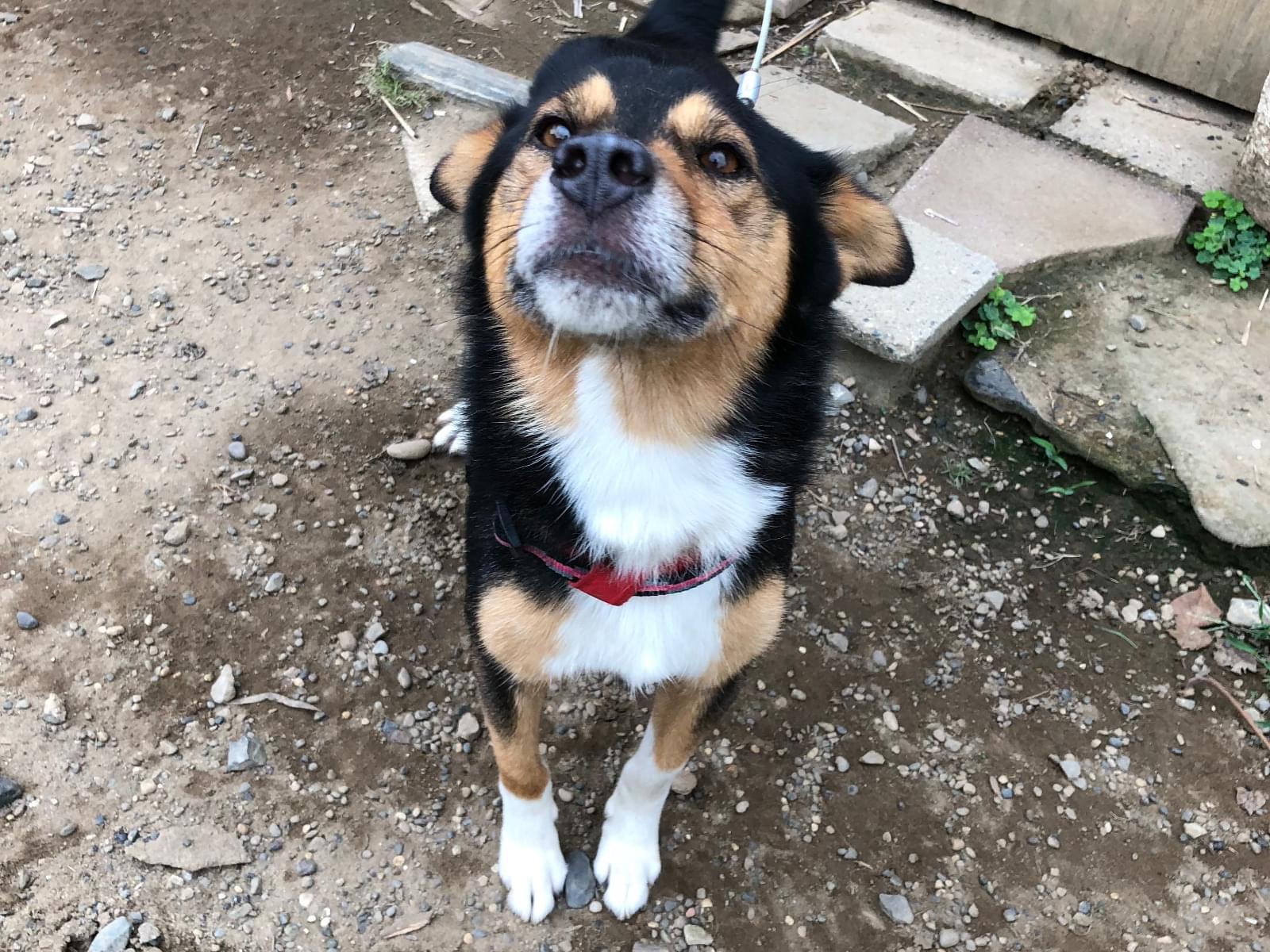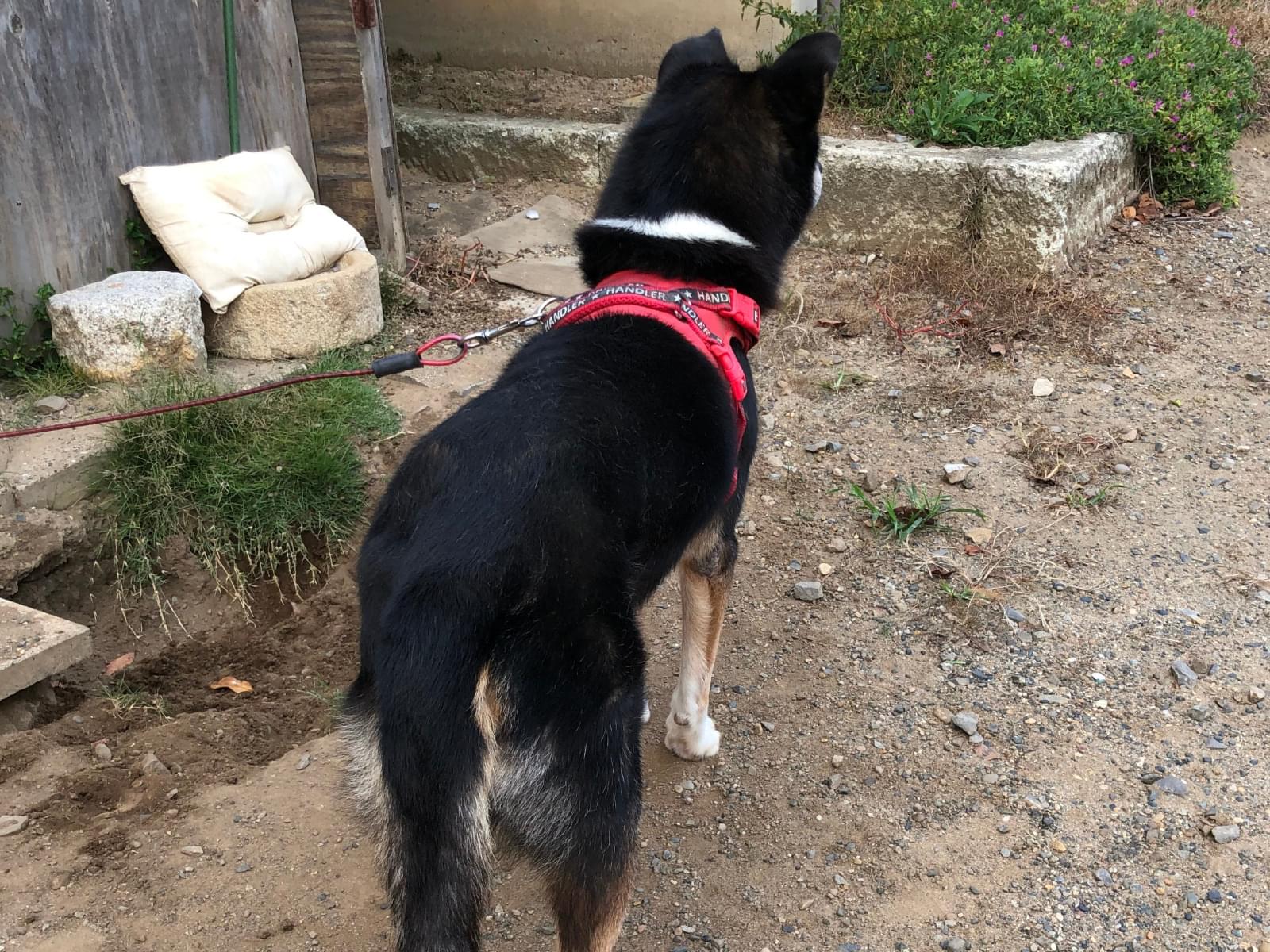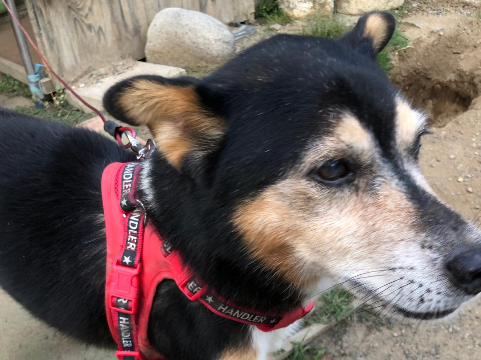 赤いハーネスを付けた黒柴の雑種を探しています。事故の目撃情報数件あり