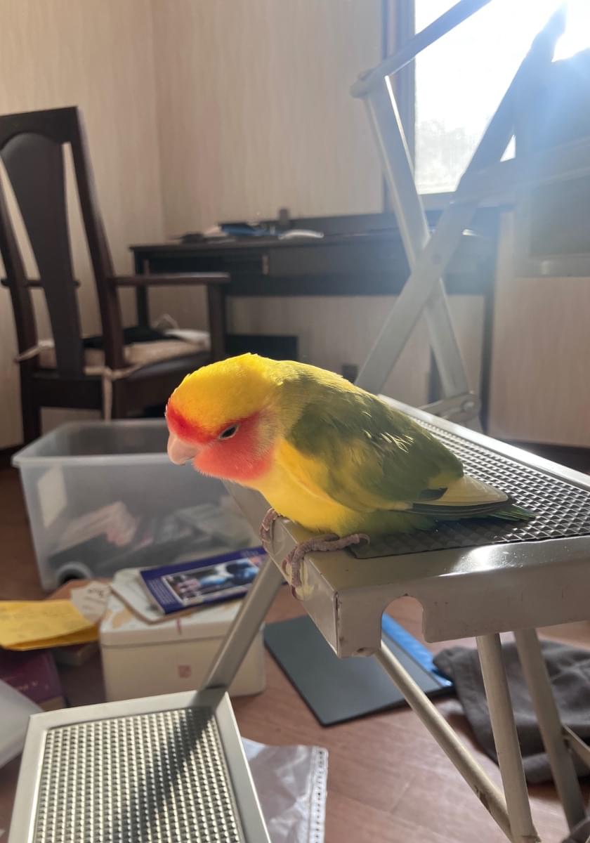 16:00頃ベランダから部屋に入って来ました。とても人懐っこくずっと手や頭にとまっていました。黄色の身体、羽が黄緑、尻尾に水色部分あり、顔はオレンジです。交番(太子橋)に届けました。