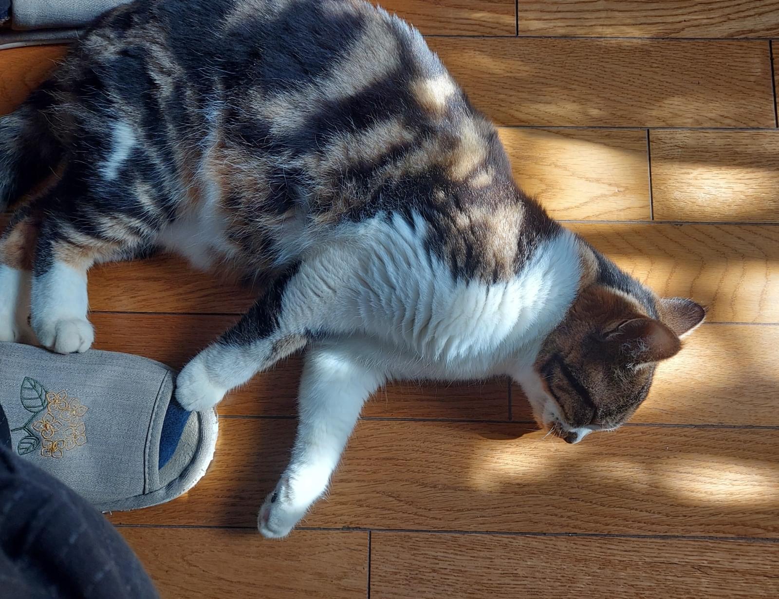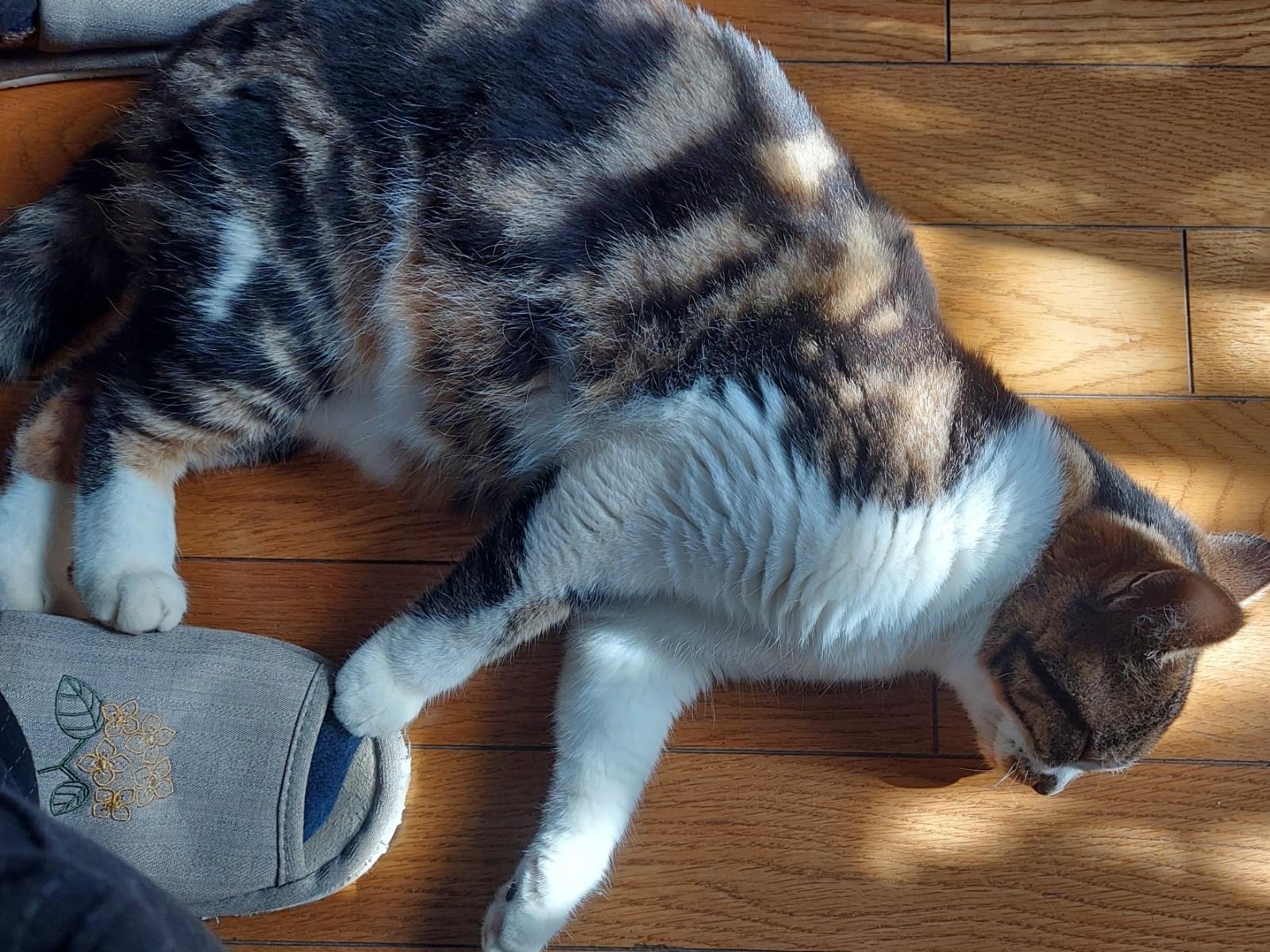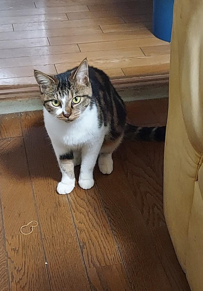 焦げ茶のしま模様で、人が来るとすり寄ってきて人懐こいです。