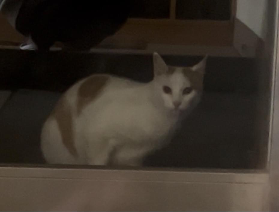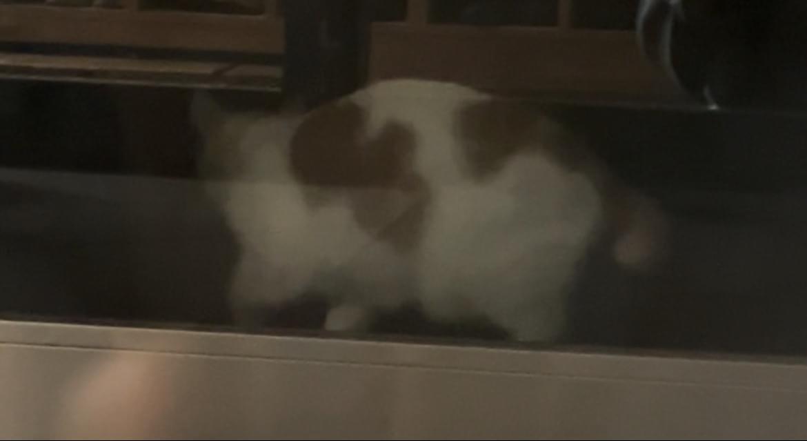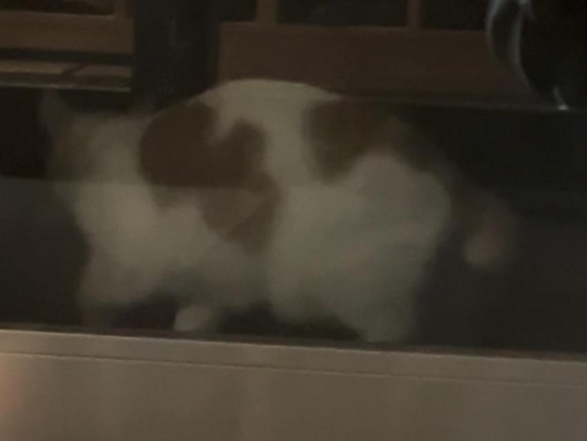 全身に白多めで、茶色の模様が背中と頭(ハチワレ状)にあります。