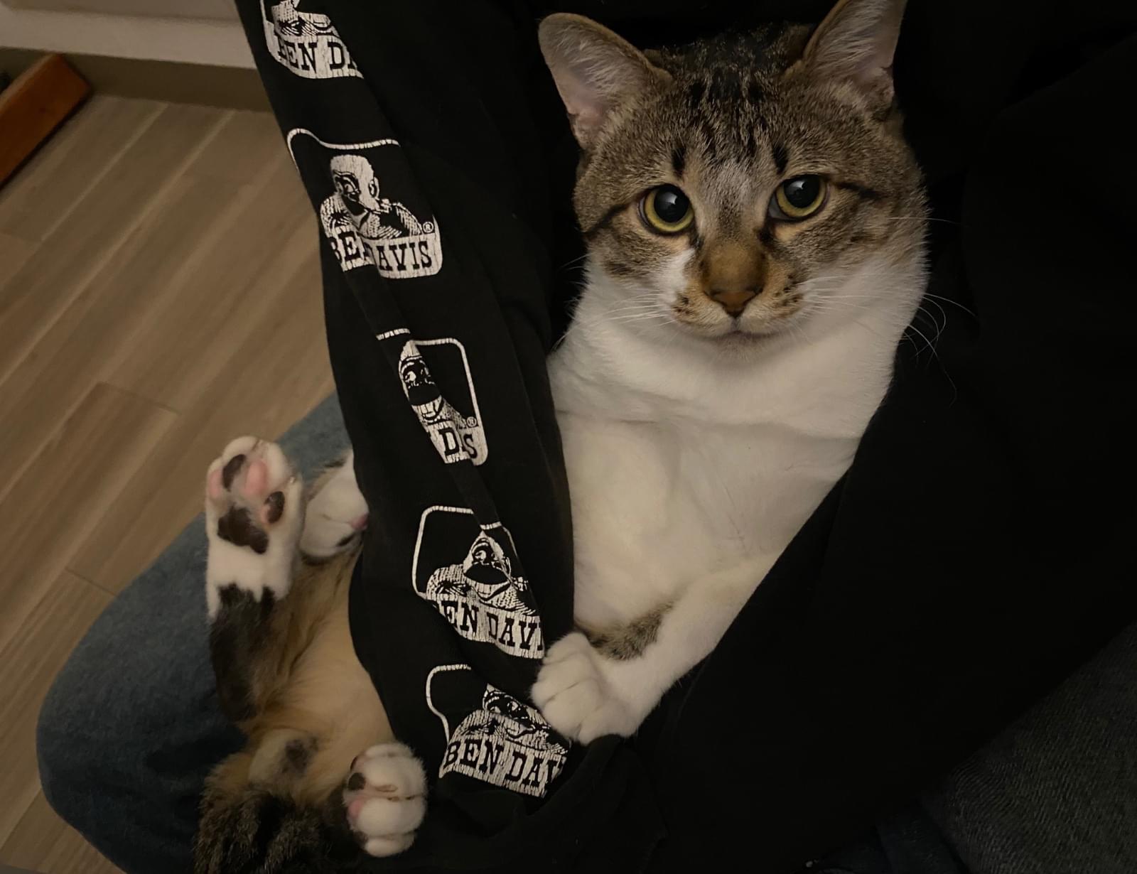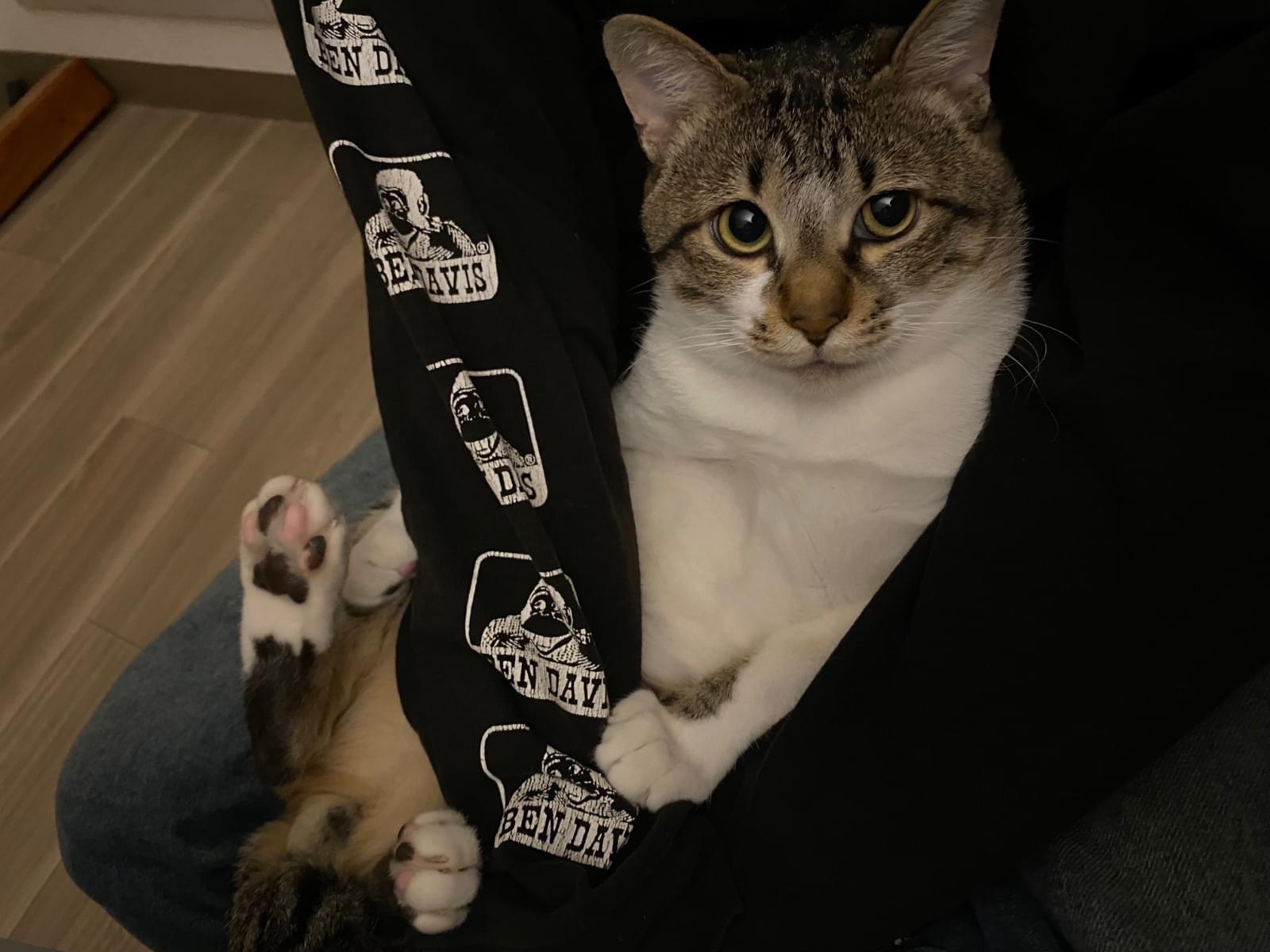 お腹は白く、背中側は茶色っぽい色に黒い縞模様が入ってます。キジシロです