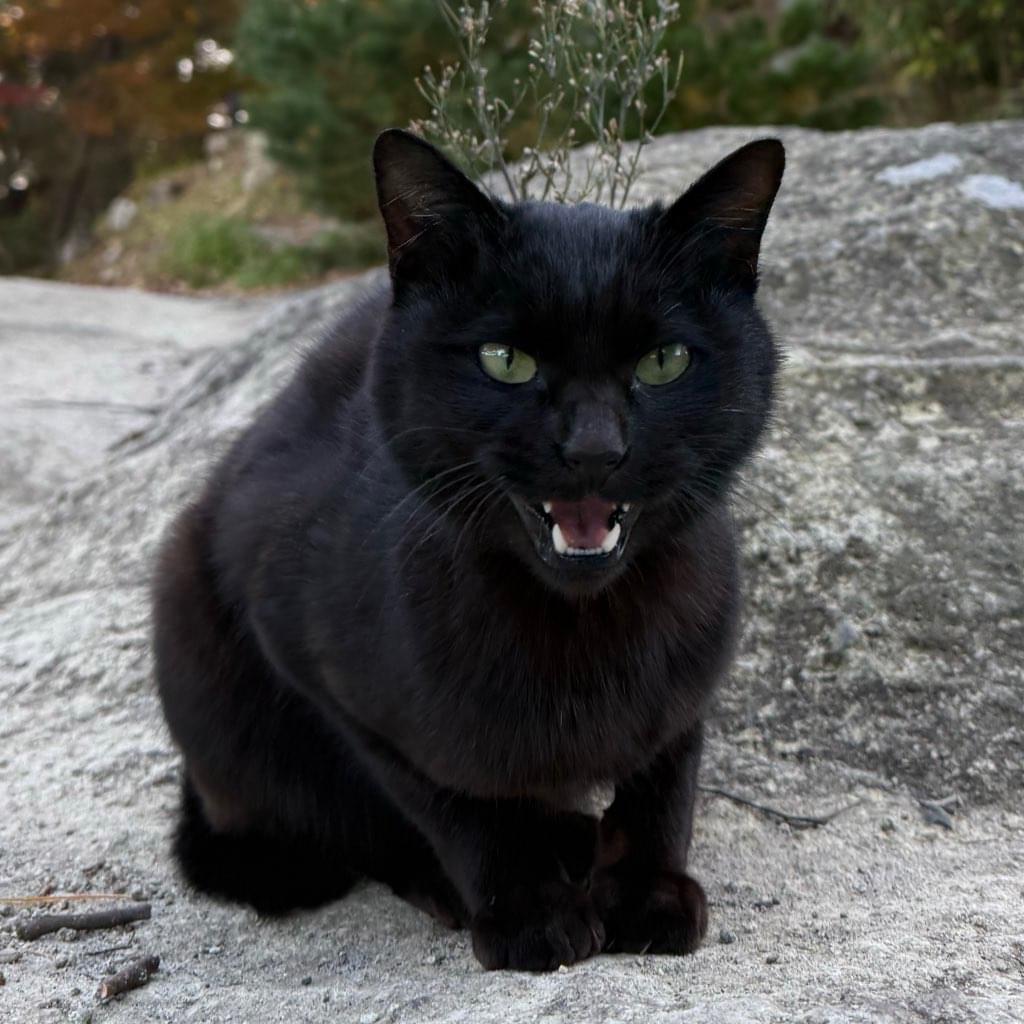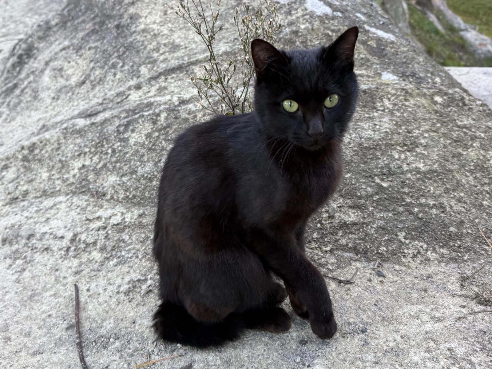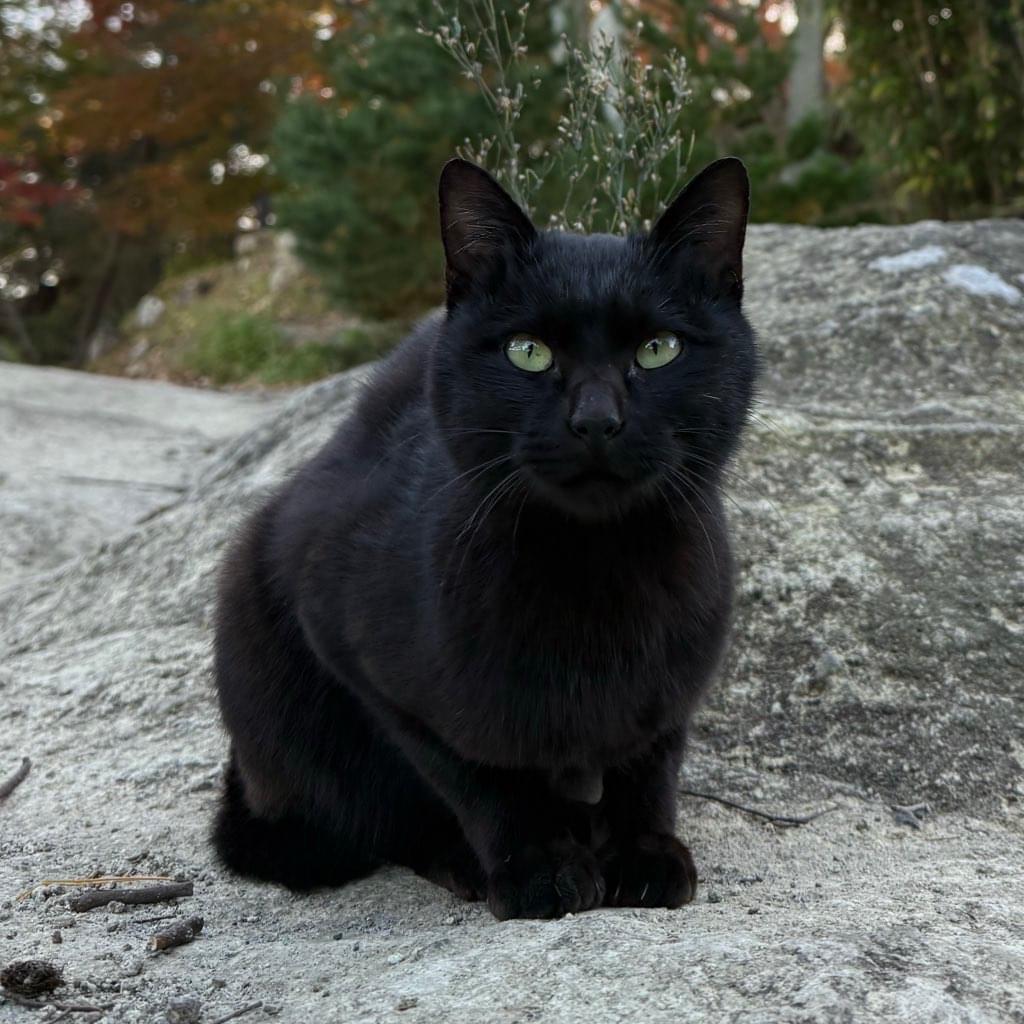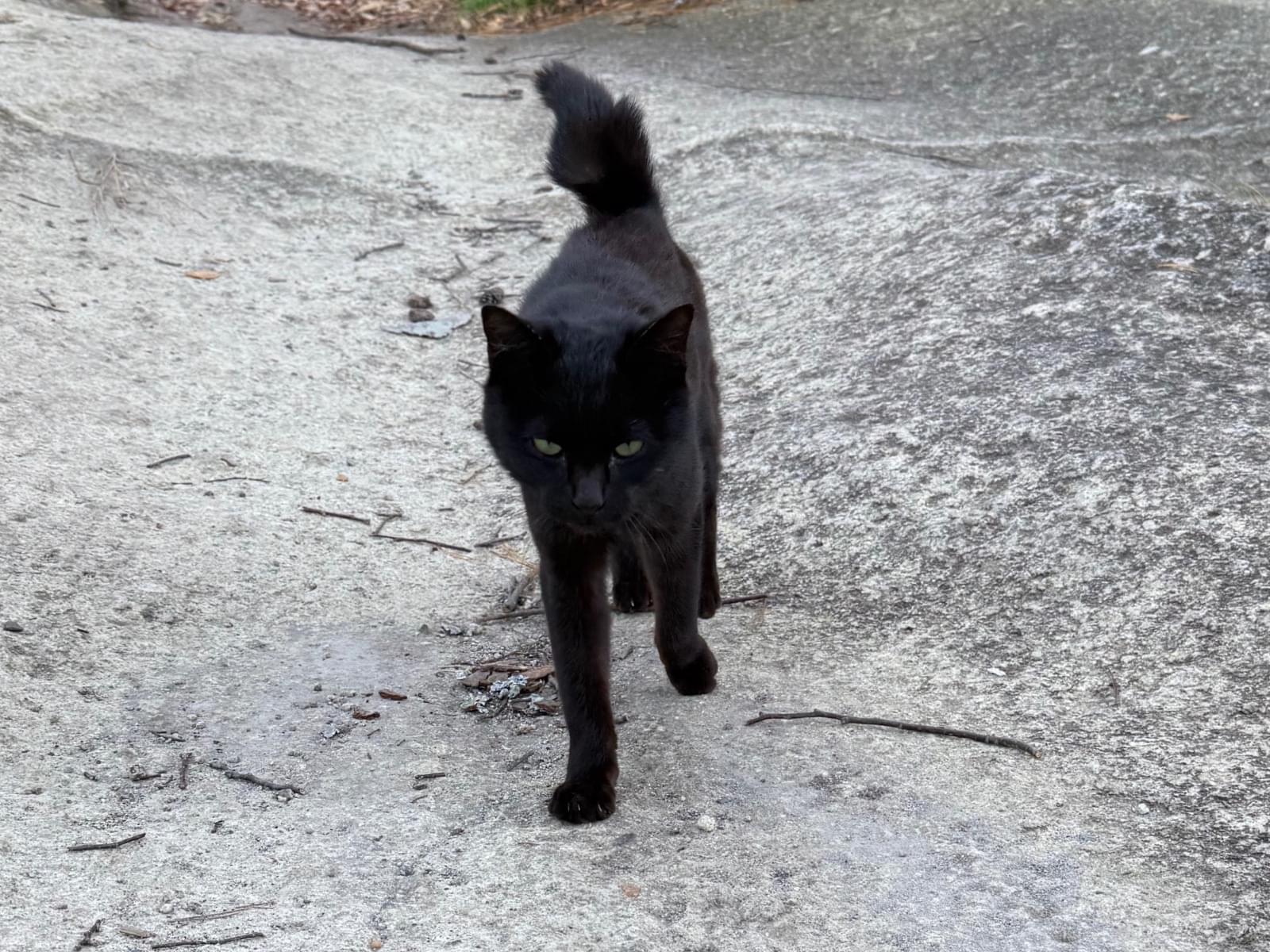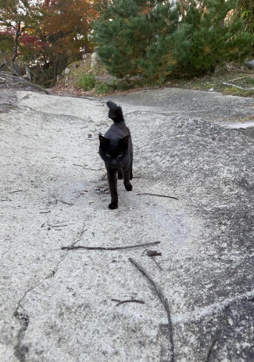 雄島, 松島 で痩せた黒猫のオスを見かけました。尻尾が曲がっていて、よく鳴き、とても人懐っこいです。