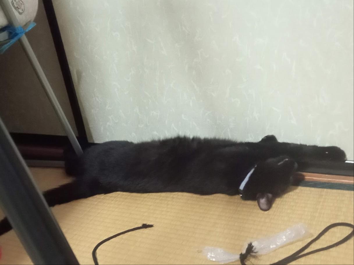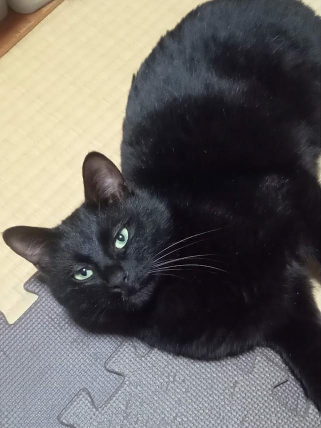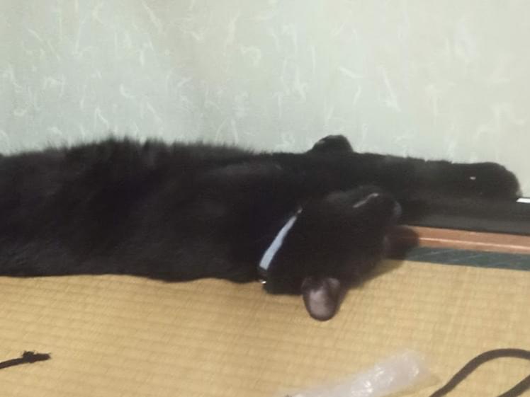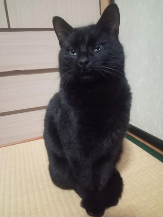 ワンポイントのない真っ黒な被毛、尻尾は真っ直ぐで長いです