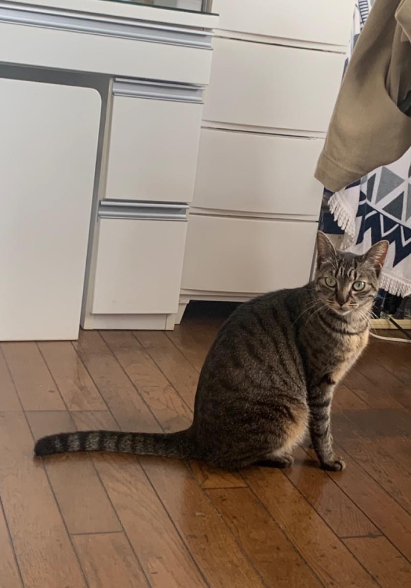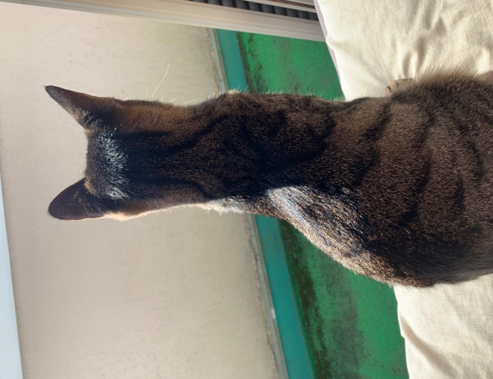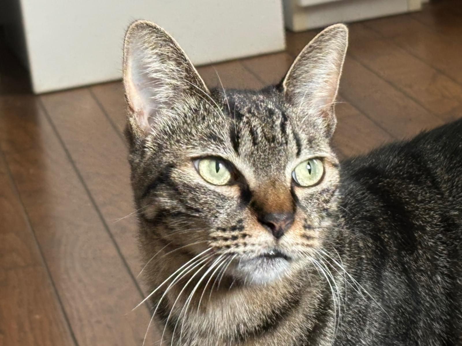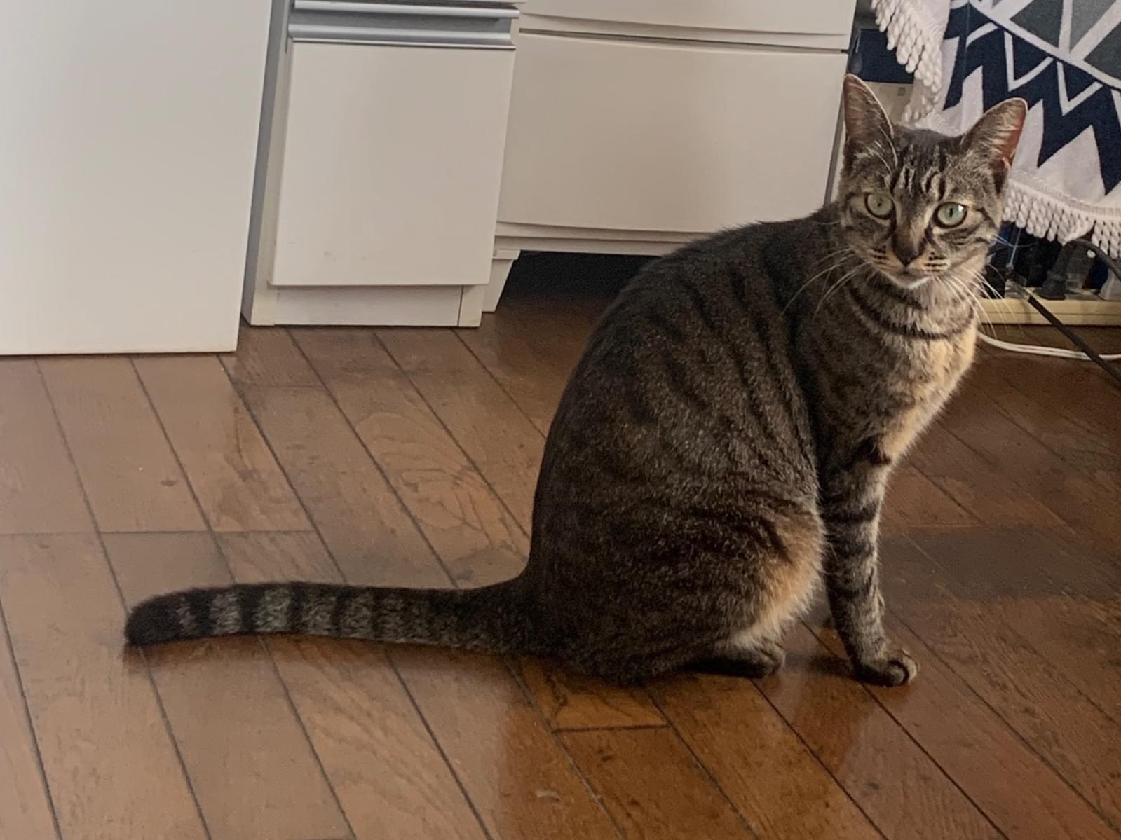 尻尾が真っ直ぐ、鼻筋が赤茶のメスのキジトラ