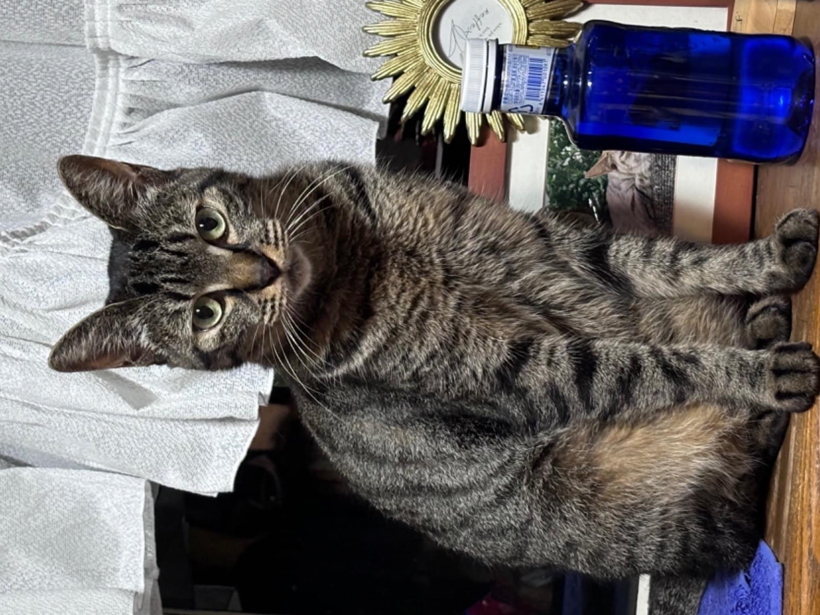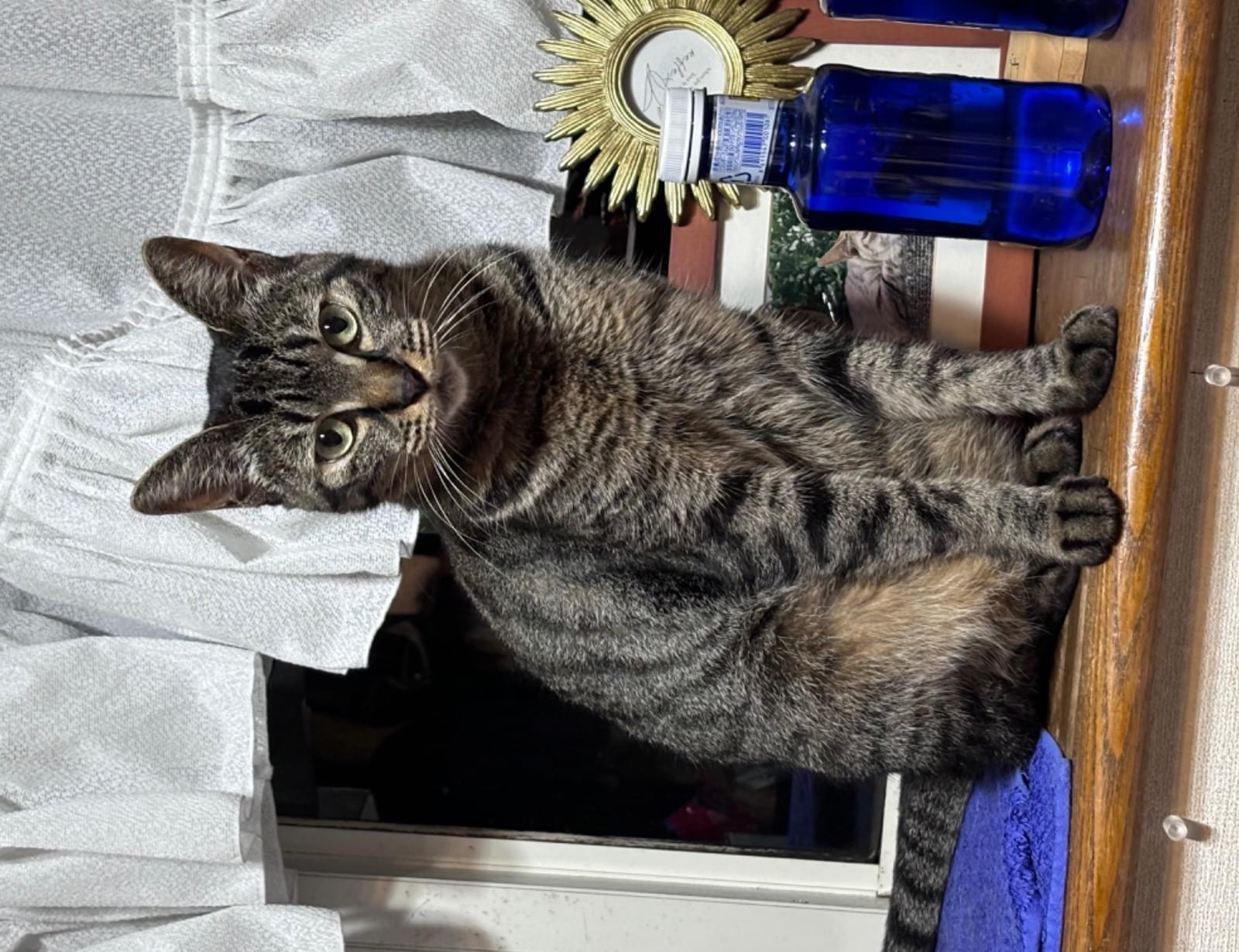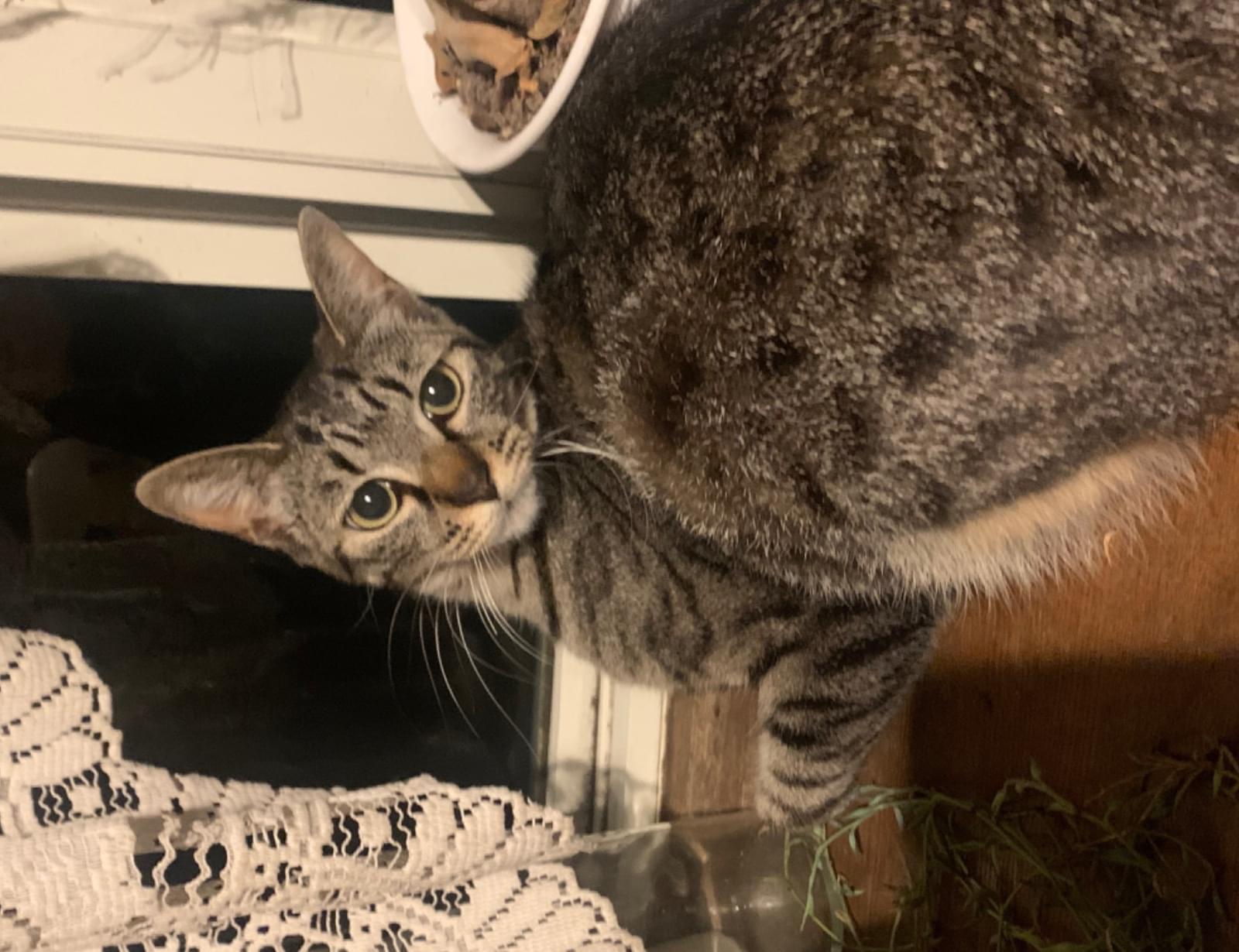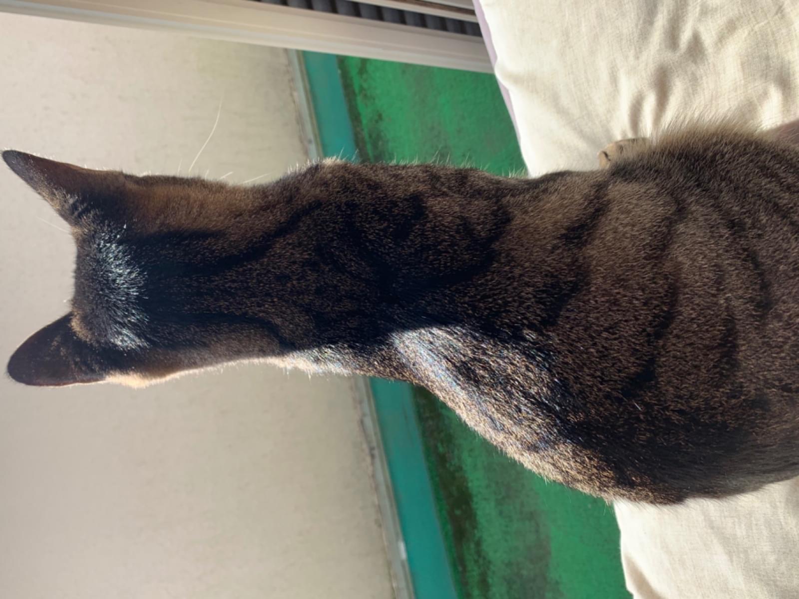 尻尾が真っ直ぐ、鼻筋が赤茶のメスのキジトラ