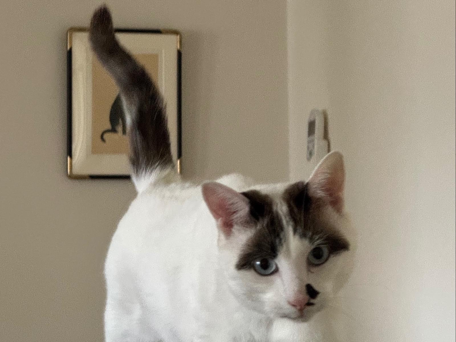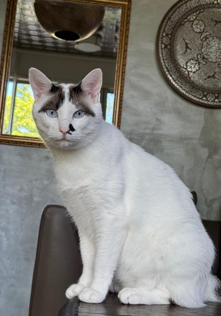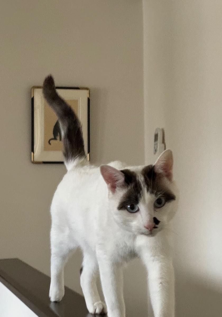 白に黒の模様。尻尾は、長尾で黒いぽっちゃりの男のこ