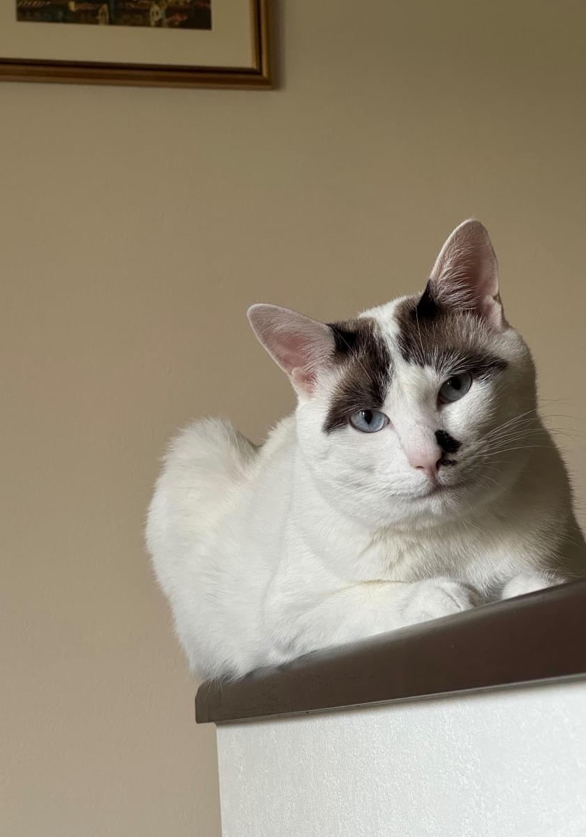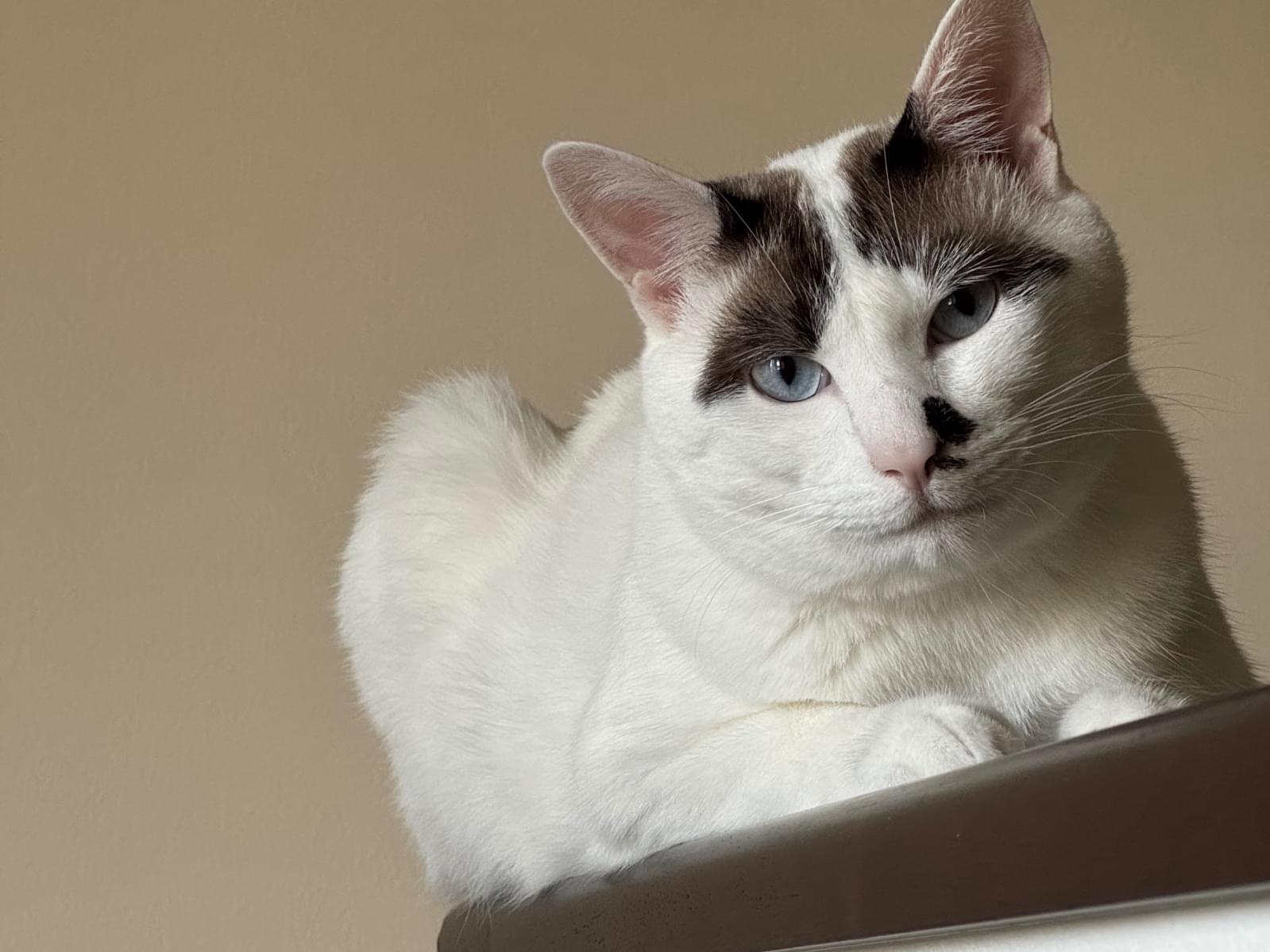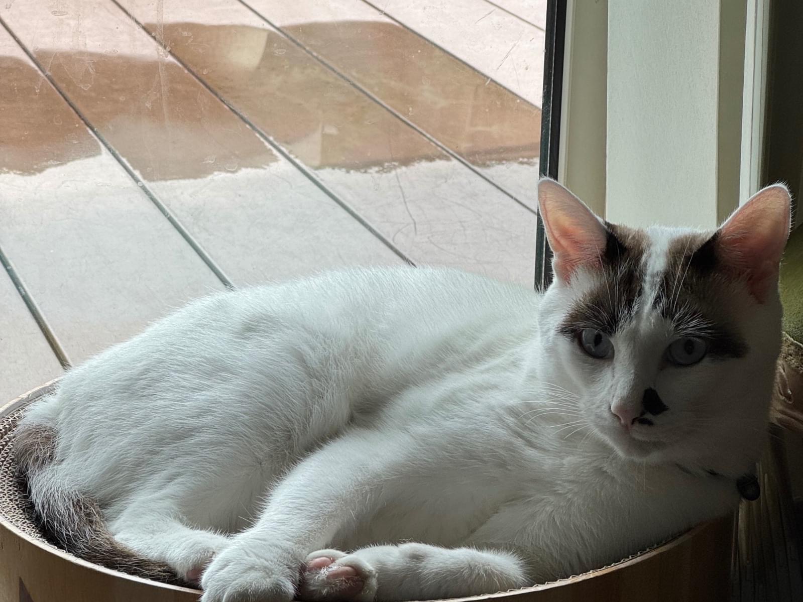 白に黒の模様。尻尾は、長尾で黒いぽっちゃりの男のこ