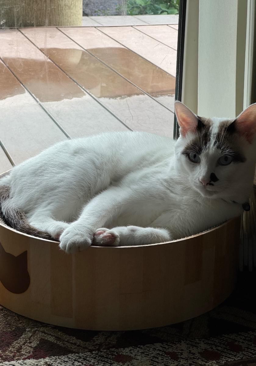元ノラで怖がりです。首には、鈴をつけた黒いゴムが付いています。