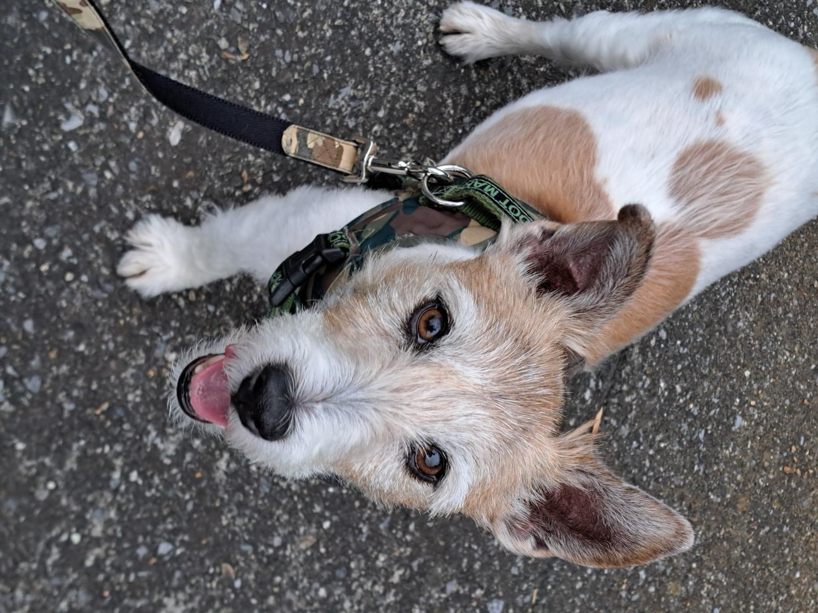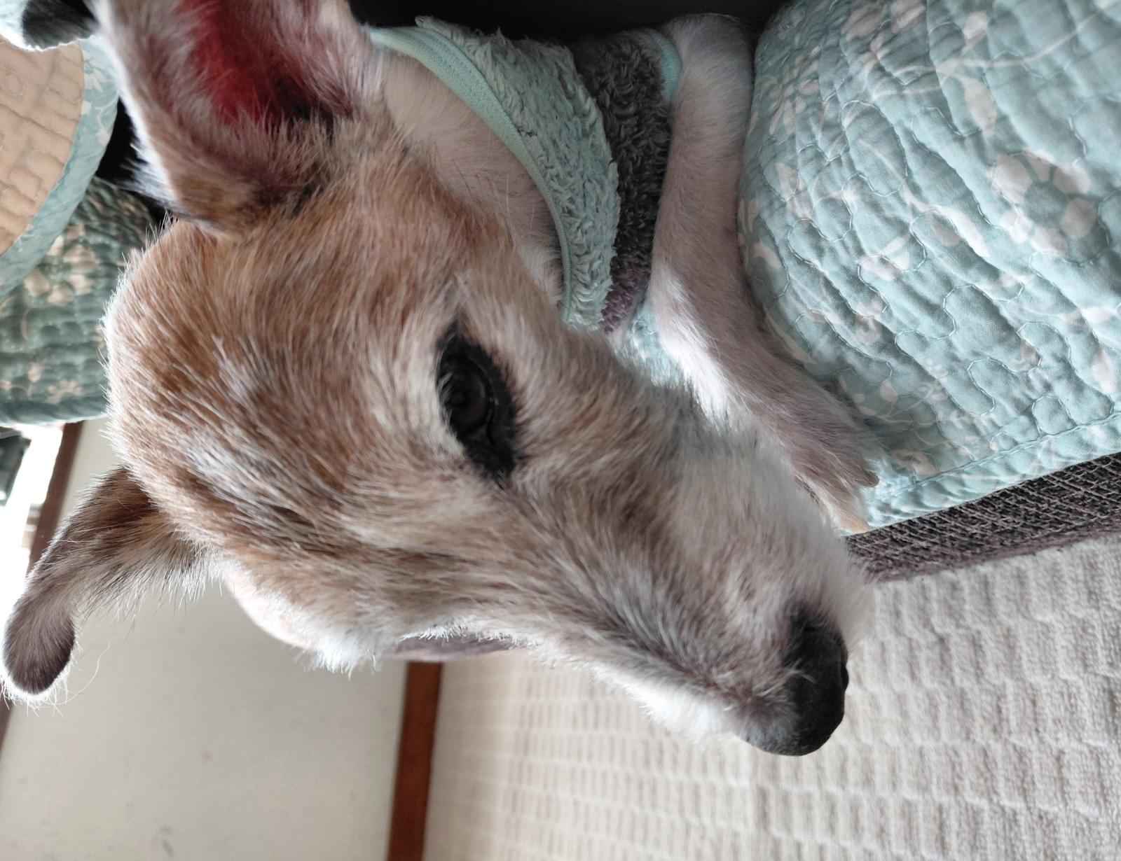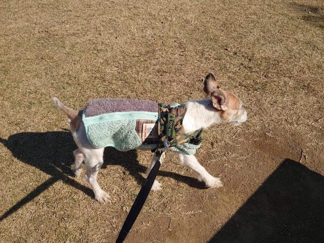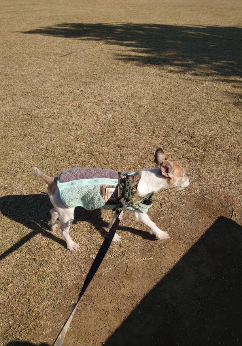 痩せ形で青い服を着た高齢犬のジャックラッセルテリアを探してます。
