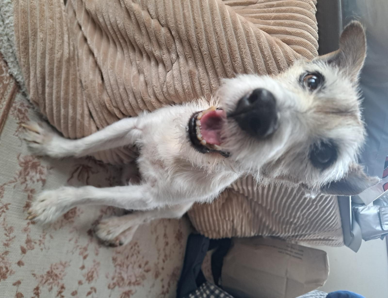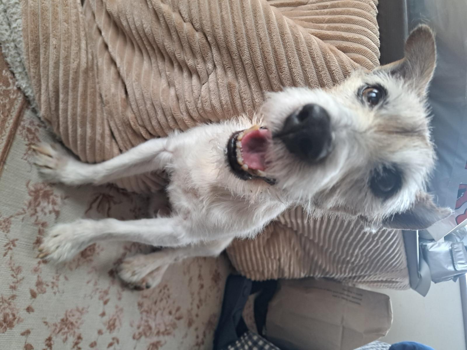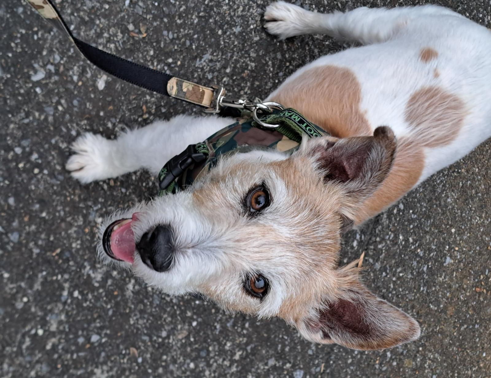 痩せ形で青い服を着た高齢犬のジャックラッセルテリアを探してます。