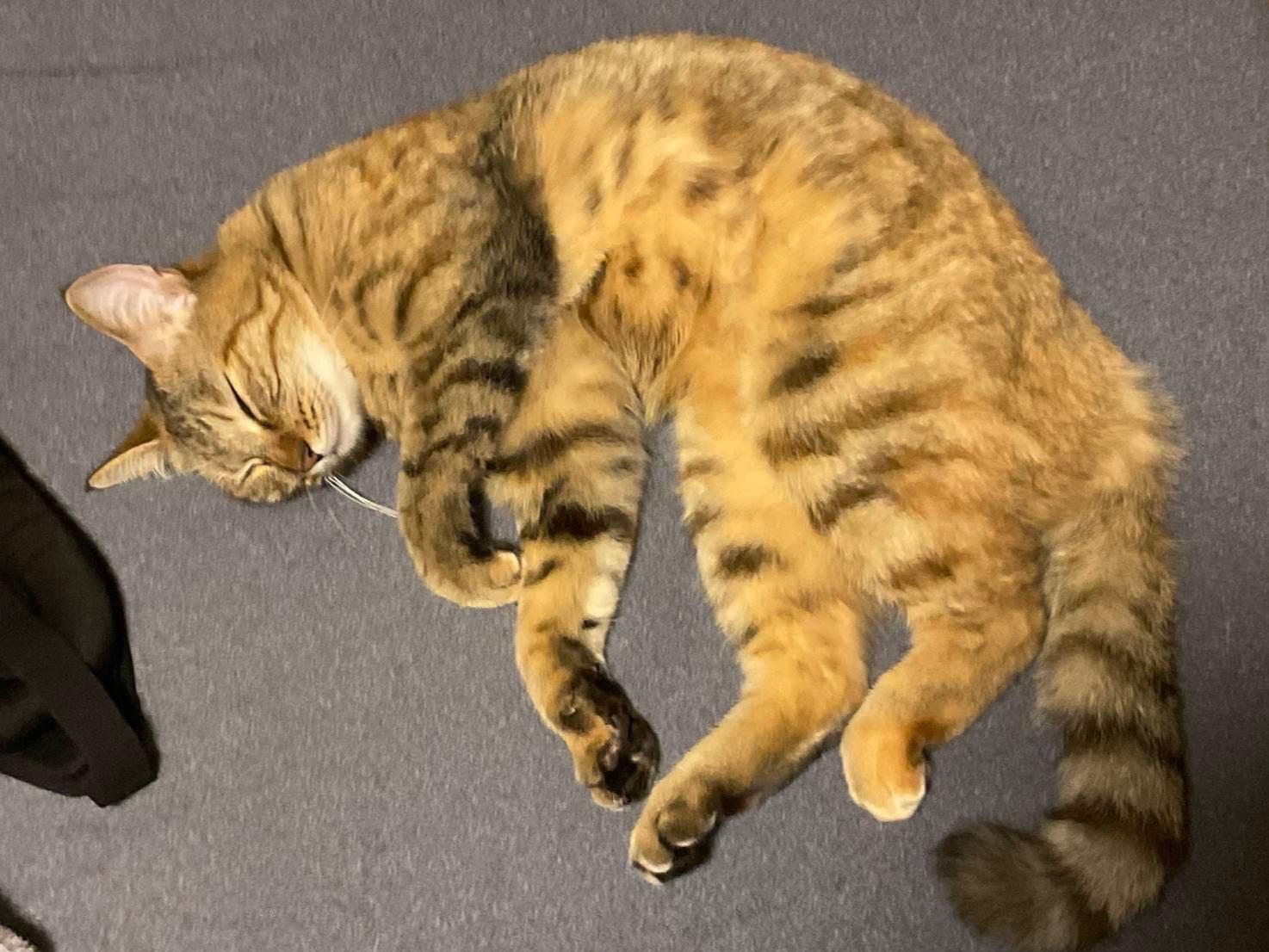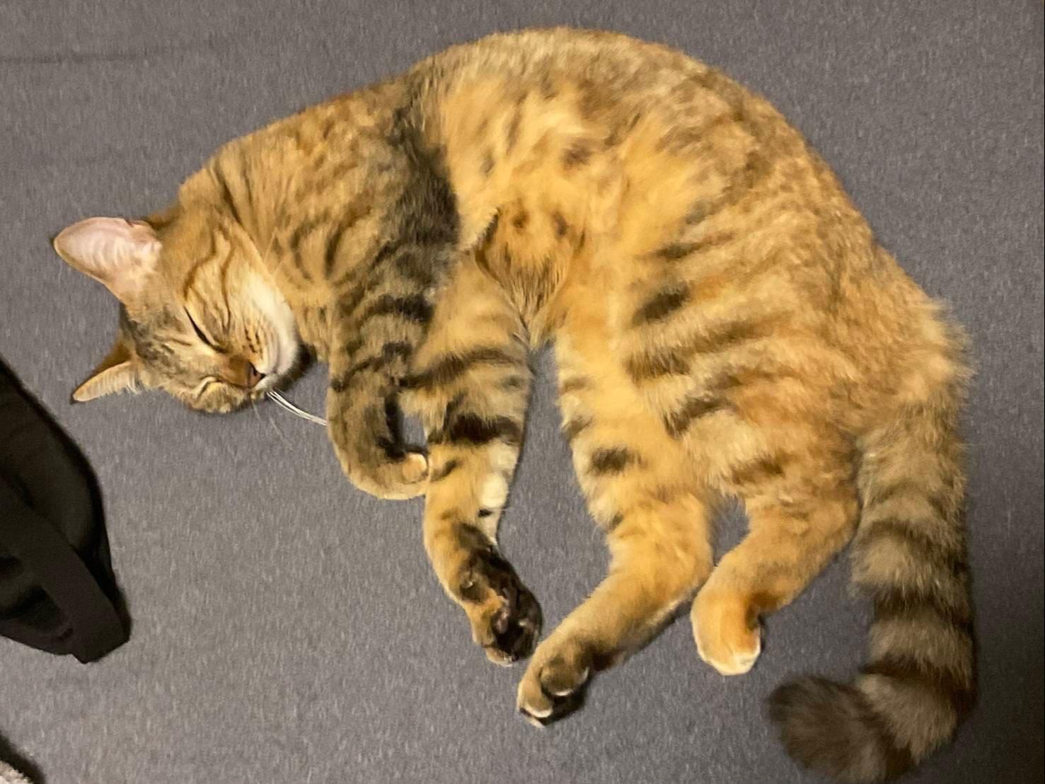 ところどころ濃いキジトラ柄で、足の裏が黒いです。