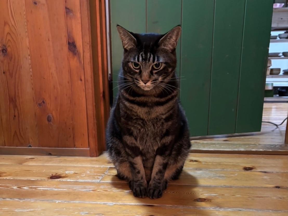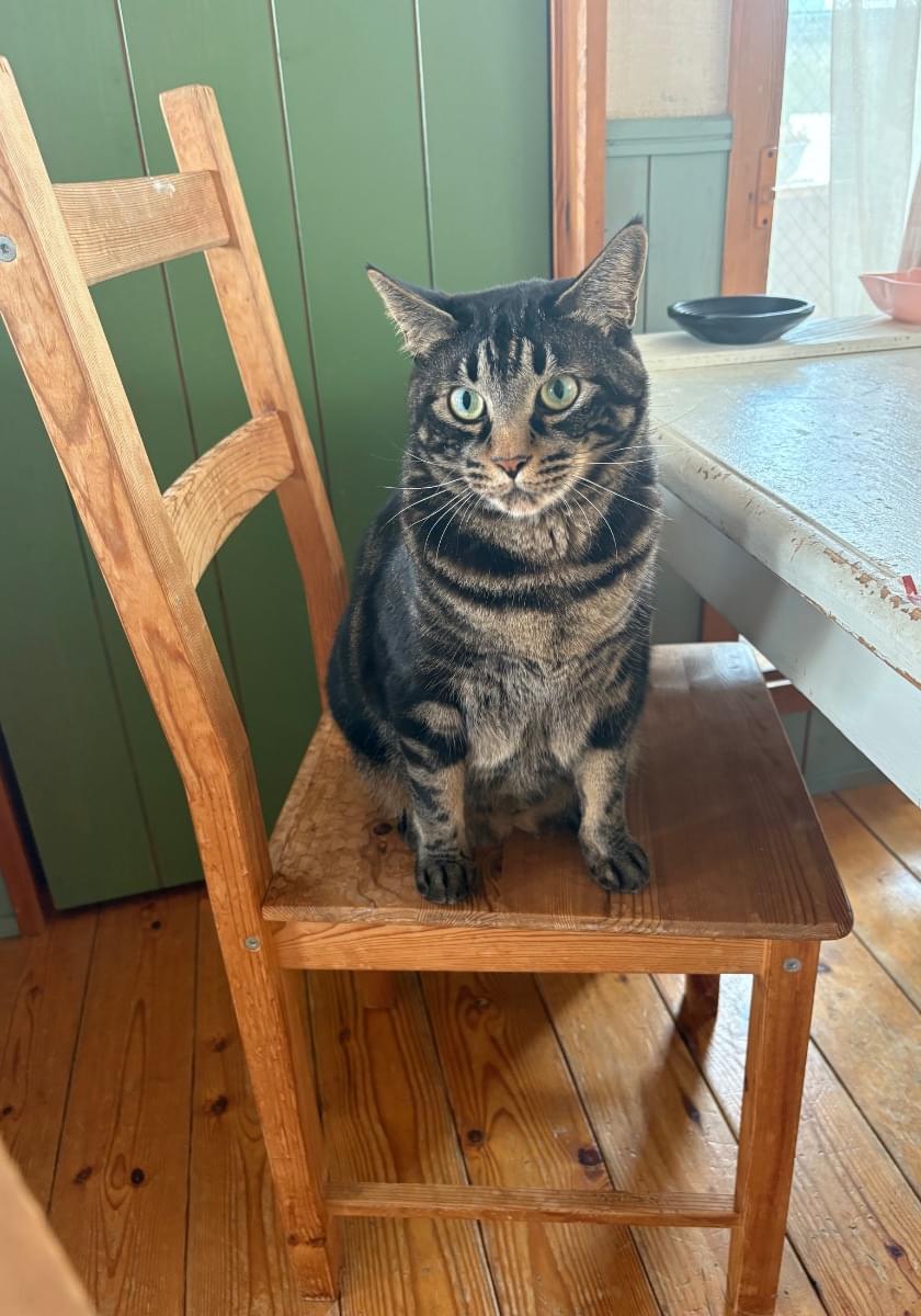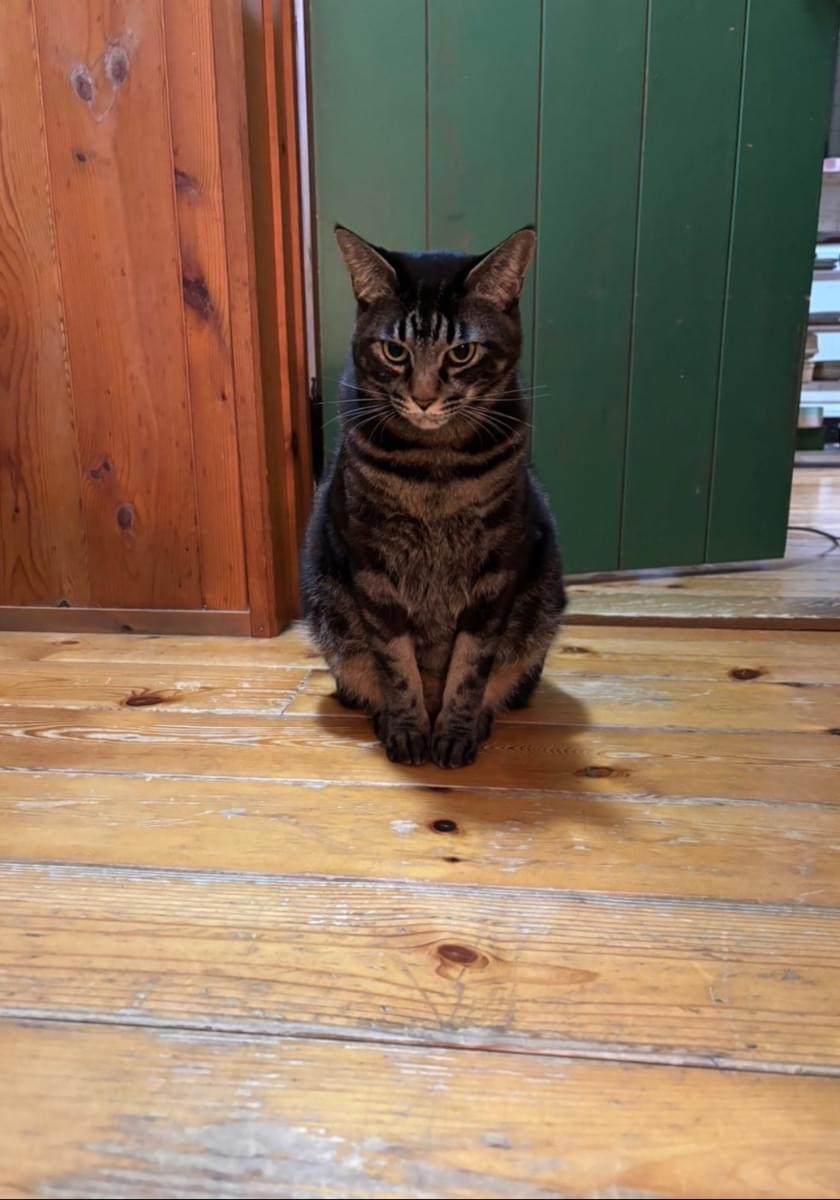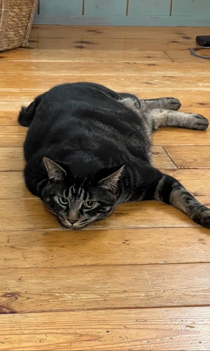 とっても大きく(8キロ)、穏やかでビビリな、ほとんど黒のキジトラ猫です。人を怖がってしまうので、きっとどこかでじっとしていると思います。首輪はついていませんが、とっても大きく毛並みも艶々なので飼い猫と分かる雰囲気です。