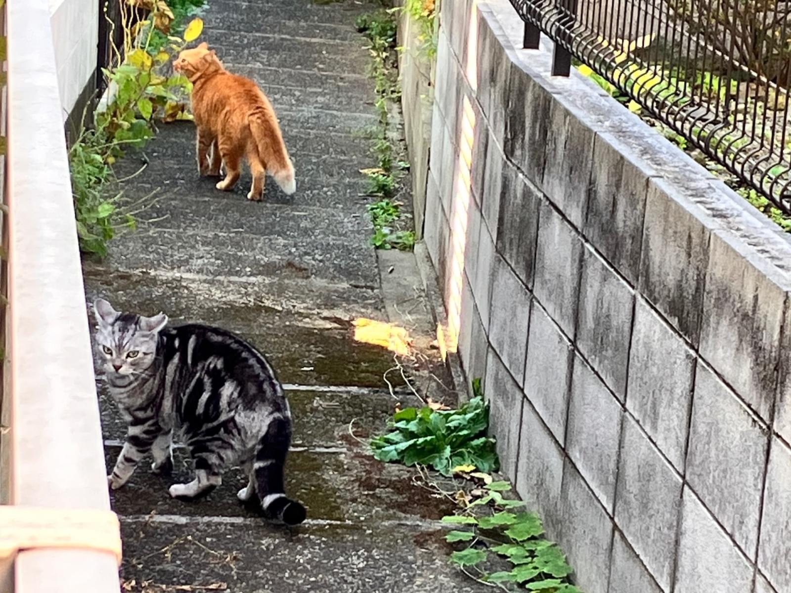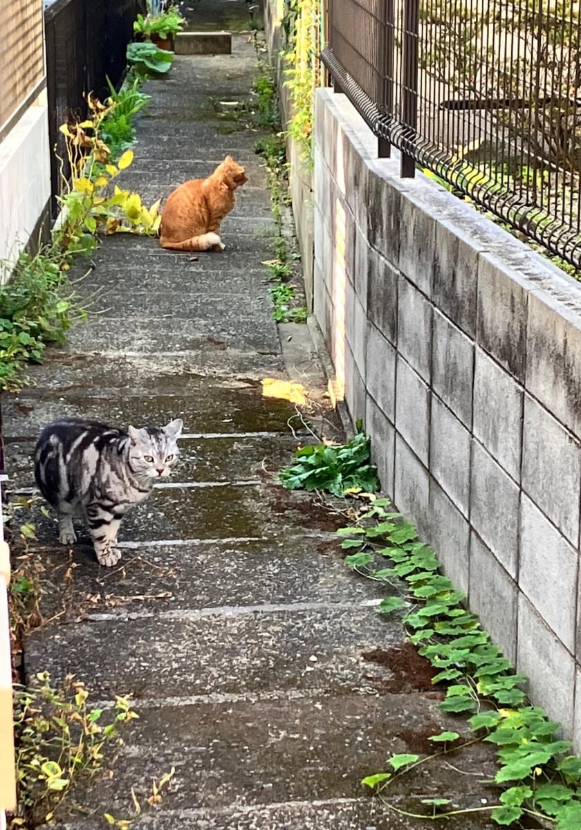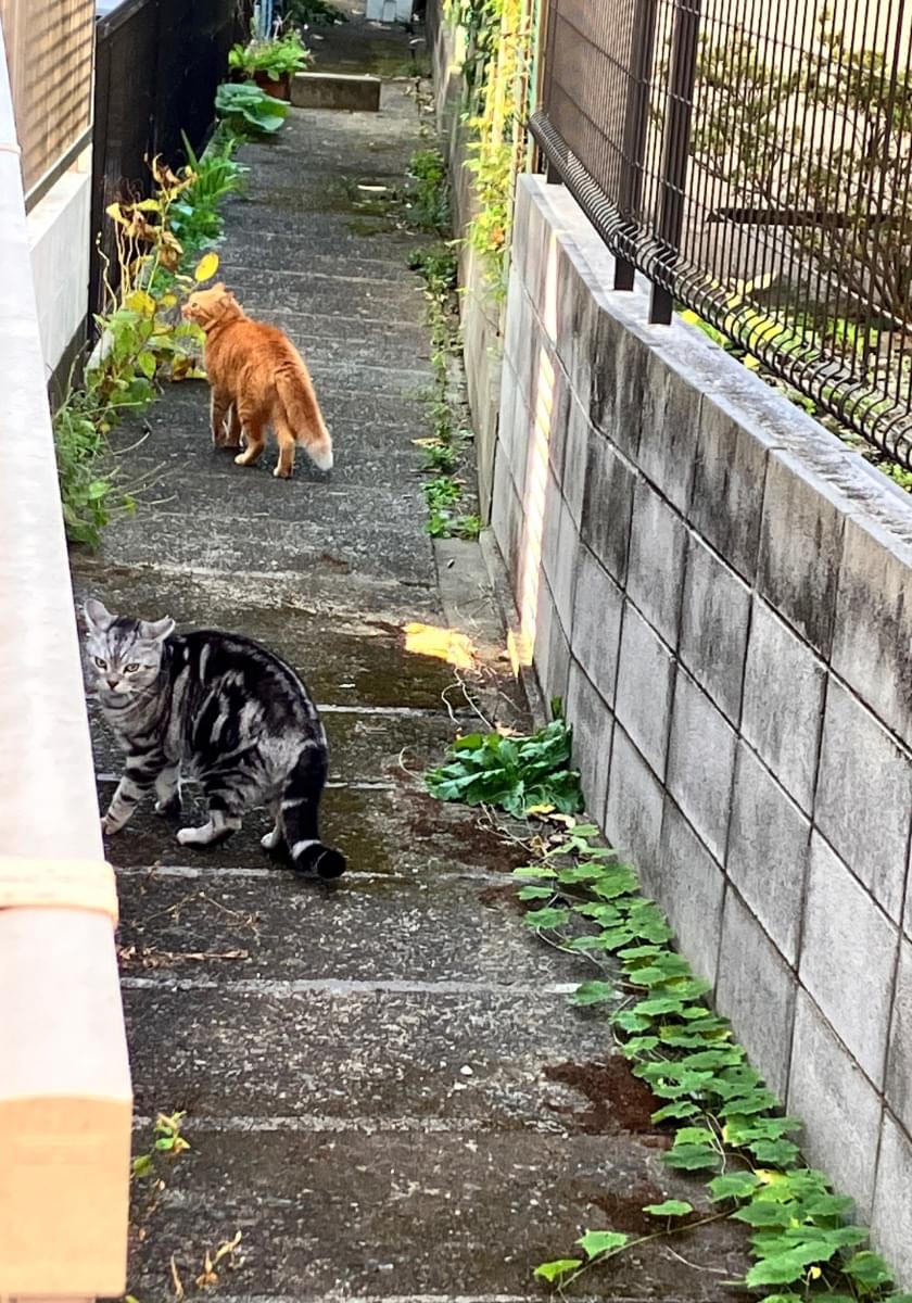 茶トラ猫が縄張り主のアメショー猫ちゃんに見つかり、30分程唸り声を上げていてボッコボコにしばき倒されて毛が抜けまくっていたので、茶トラの飼い主さんが見つかると良いなと思います。