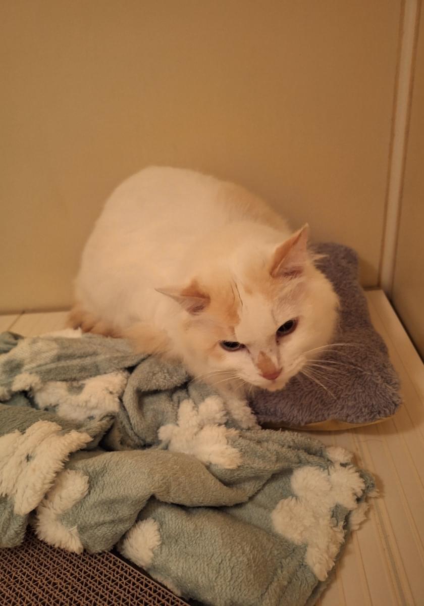 ターキッシュバン風、長毛白猫、茶色の部分あり、尻尾は茶色を保護しました
