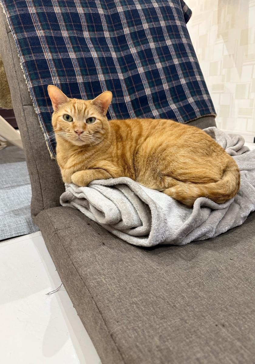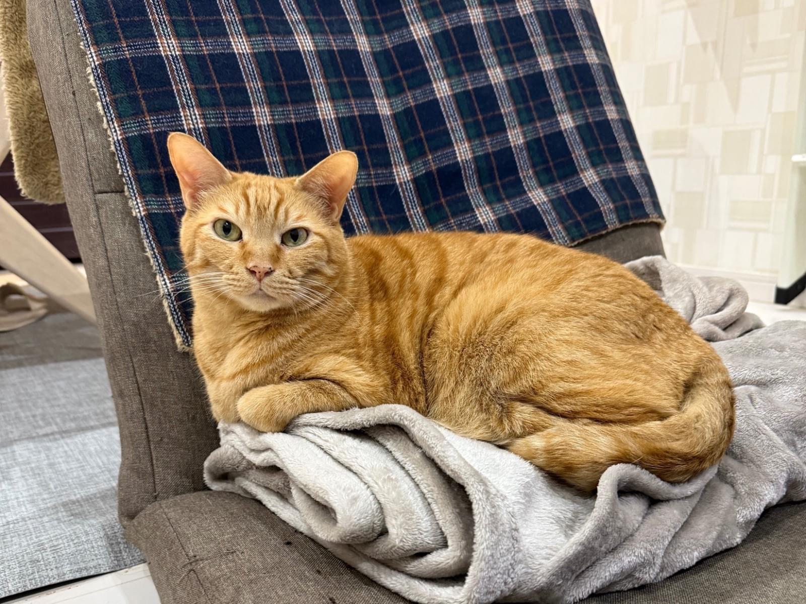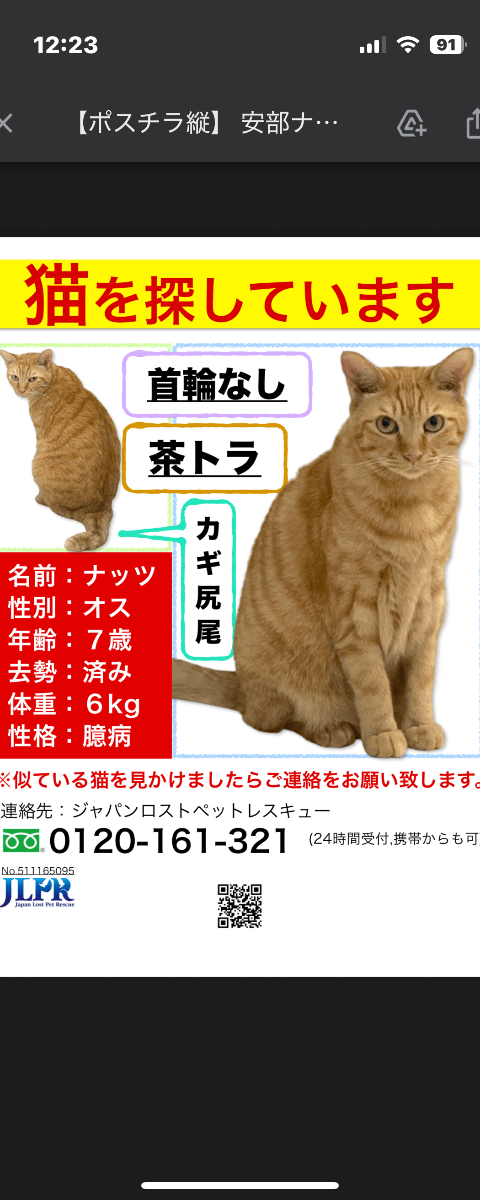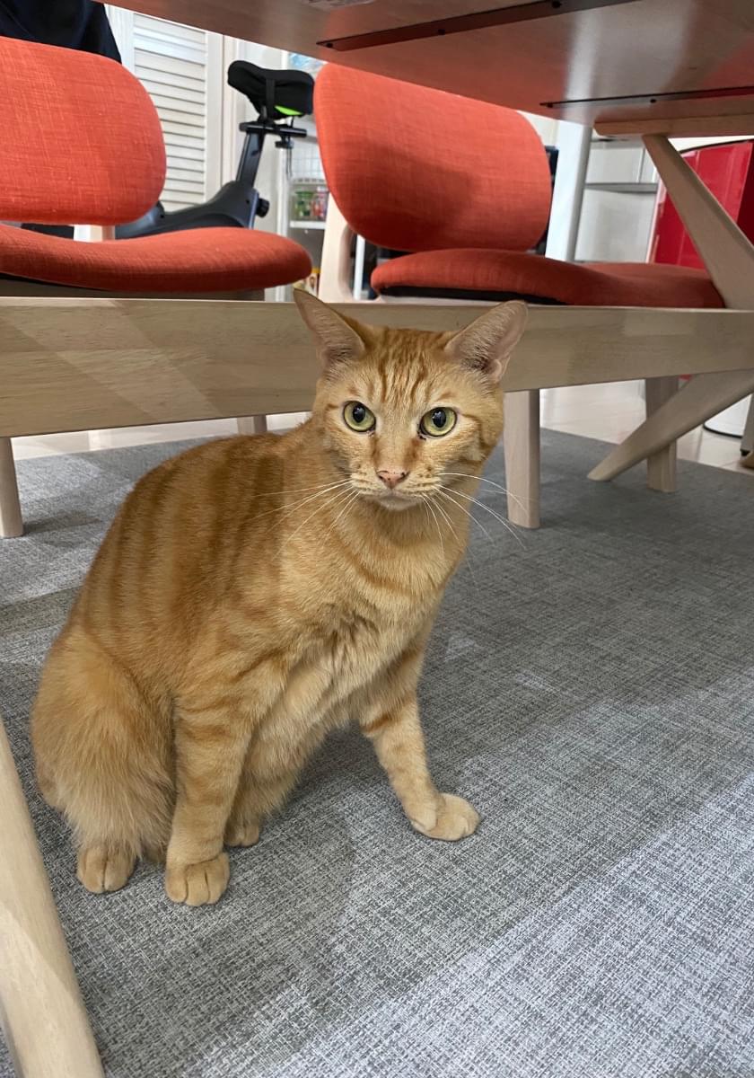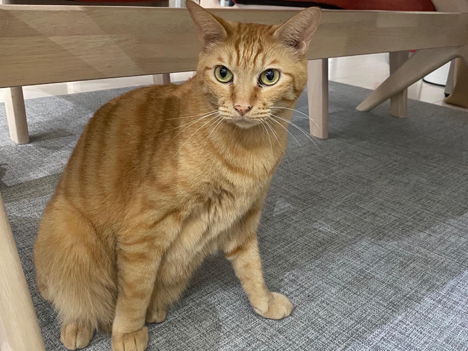 茶トラのオスで尻尾の先が少し曲がってます。首輪はしていません。鳴き声は枯れ声です。目はイエローです。性格は臆病なほうです。