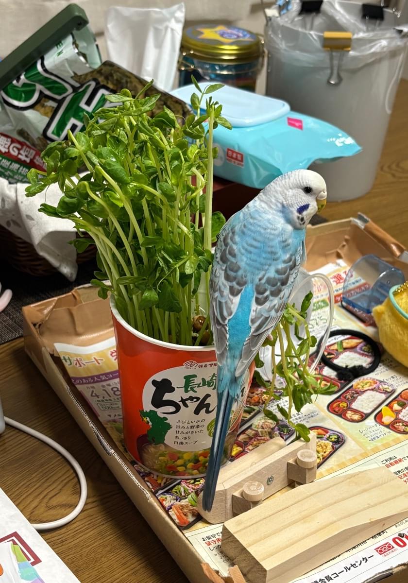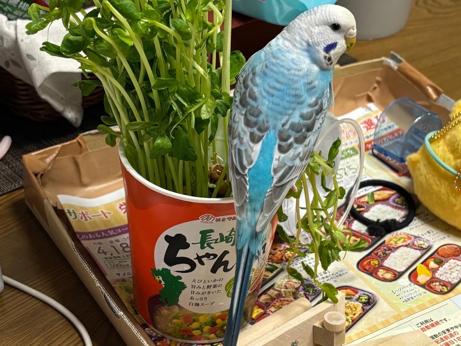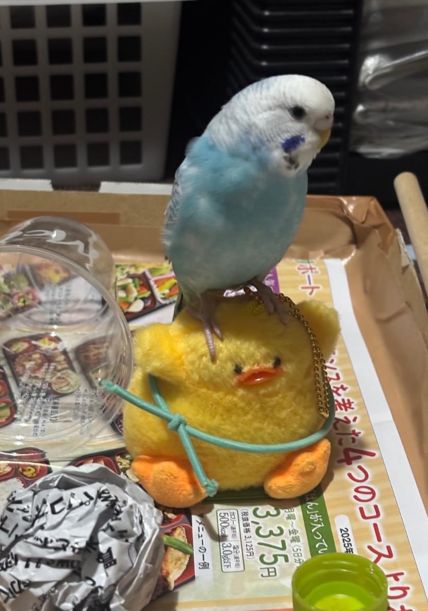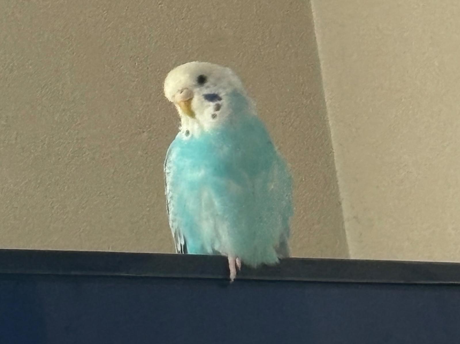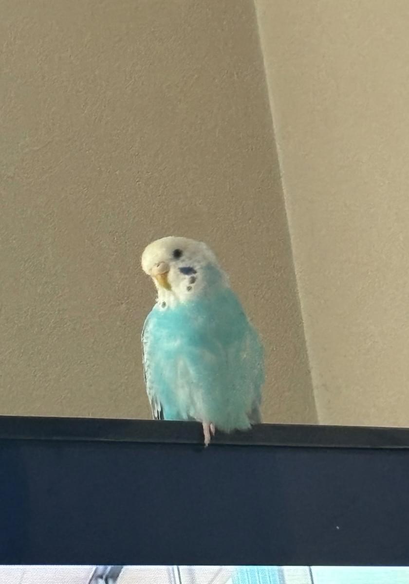 目撃者さん求む。水色のセキセイインコを探しています。家出しちゃったのは、2025/10/25(土)強風の日。特徴は、頭が白。胴体が水色。頬の斑点が両サイドで5個。背中に黒の斑点で真後ろから見るとローマ字のUの模様があります。性格は、すごく臆病ですがむちゃくちゃ人懐っこいです。