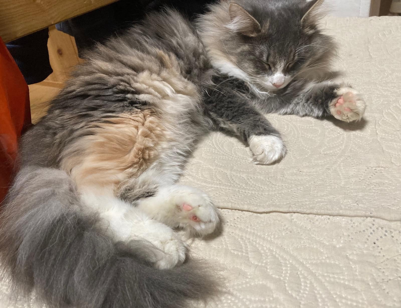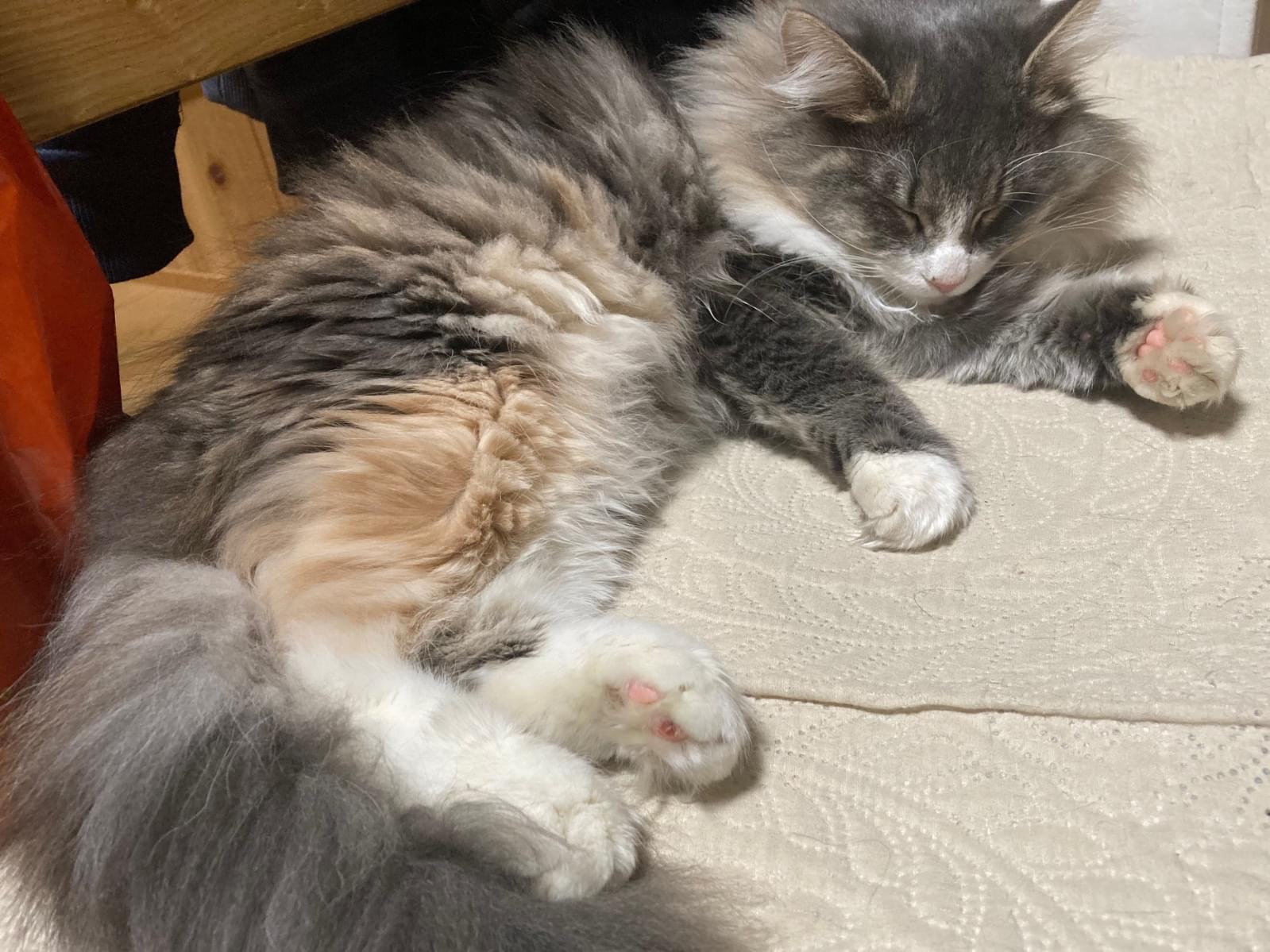 グレー、白、薄い茶色のミックスの毛色で左脚裏の踵のみ黒い毛色です