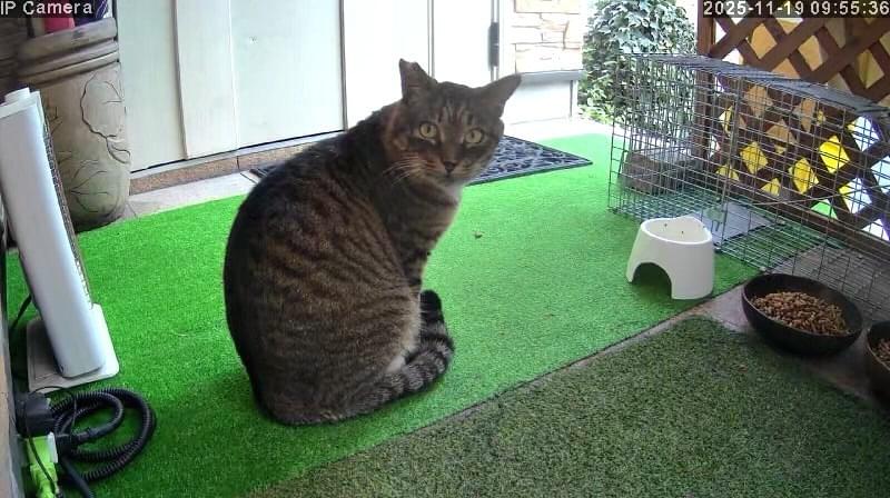 キジ白猫 特徴は4本脚の先 白、右耳カットあり、猫の鼻の下の割れ目は「人中(じんちゅう)白色。