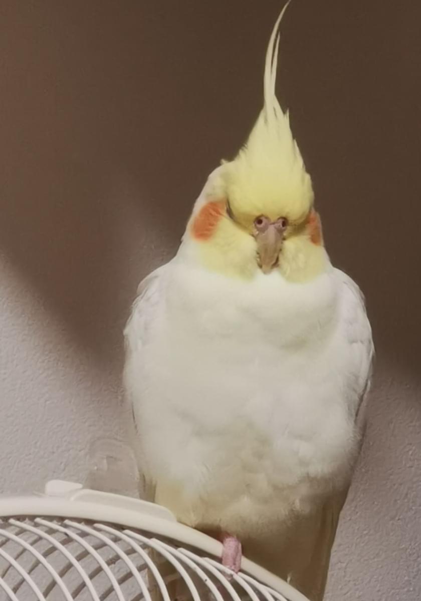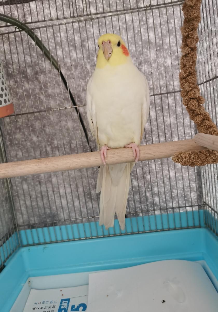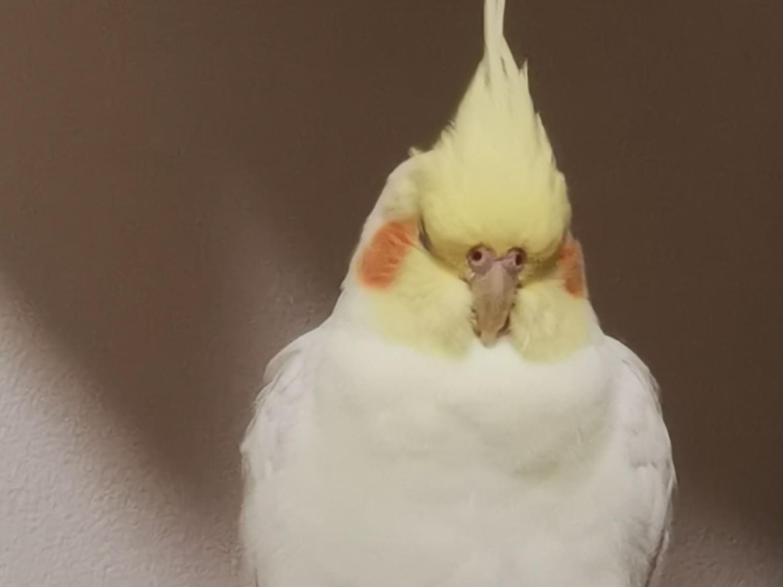頭は黄色、体は白、頬がオレンジのオカメインコのルチノーです。