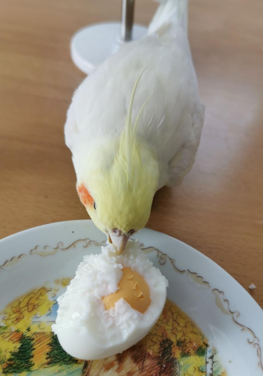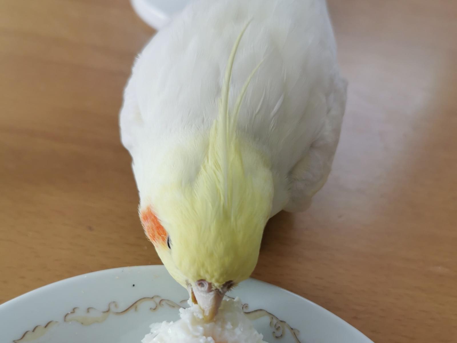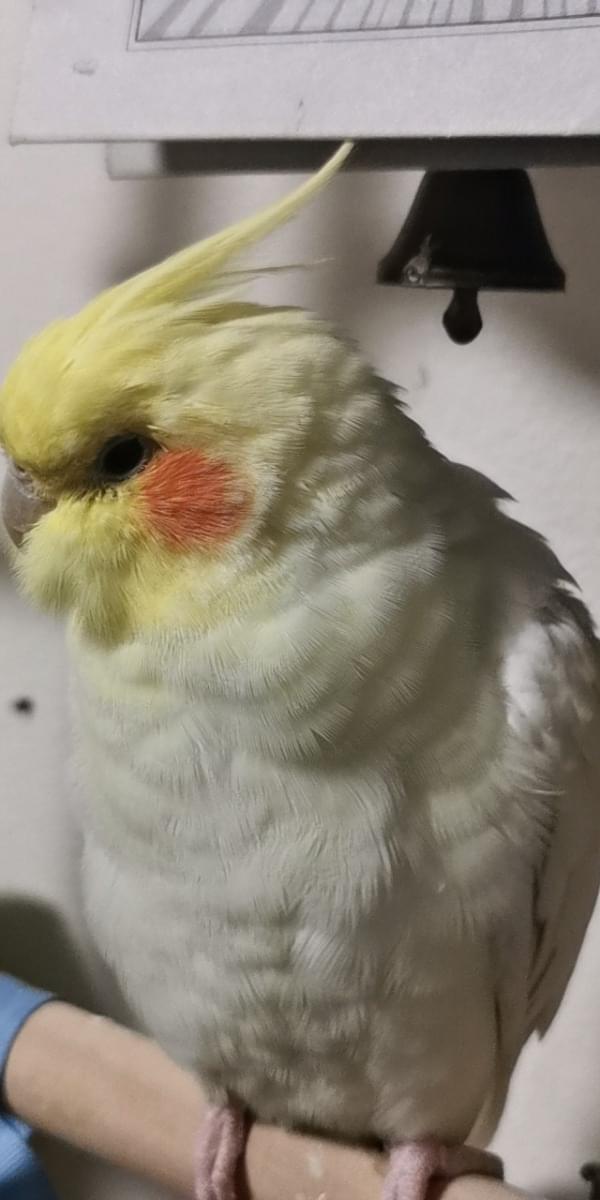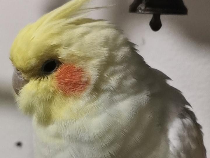 頭は黄色、体は白、頬がオレンジのオカメインコのルチノーです。