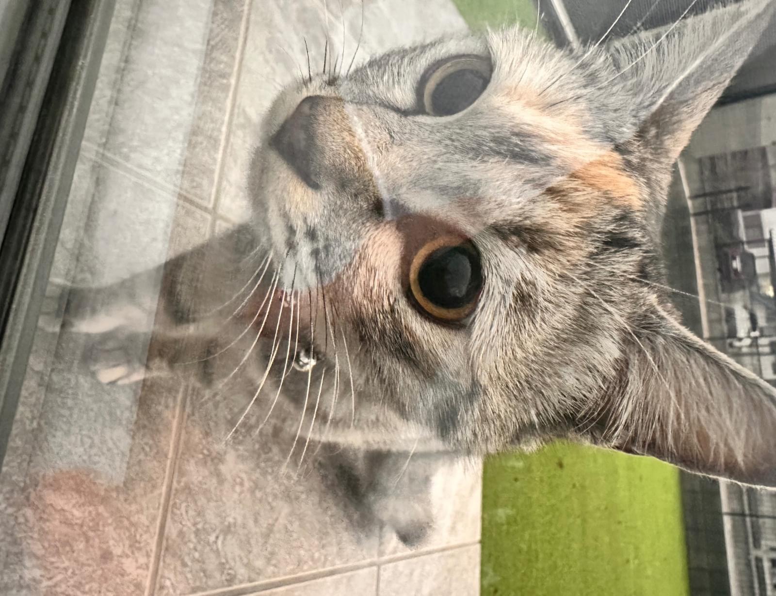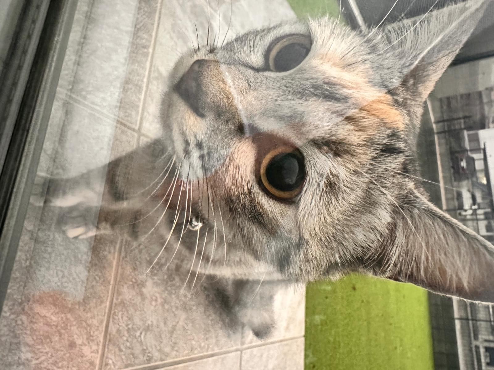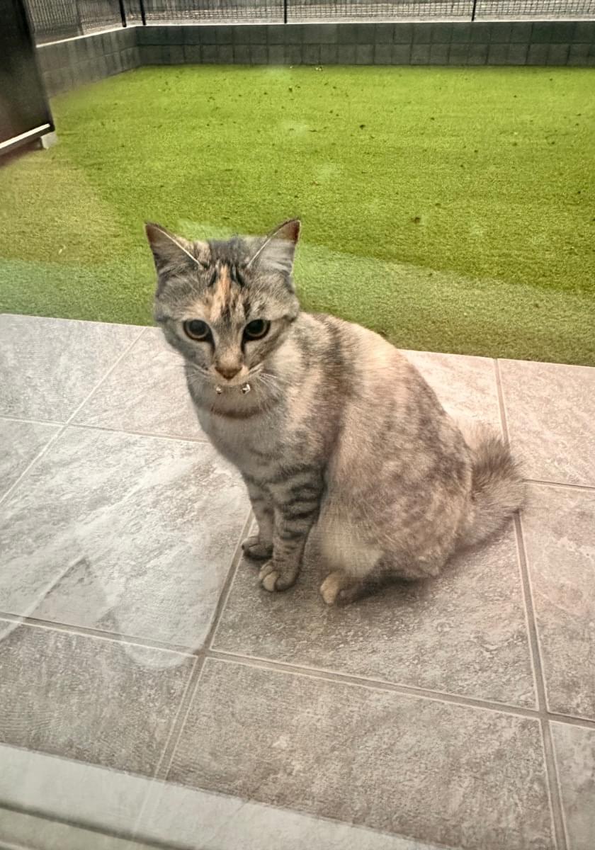 グレーぽい毛色の迷子になっている猫を見かけました。鈴が2つついたピンク色の首輪をしていました。