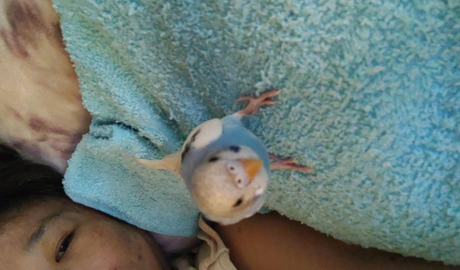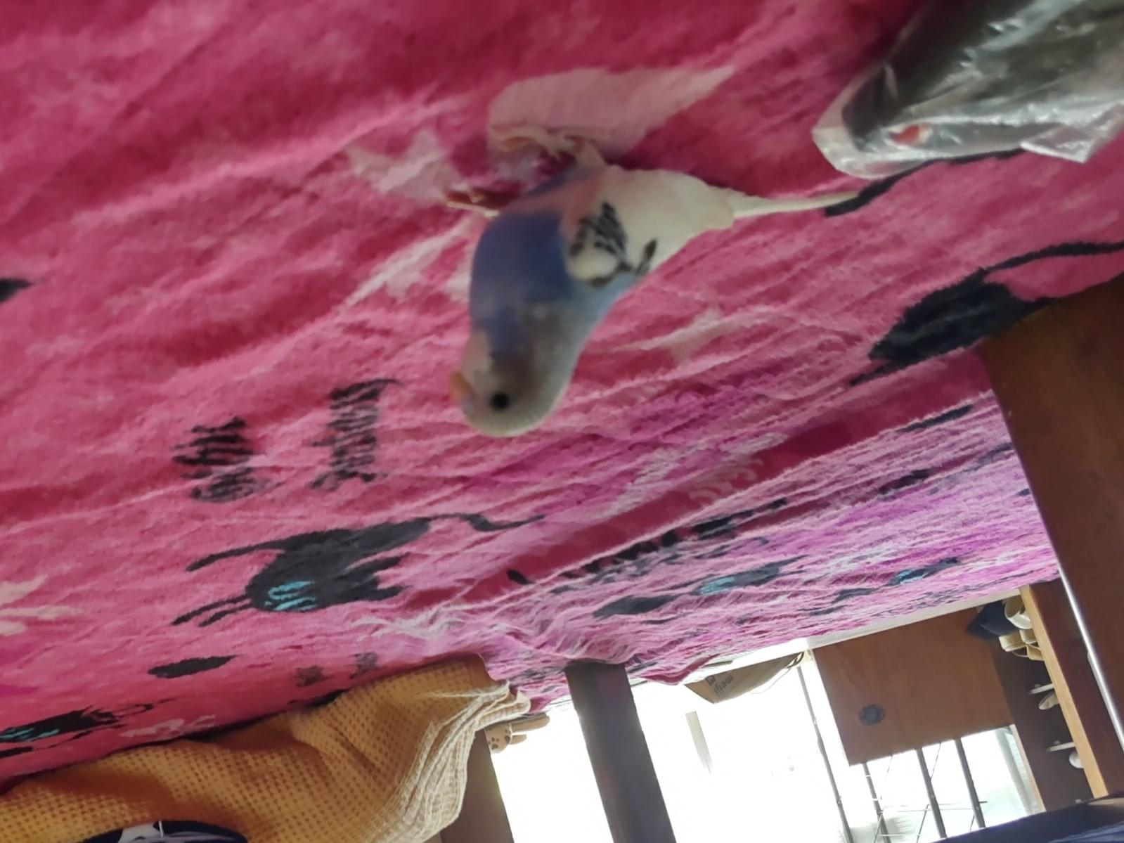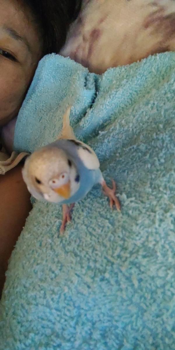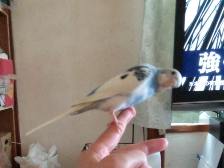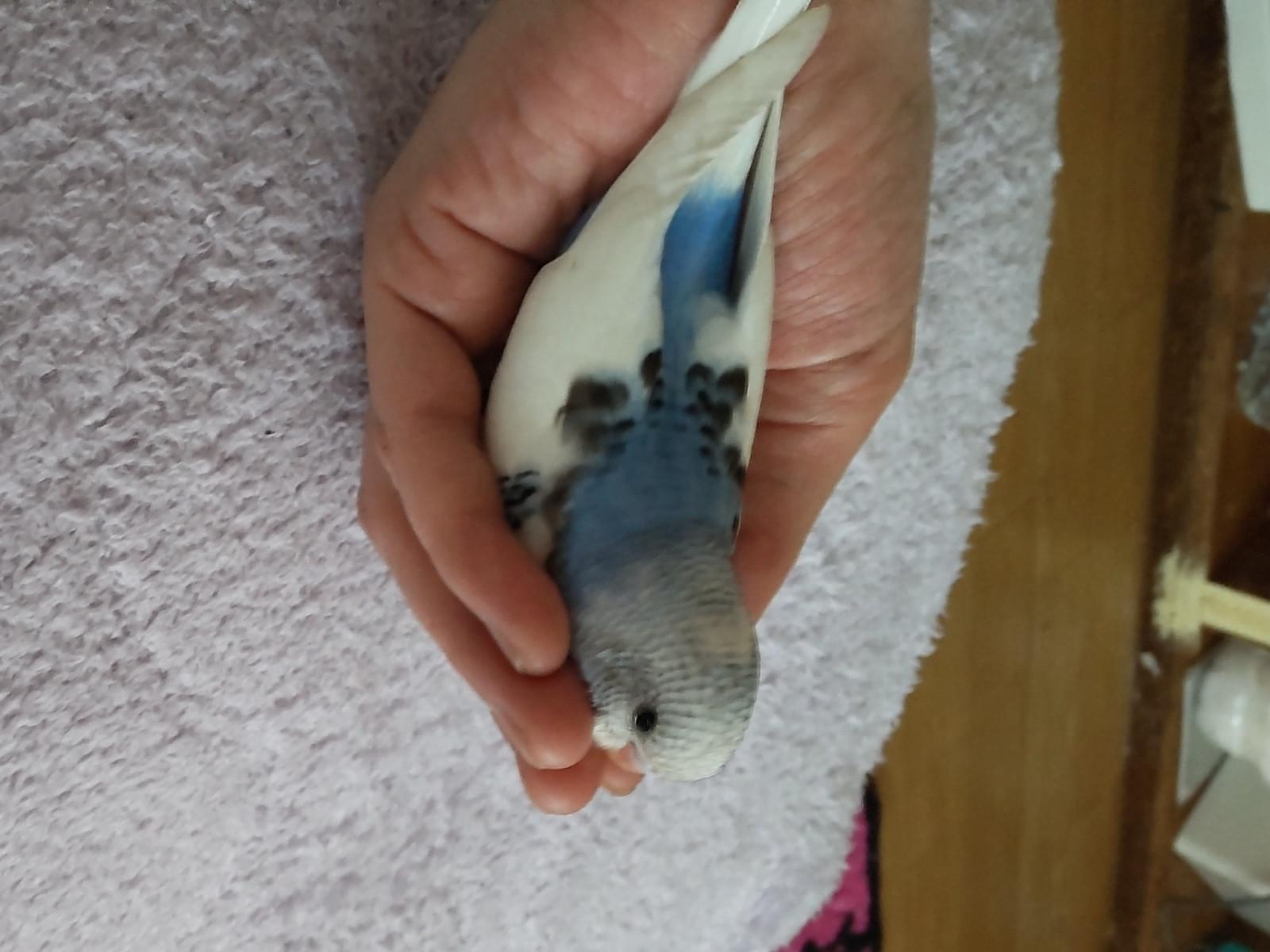 白と水色の綺麗で可愛いセキセイインコのテンテンです。