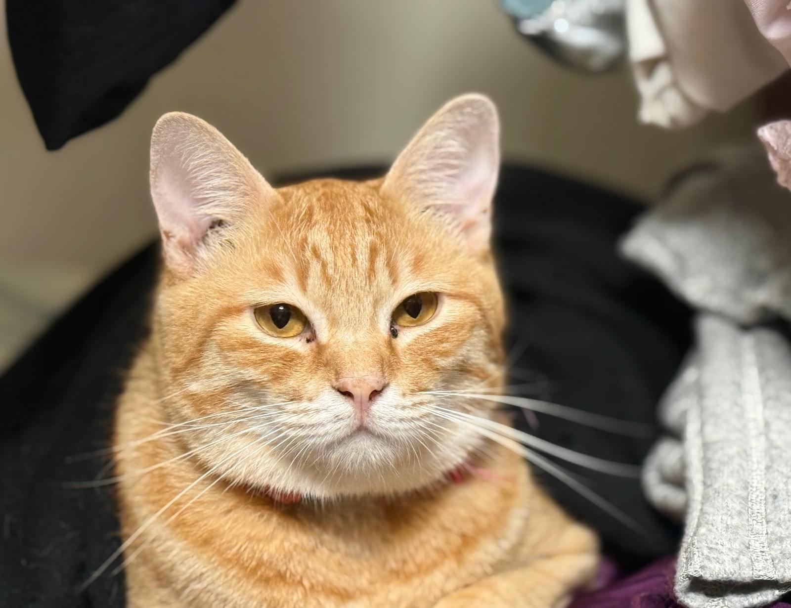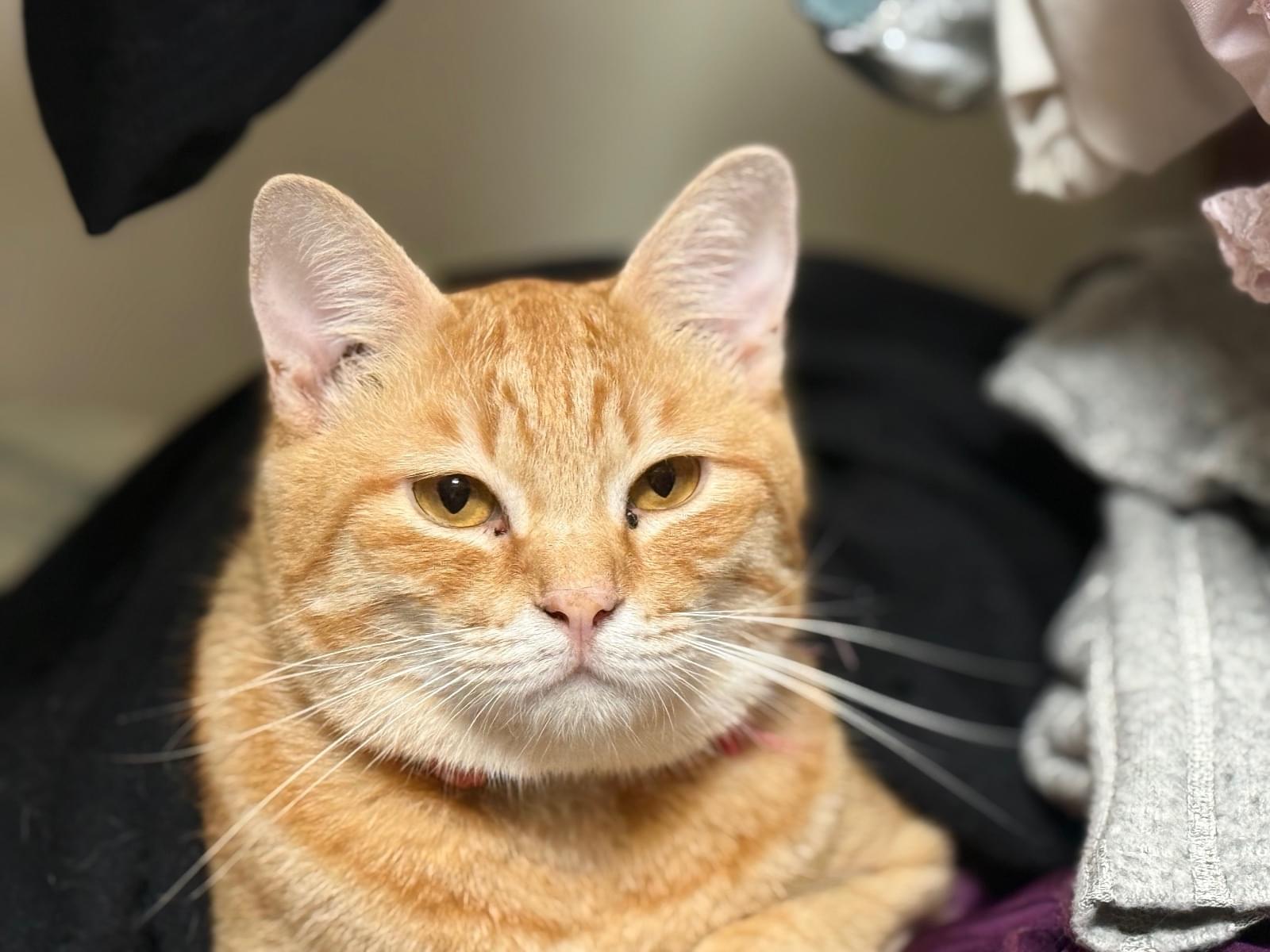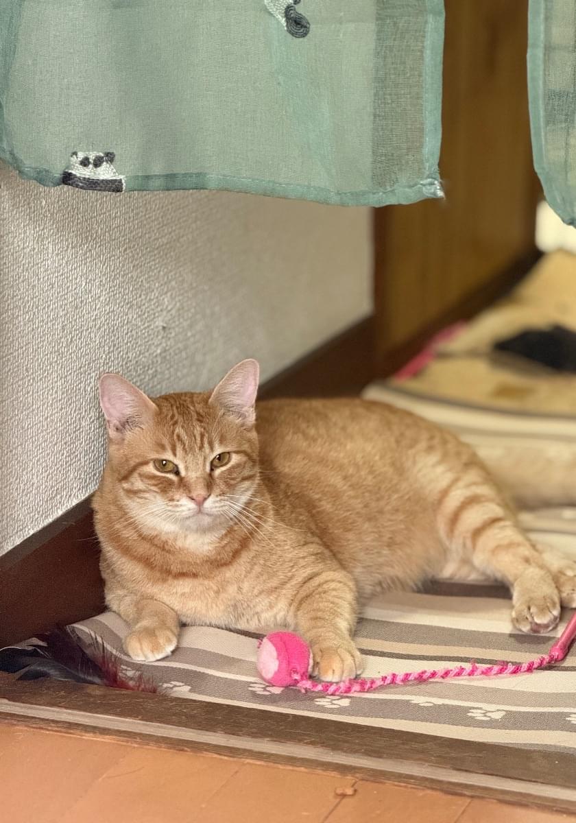 ピンク色の首輪をしており、全身茶トラ顎付近のみ白っぽいです。