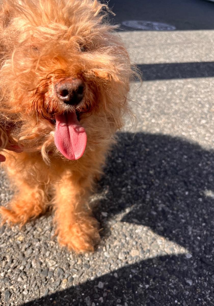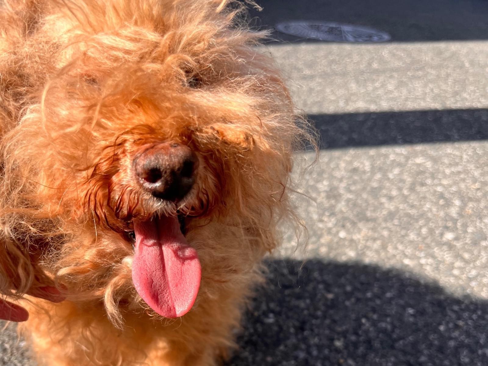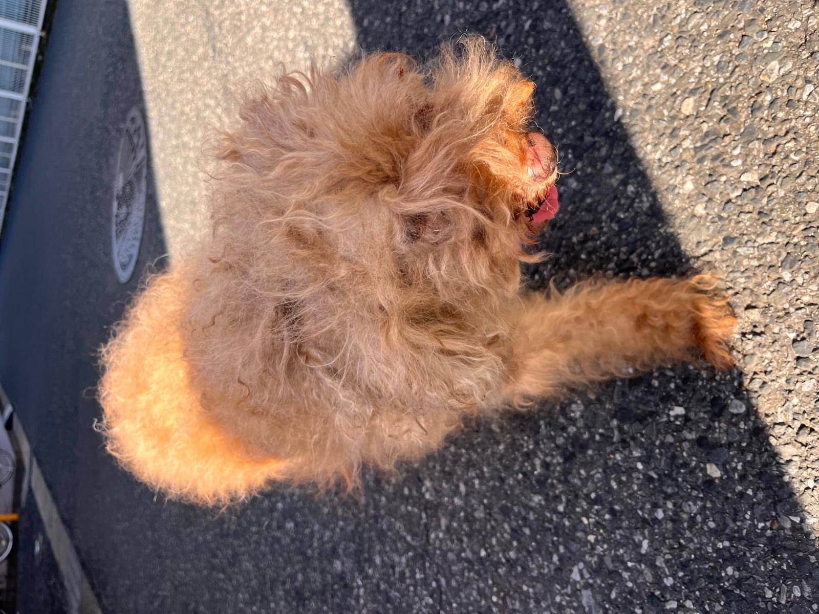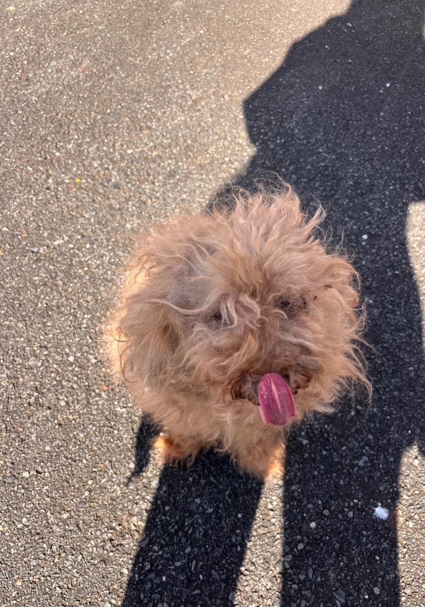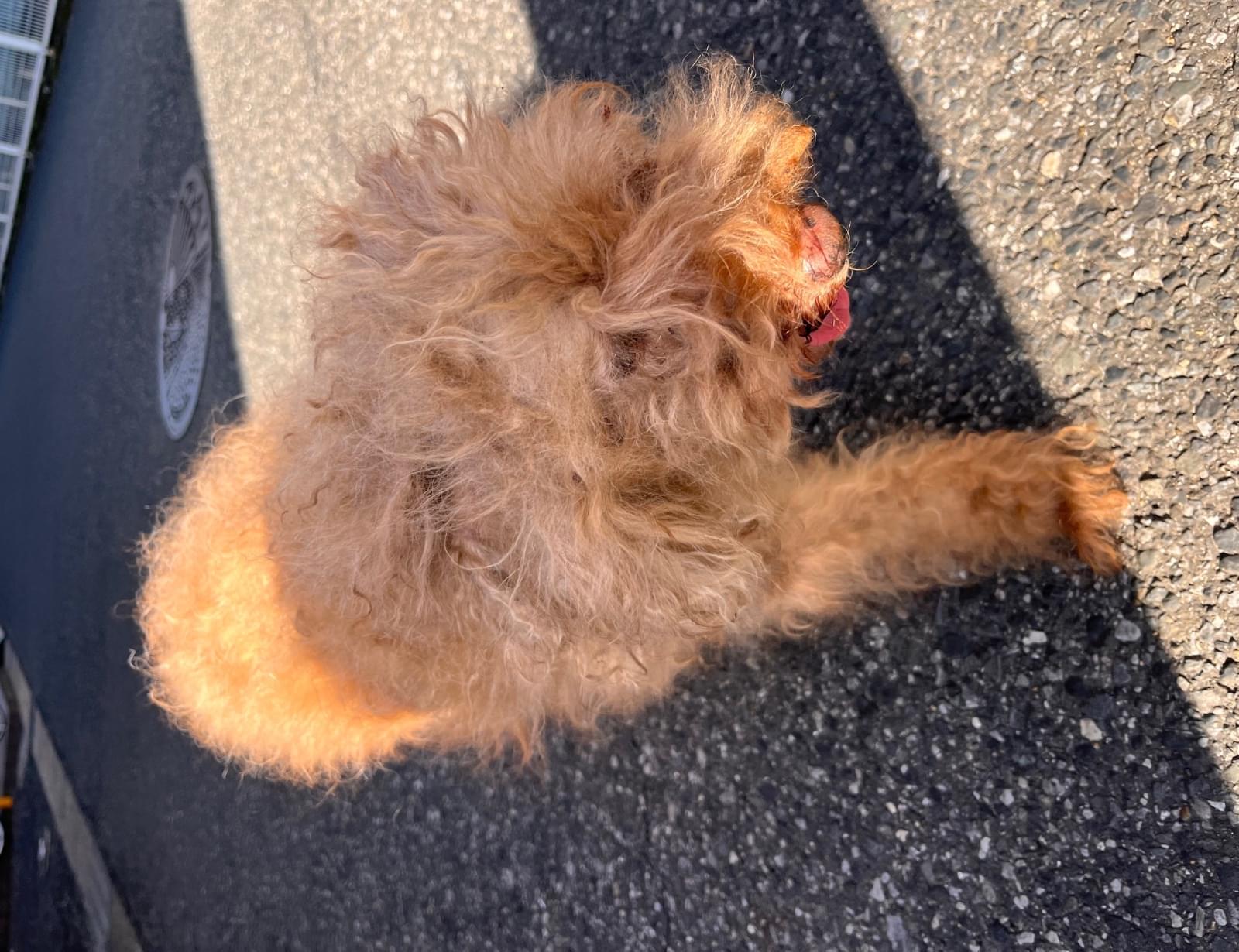 茶色のプードルで、毛は伸びてところどころ毛玉があります。