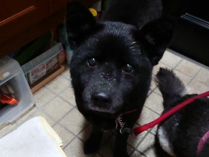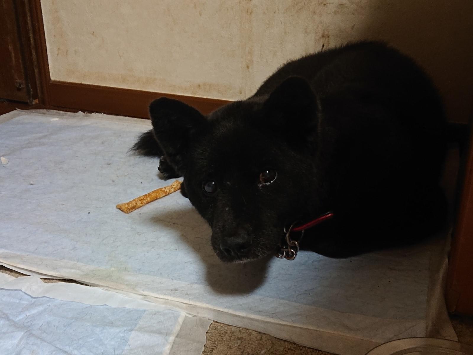 黒色で胸元に白い毛が少し。赤い首輪に古い狂犬病の鑑札が付いていました。