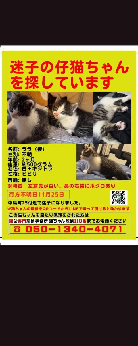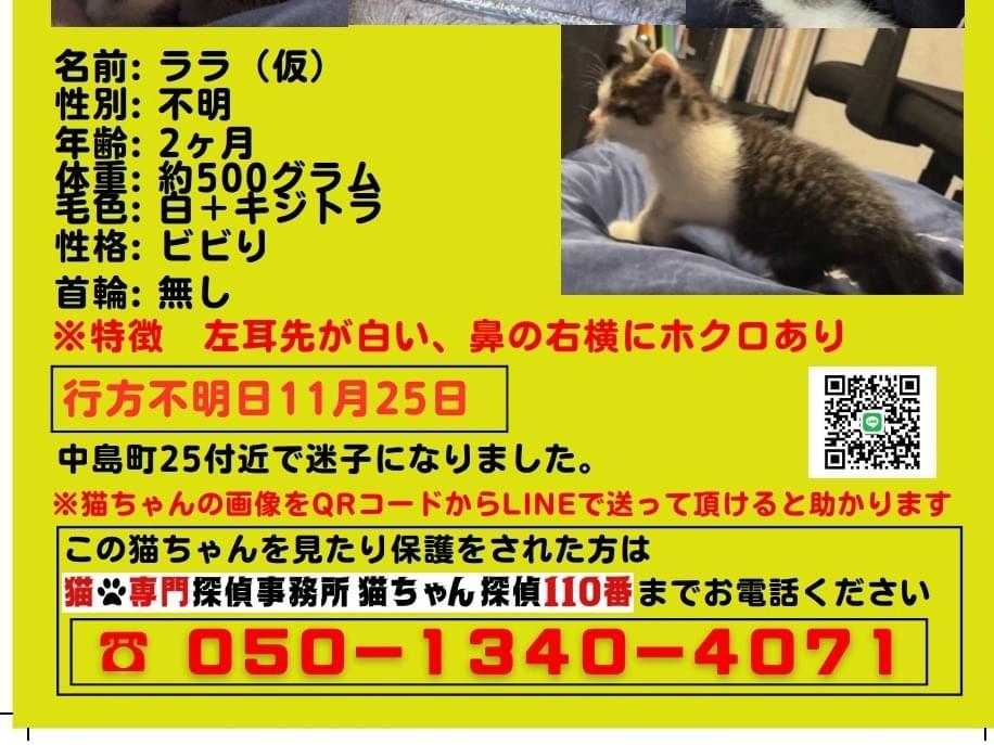 ホーム迷子猫愛知県左耳が白く、鼻の右横…左耳が白く、鼻の右横にホクロありのキジ白です管理編集するポスター掲載終了最終更新日時:2025/11/26 23:26写真動画情報用件迷子名前ララ性別不明年齢生後1ヶ月場所愛知県 半田市中島町発生日時2025年11月25日(火)飼い主イトウ説明まだ小さく臆病です。首輪なし。人馴れもまだ出来てません。連絡先URL未設定掲示板情報交換のための掲示板です。ユーザーからの情報提供、オーナーからの連絡などにご利用下さいませ。書き込んだ情報は、オーナーのメールに通知されます。まだコメントはありません。トピックを作成する