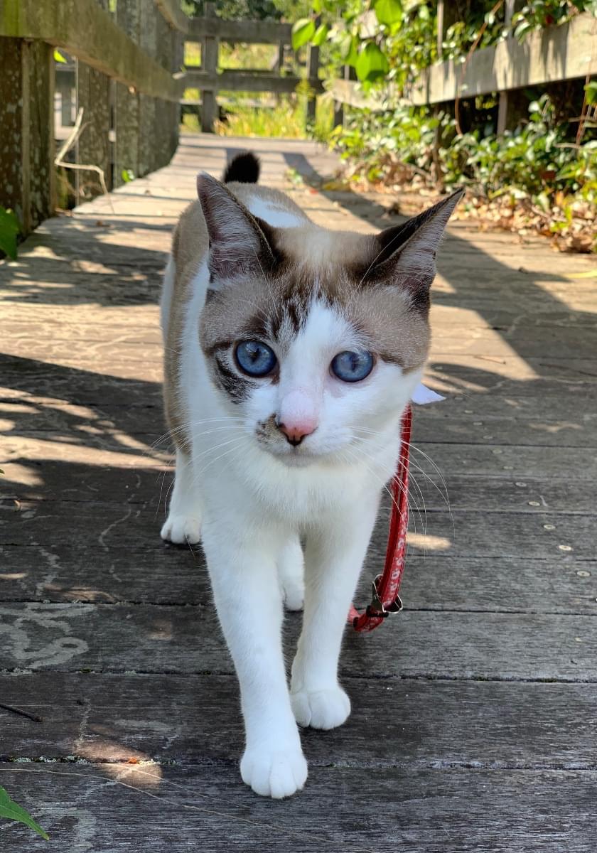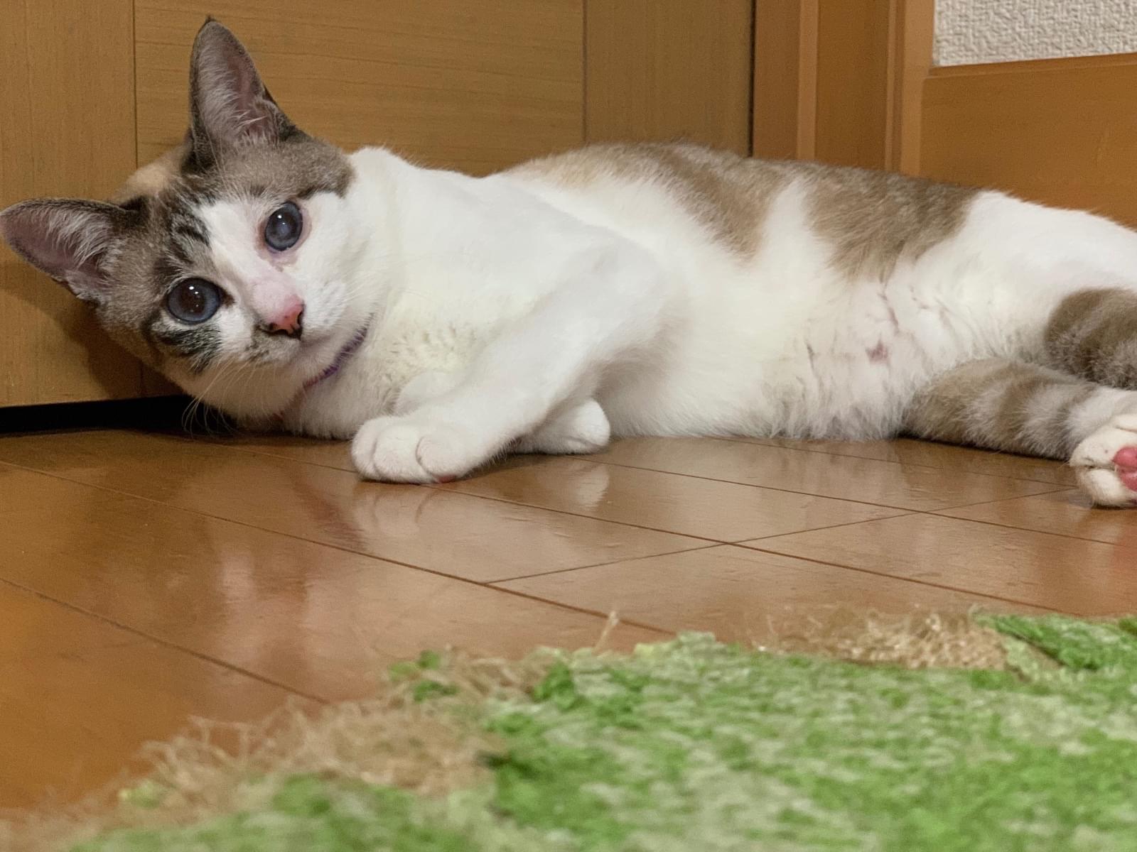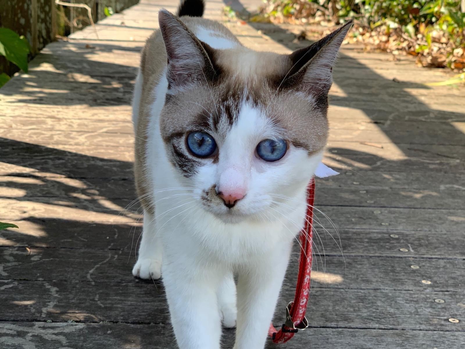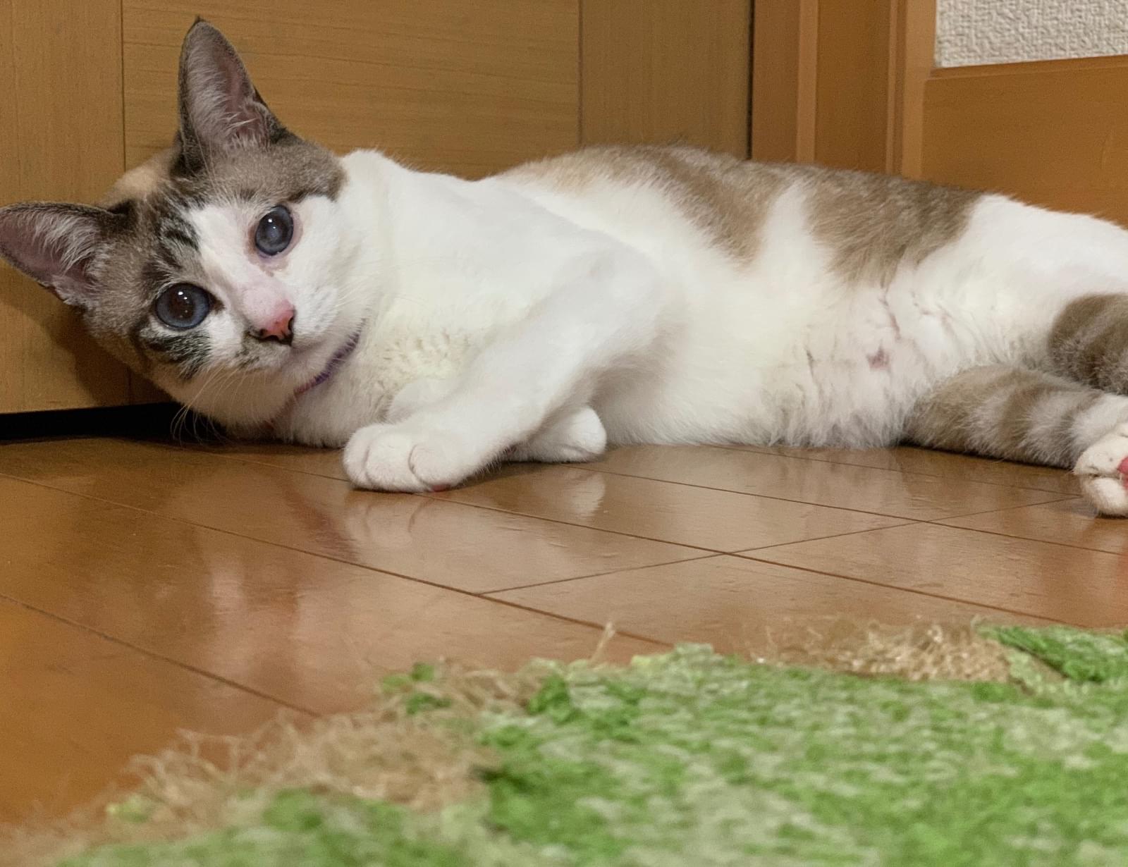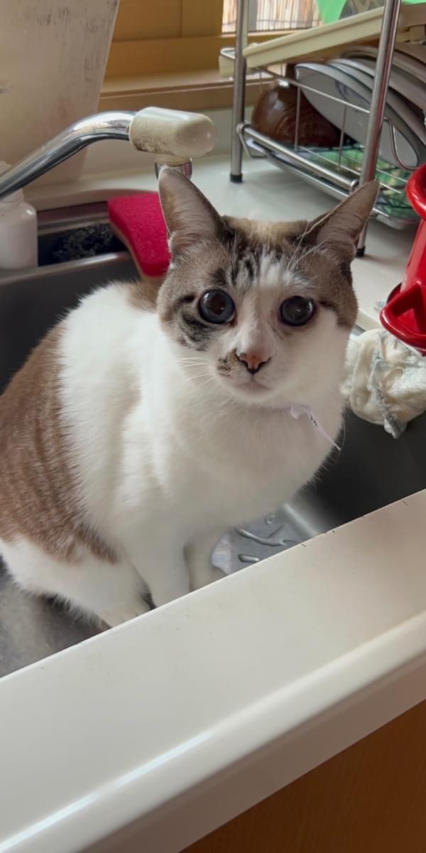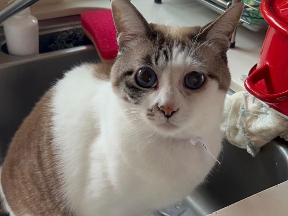 白➕茶色柄。目は青く、片方は白く濁っています。
