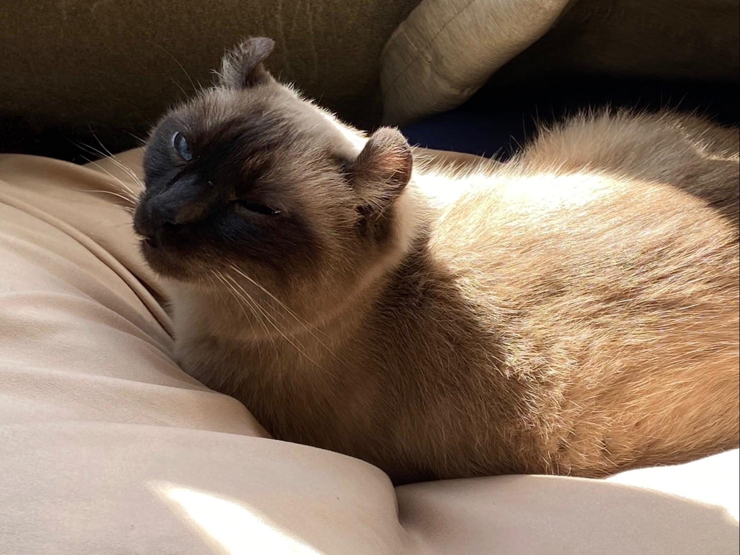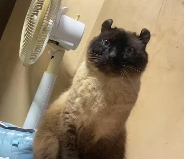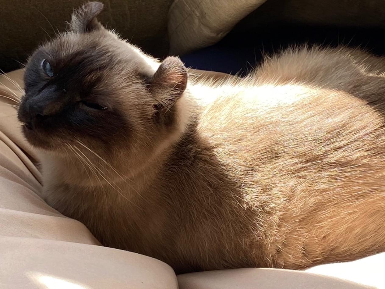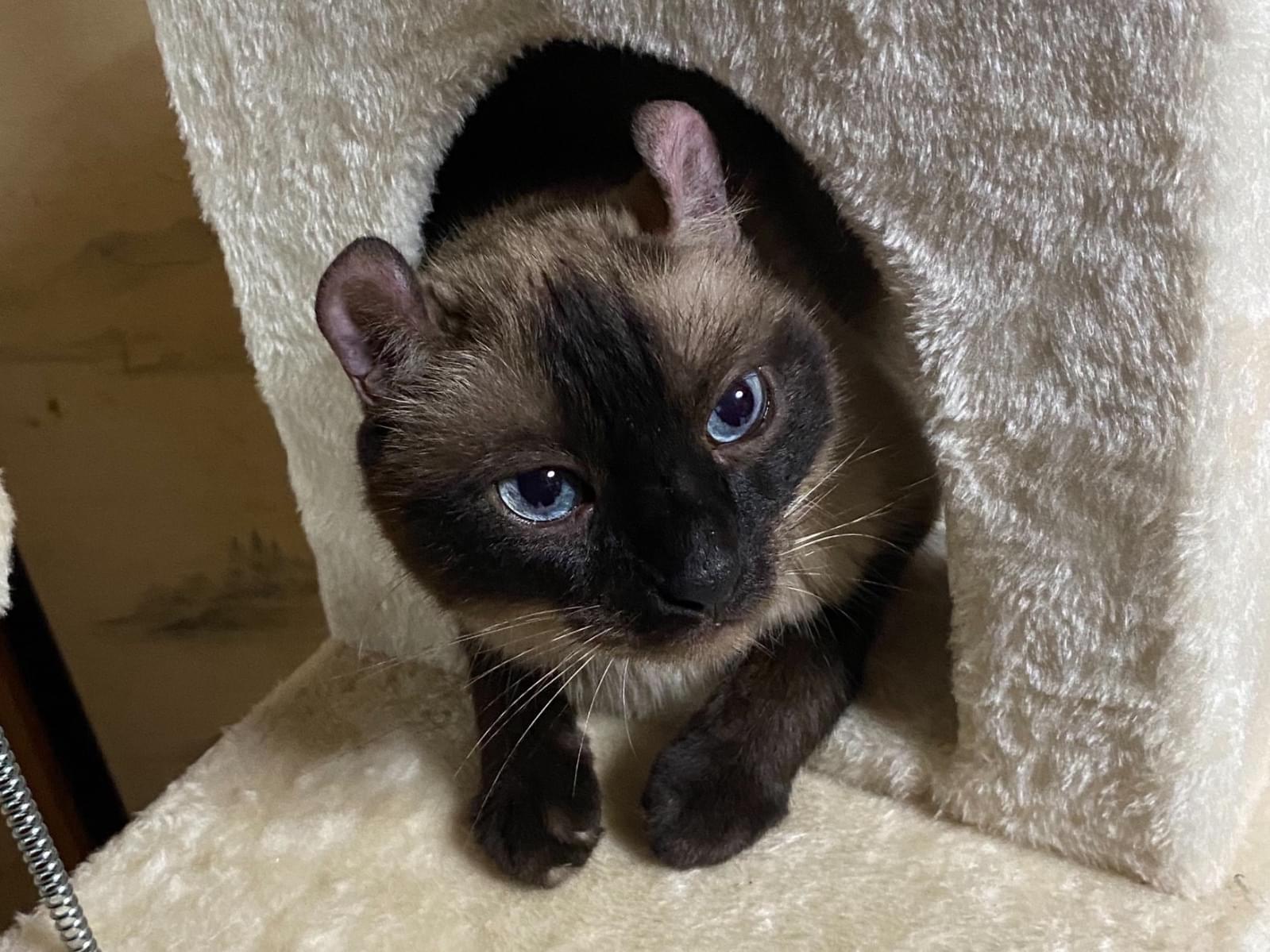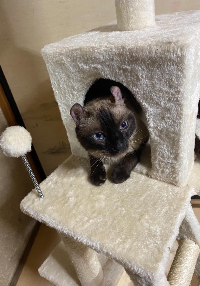毛色は、ベージュと黒(焦茶)のシールポイントで、顔、尻尾、耳、手足が黒、胴体、頭などはベージュです。