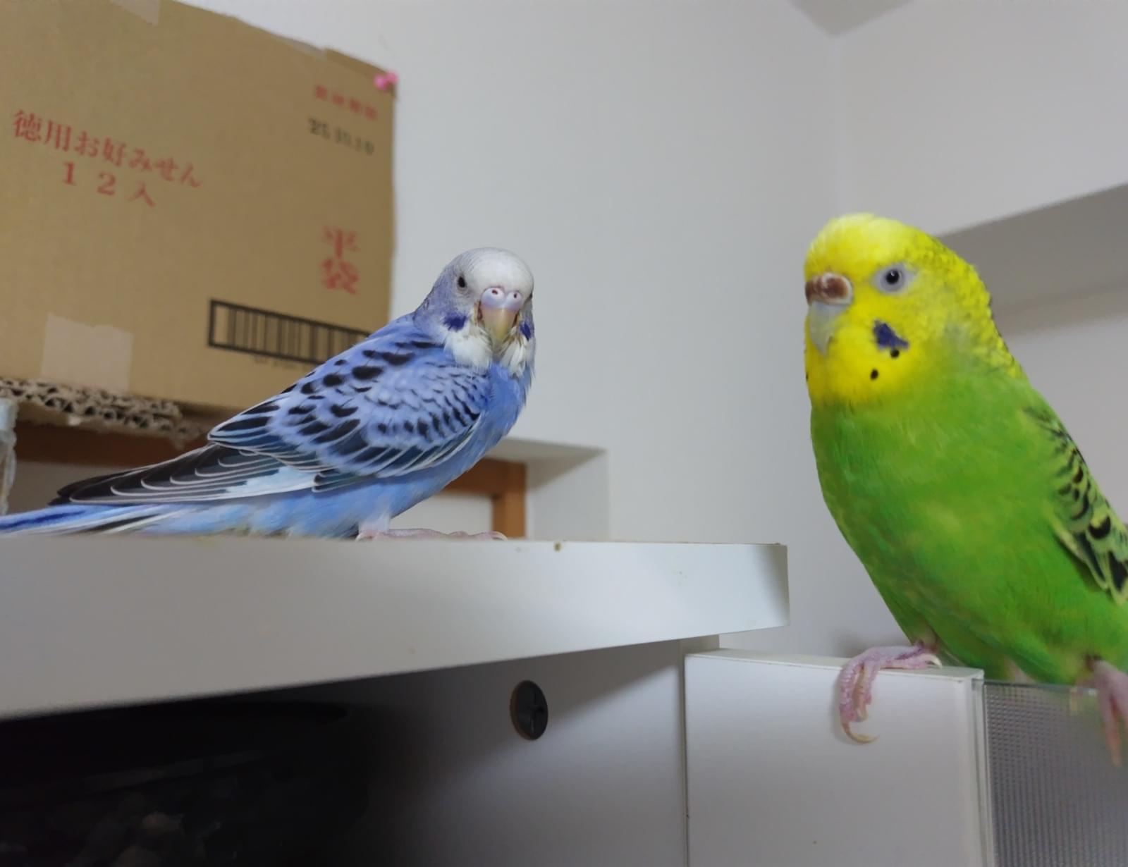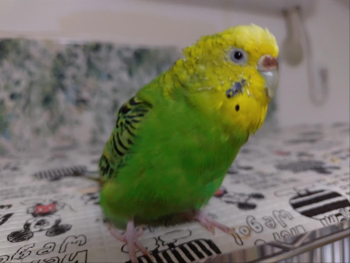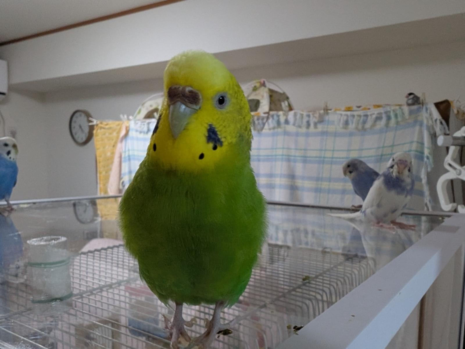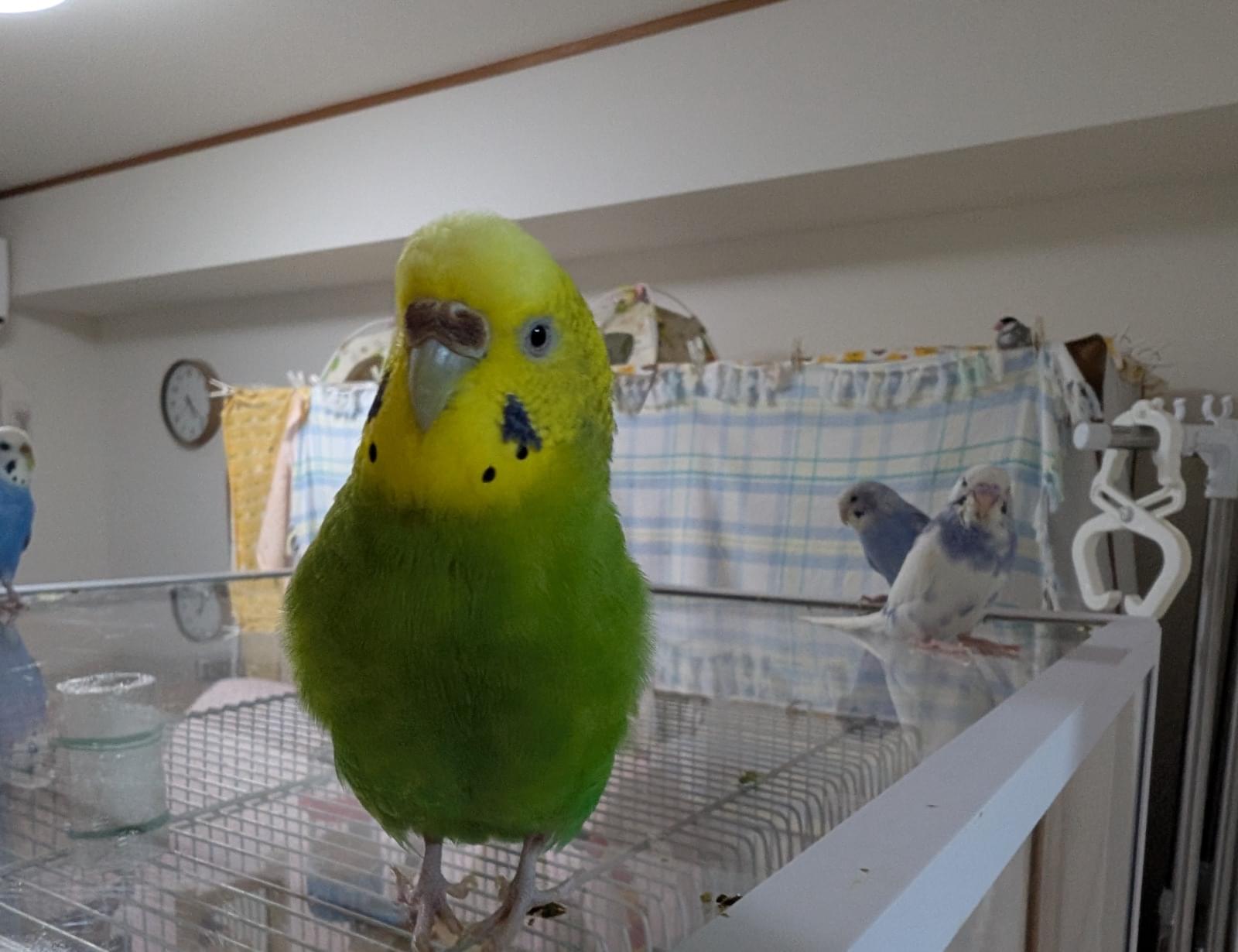 緑と黄色のセキセイインコで、『ミー』と左肩をたたきながら『ミー』と呼ぶと飛んできます。
