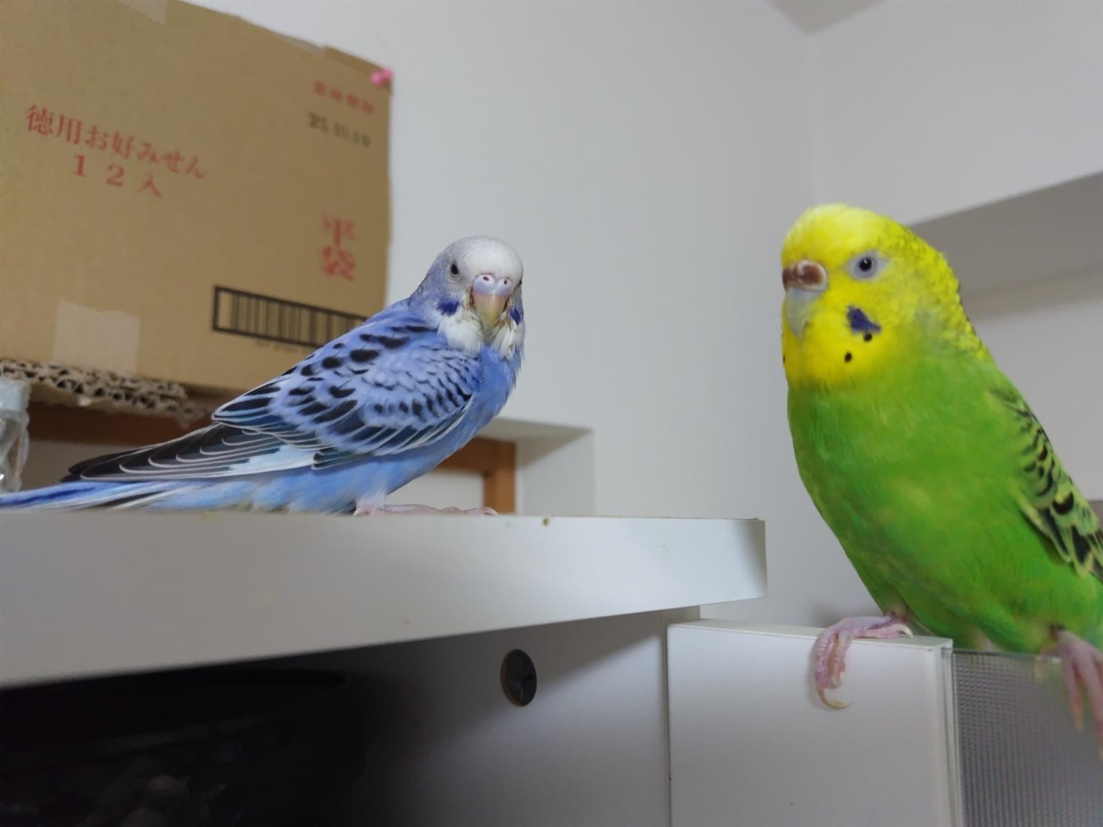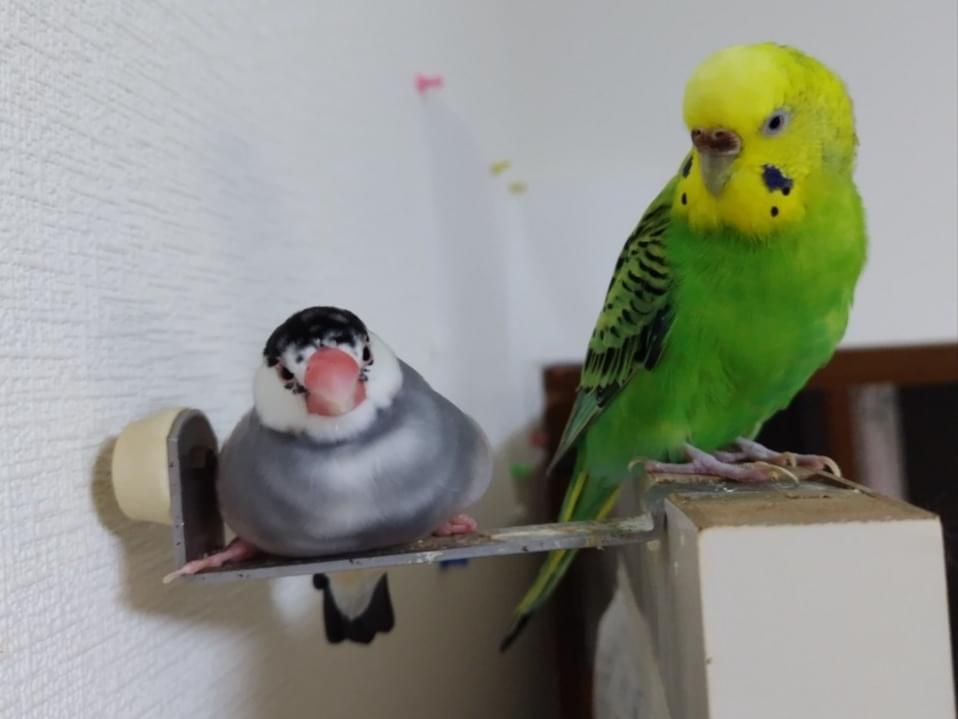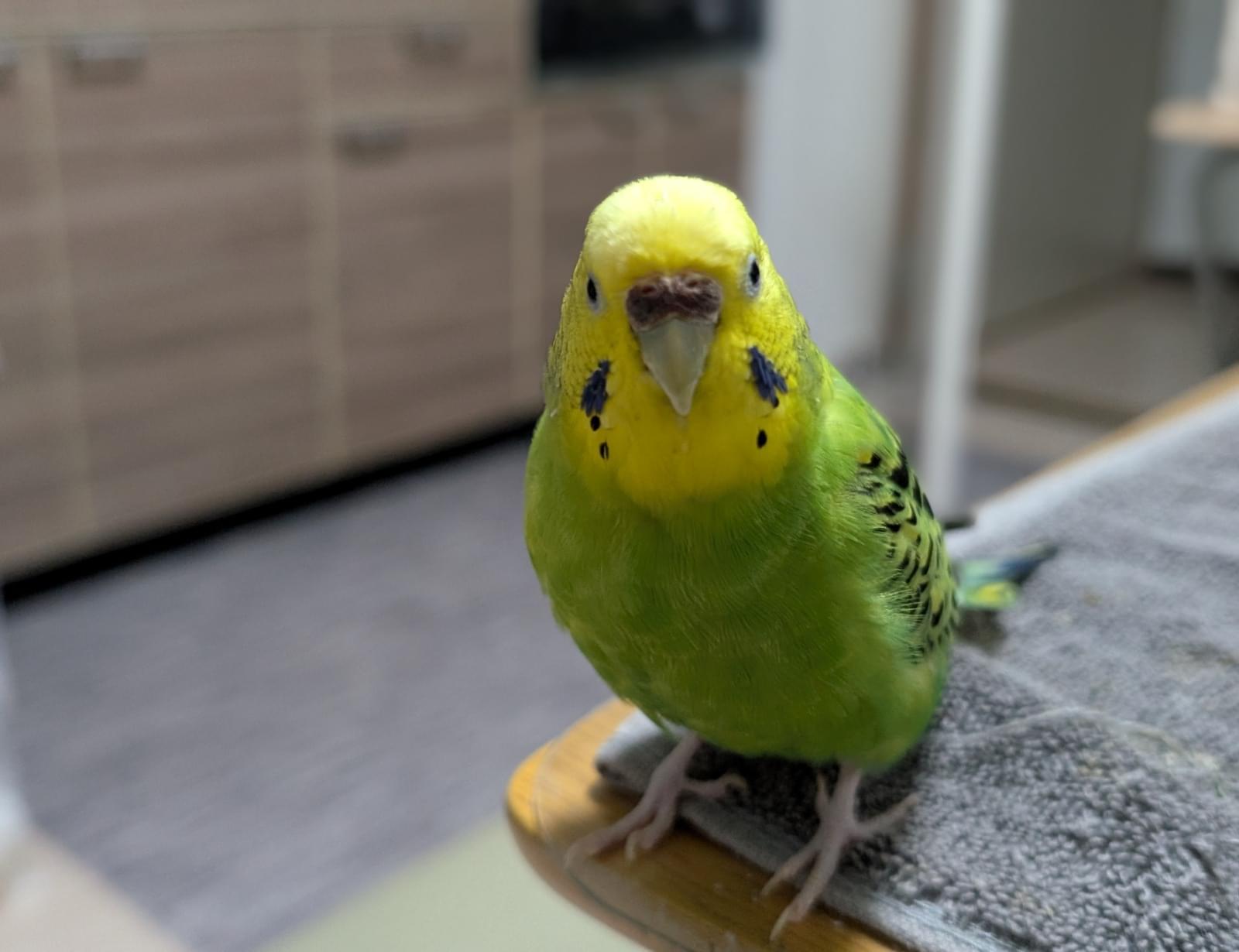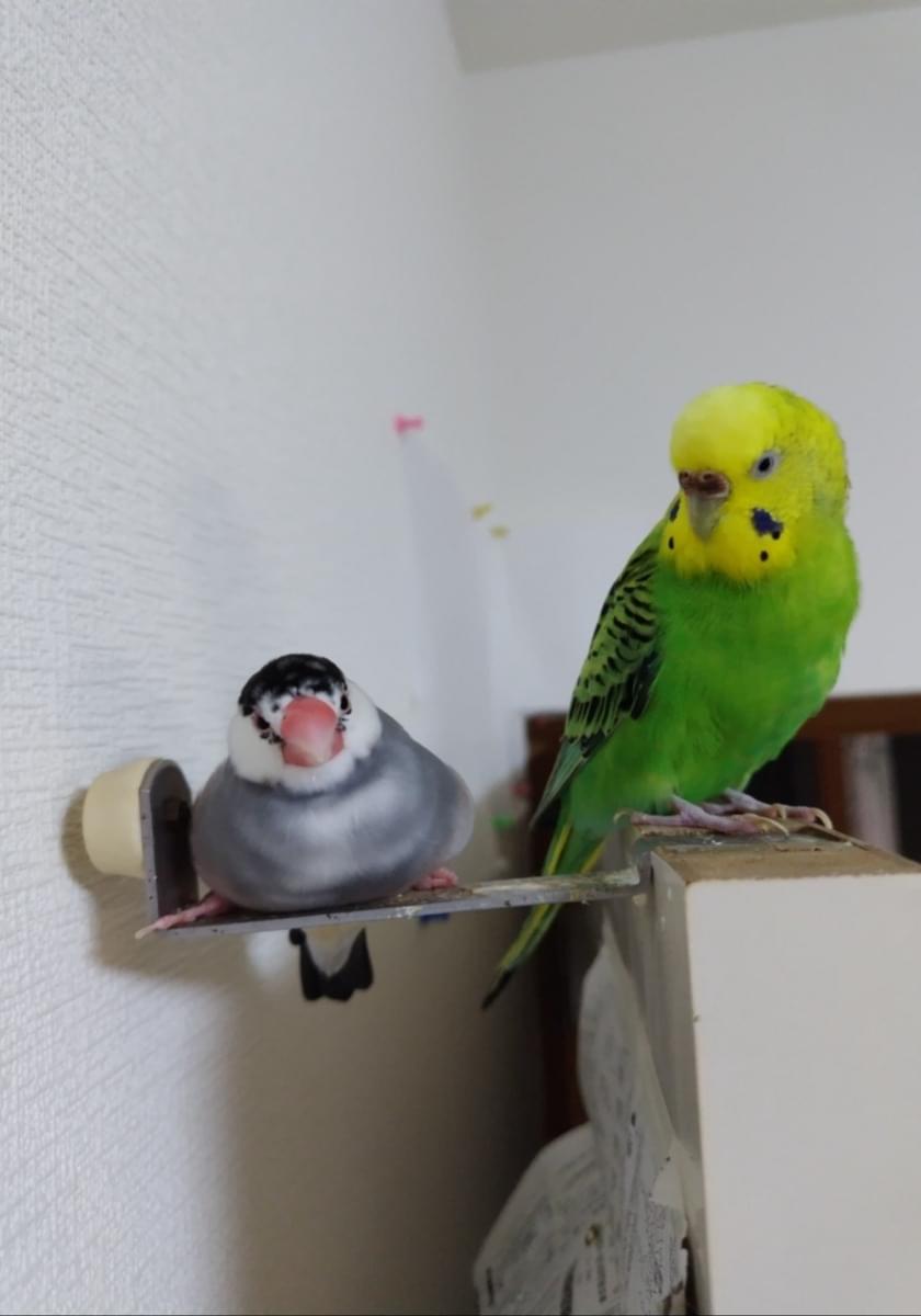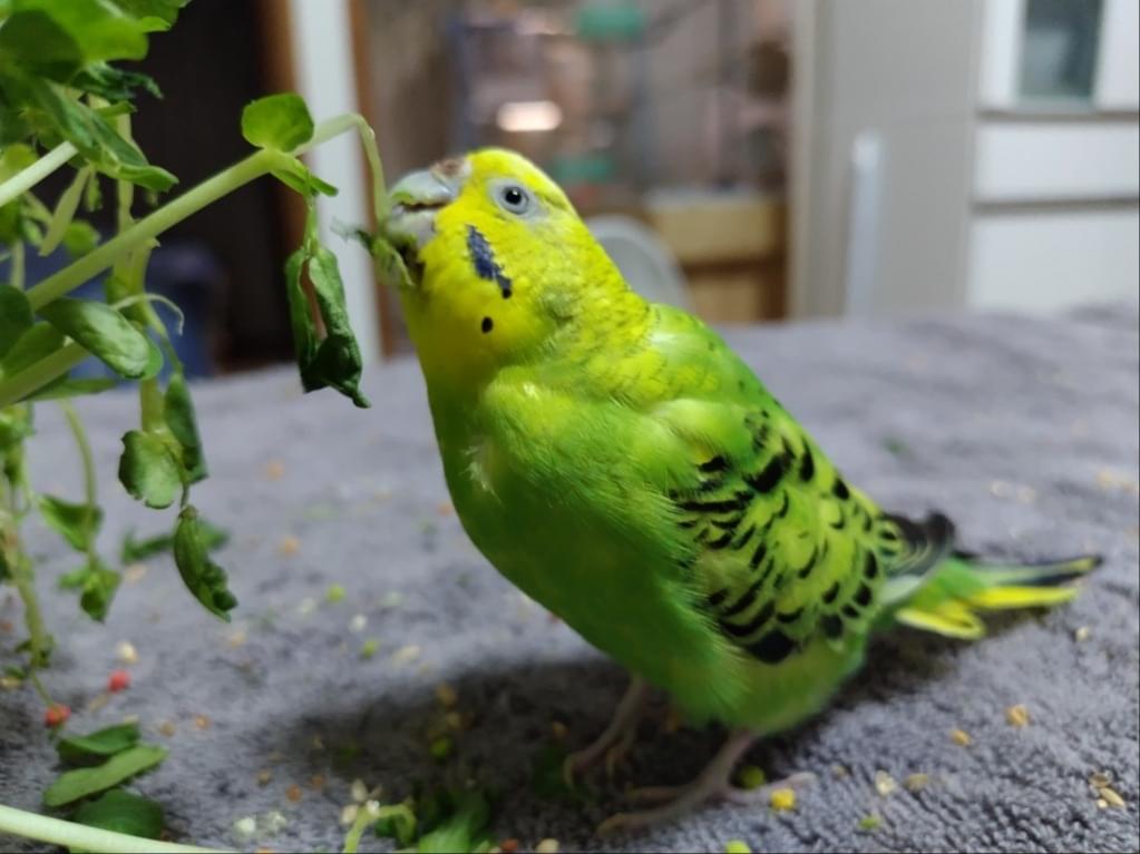 緑と黄色のセキセイインコで、『ミー』と左肩をたたきながら『ミー』と呼ぶと飛んできます。