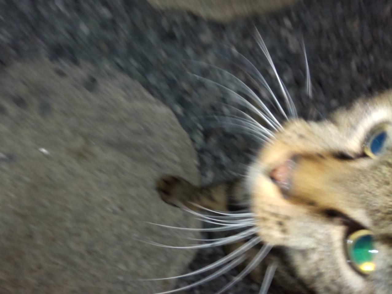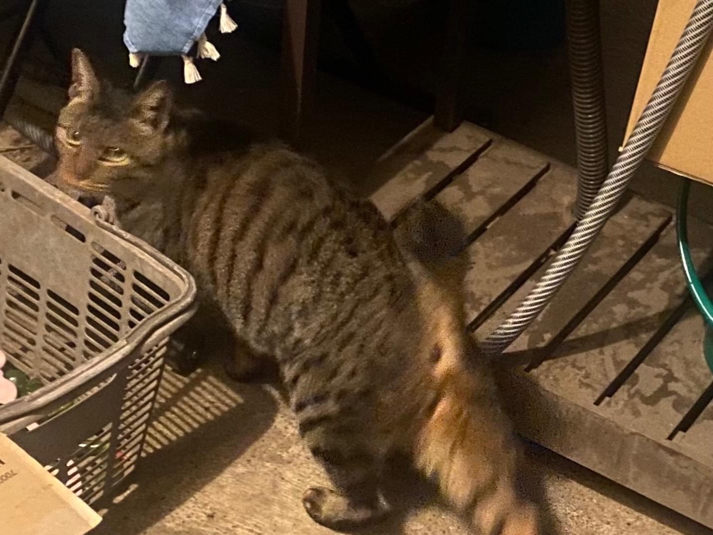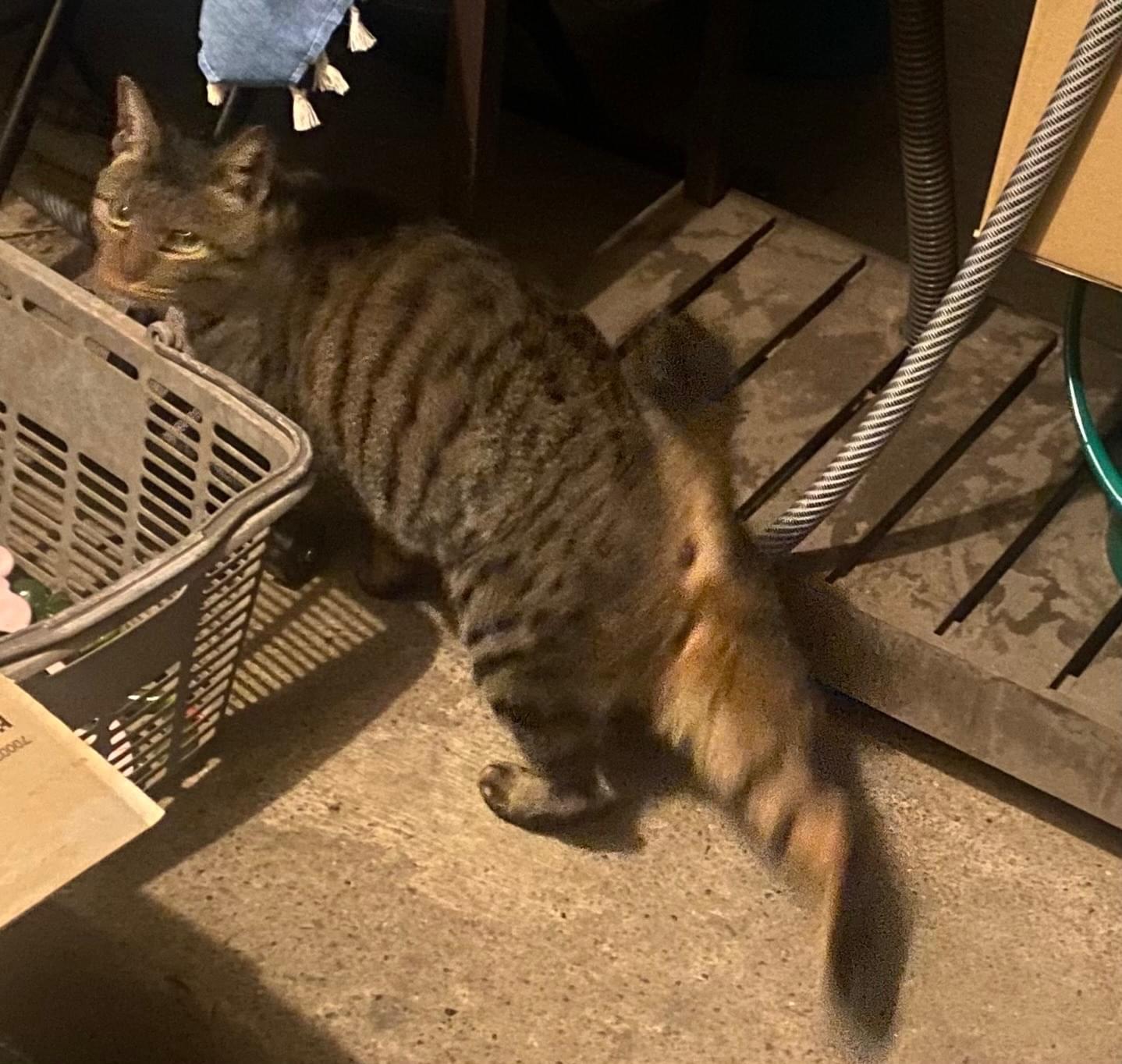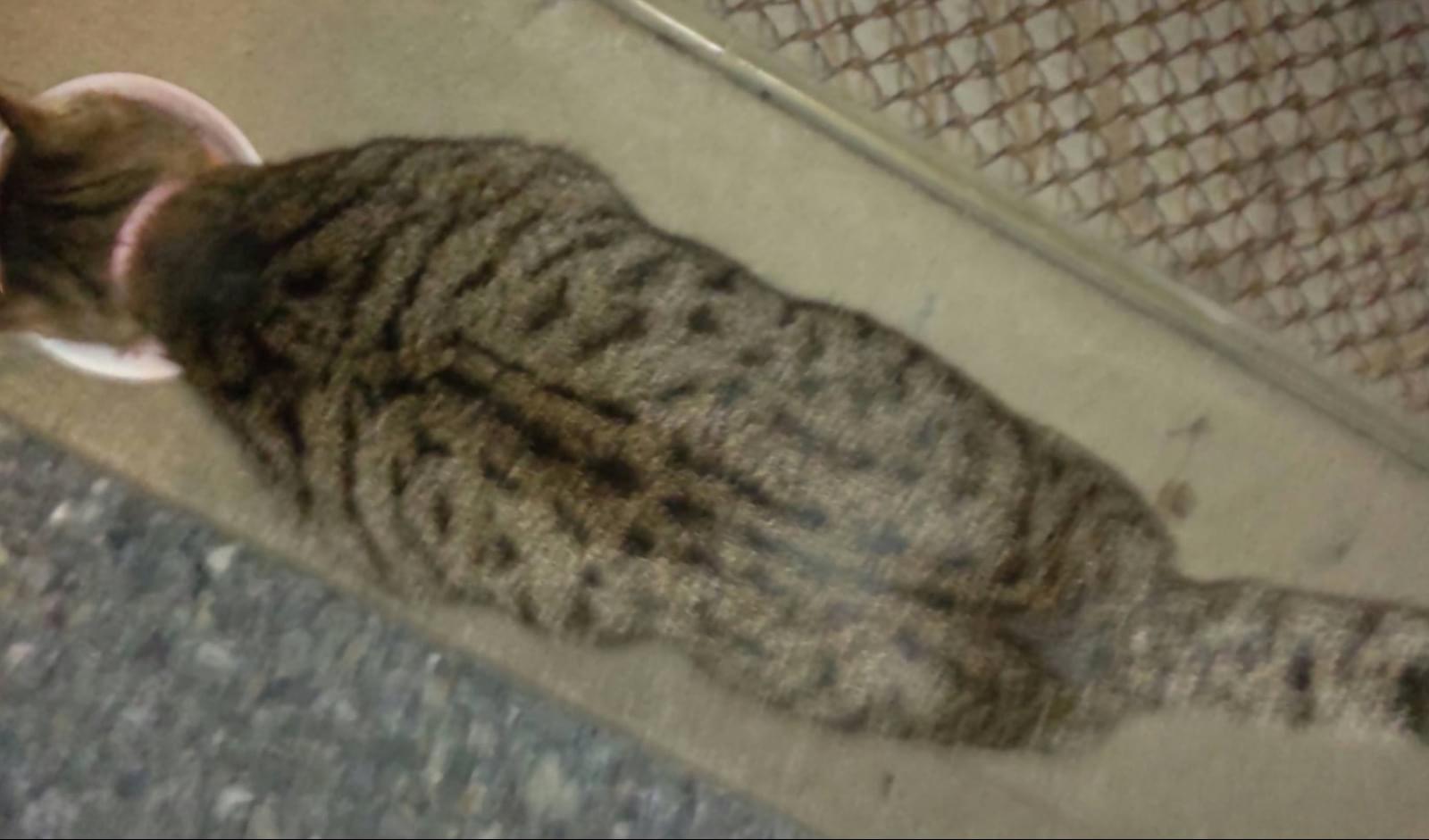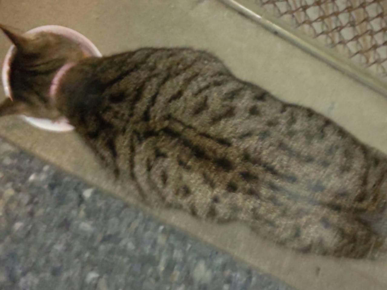 キジトラ、成猫、尻尾まっすぐ先端折れ、耳カットなし?、首輪ピンク?オスメス不明です。