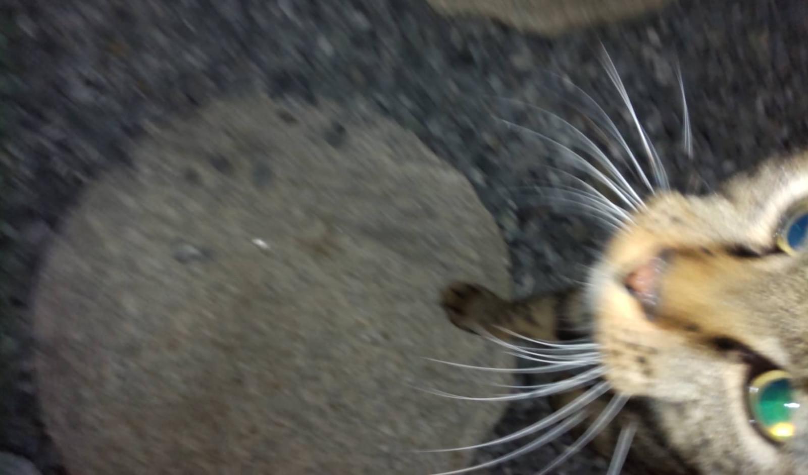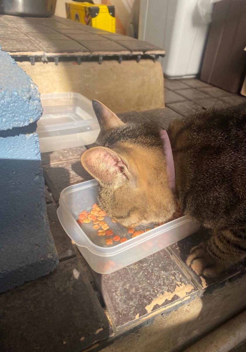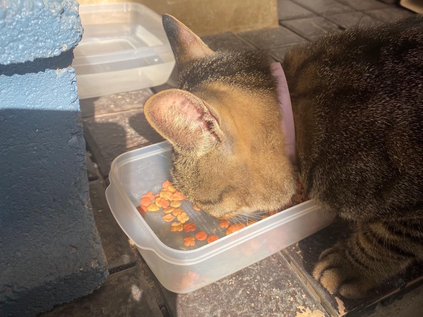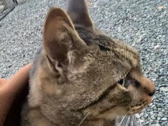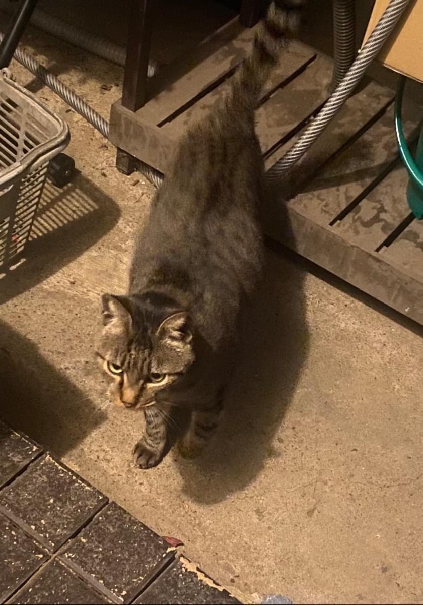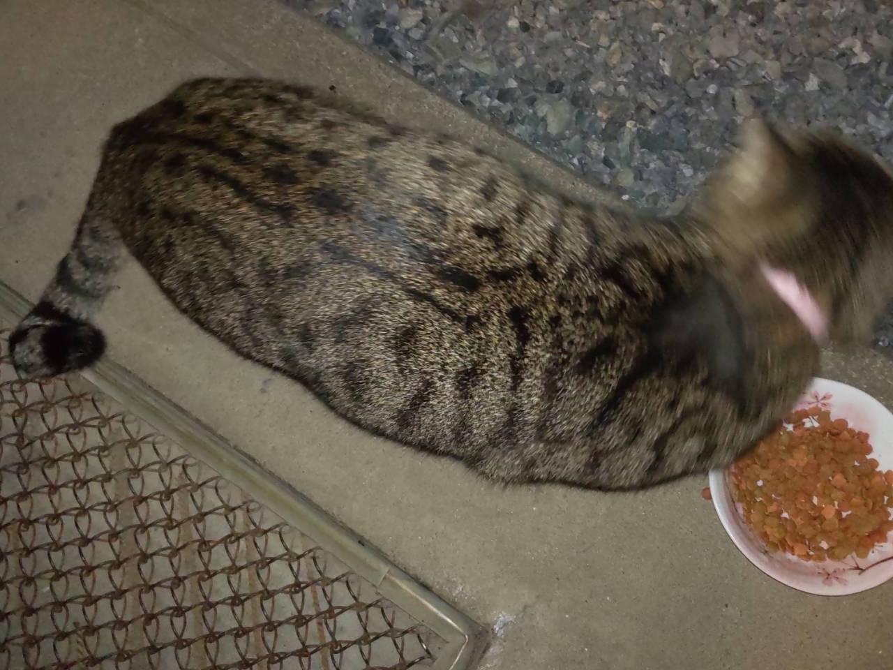 キジトラ成猫 ピンク首輪 尻尾まっすぐ先端折れ