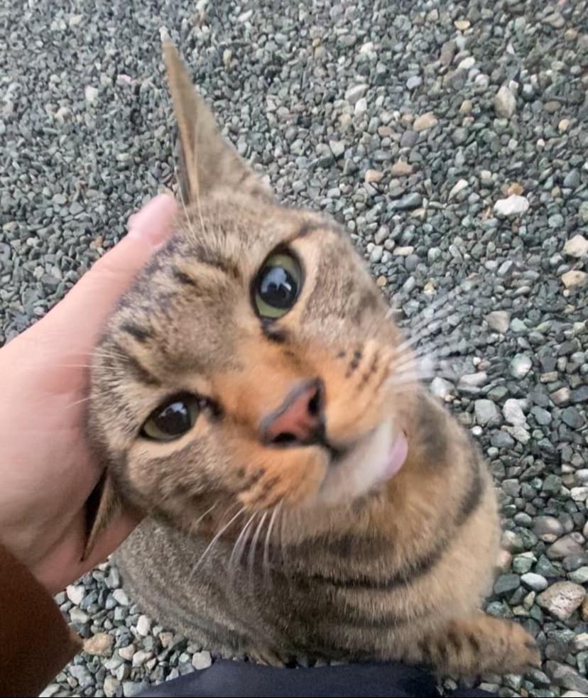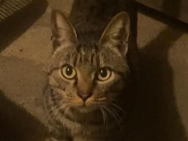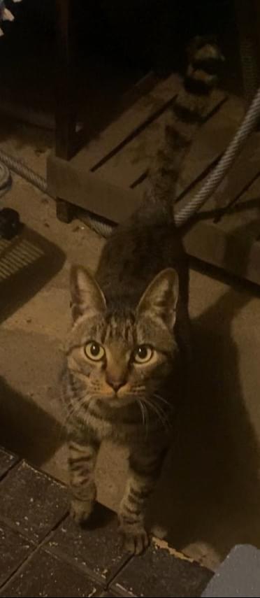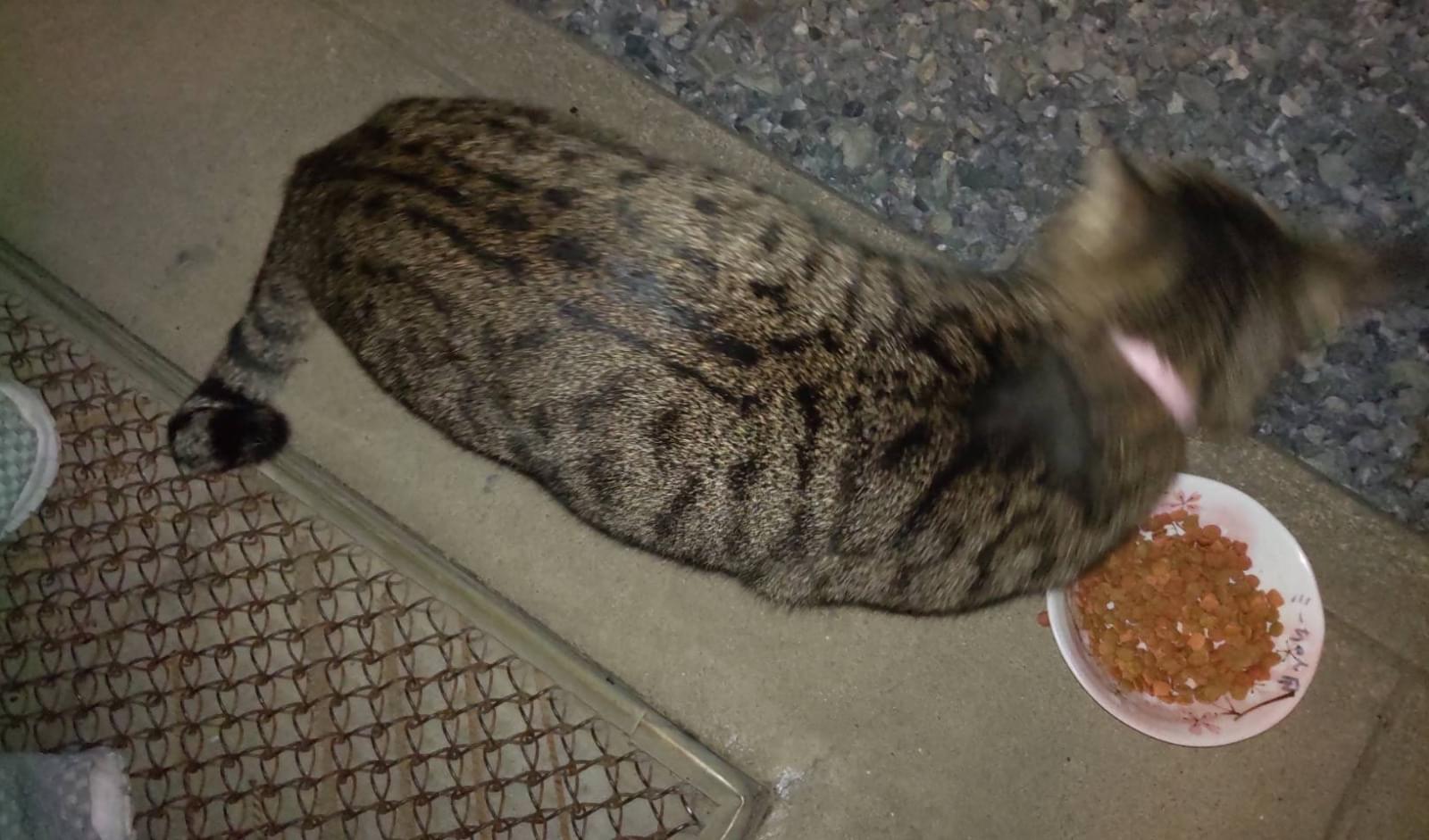 キジトラ、成猫、尻尾まっすぐ先端折れ、耳カットなし?、首輪はキャティーマンのピンク、オスメス不明です。