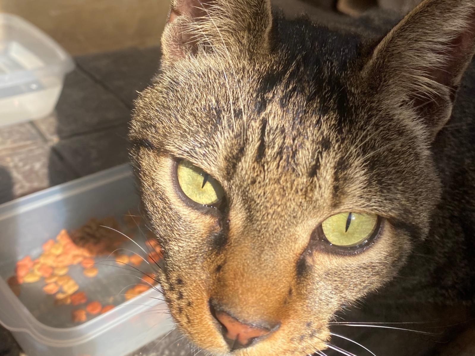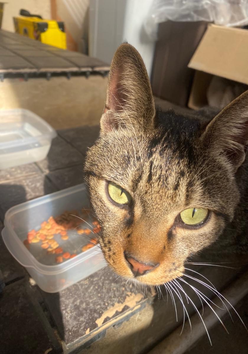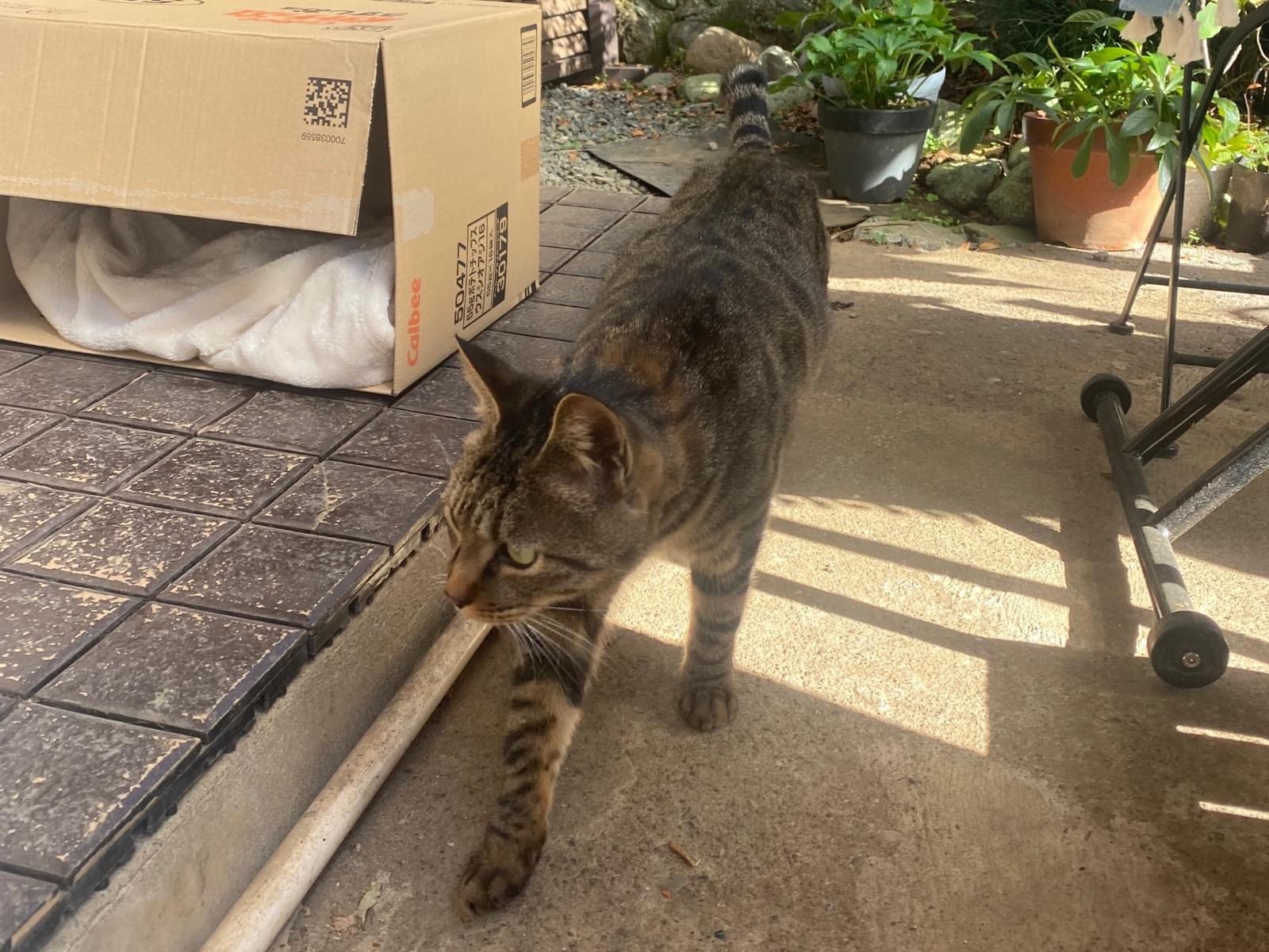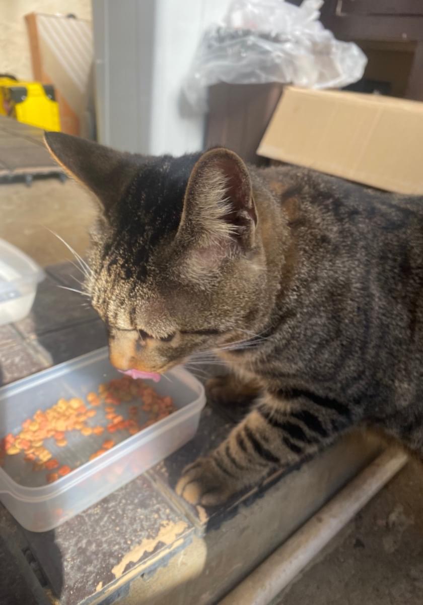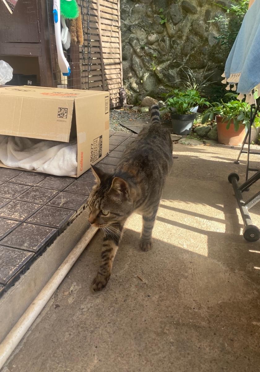 大声で庭で鳴いており、ごはんをあげたら沢山食べ、お腹が空いているようでした。ずっと庭にいます。
