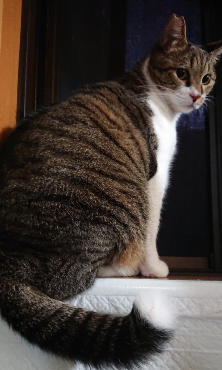 6歳くらいで特徴は、体重7kgきじとらでお腹側は4つ足も白く、尻尾の先端が白いのが目印しの子です。雄の去勢済み右耳カットされてます。