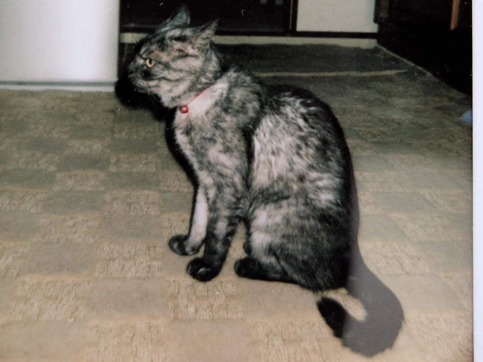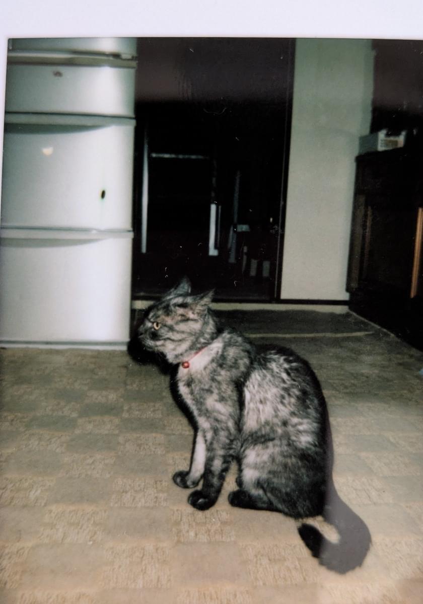サバトラ柄ですが、現在は高齢で白っぽい色になっており、シマシマ模様はわかりにくくなっています。