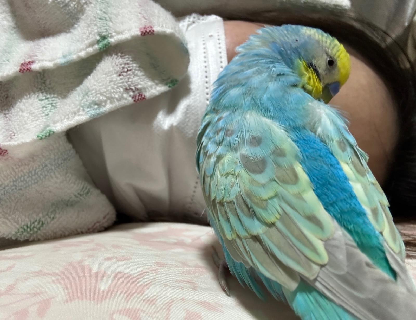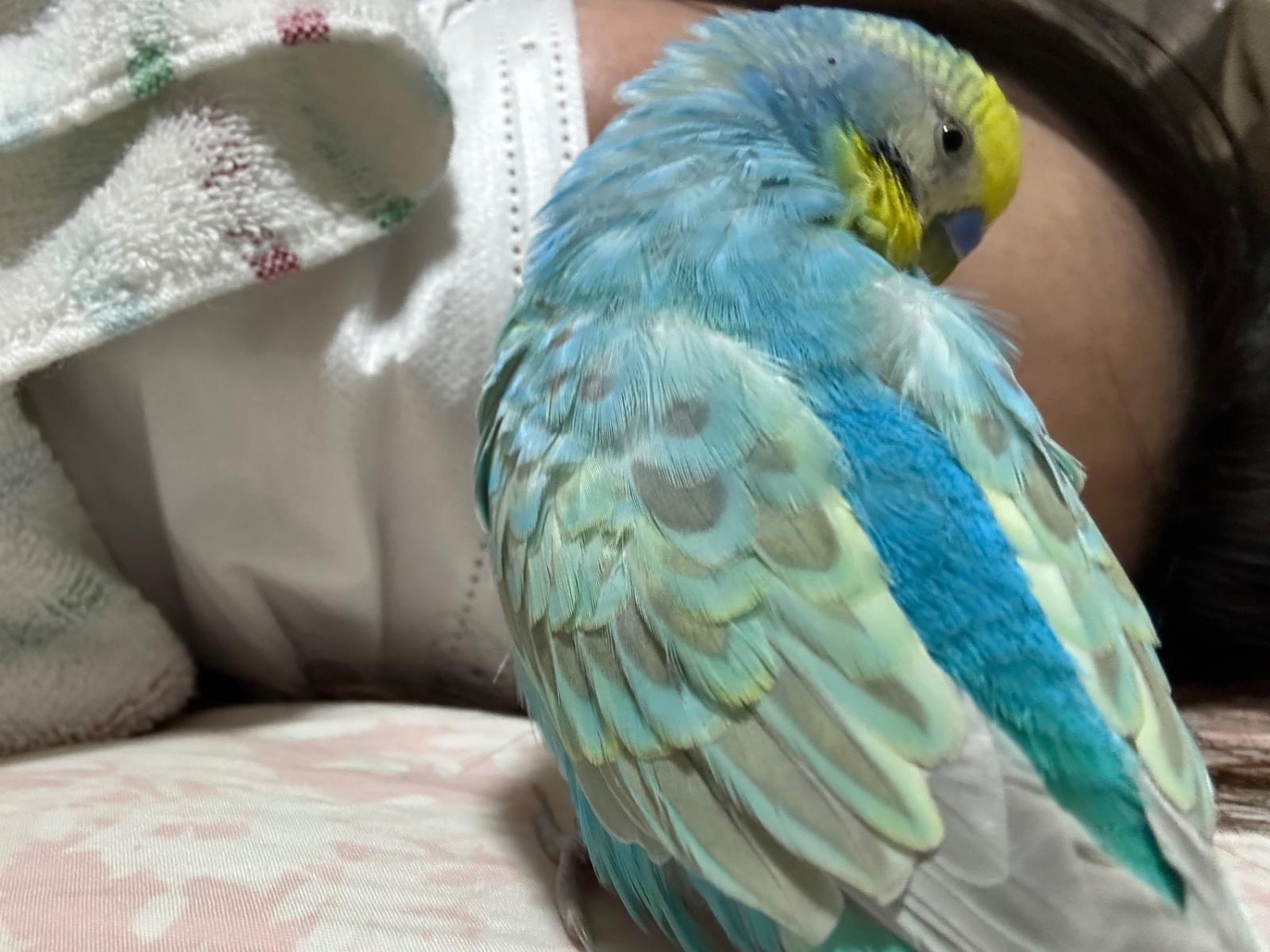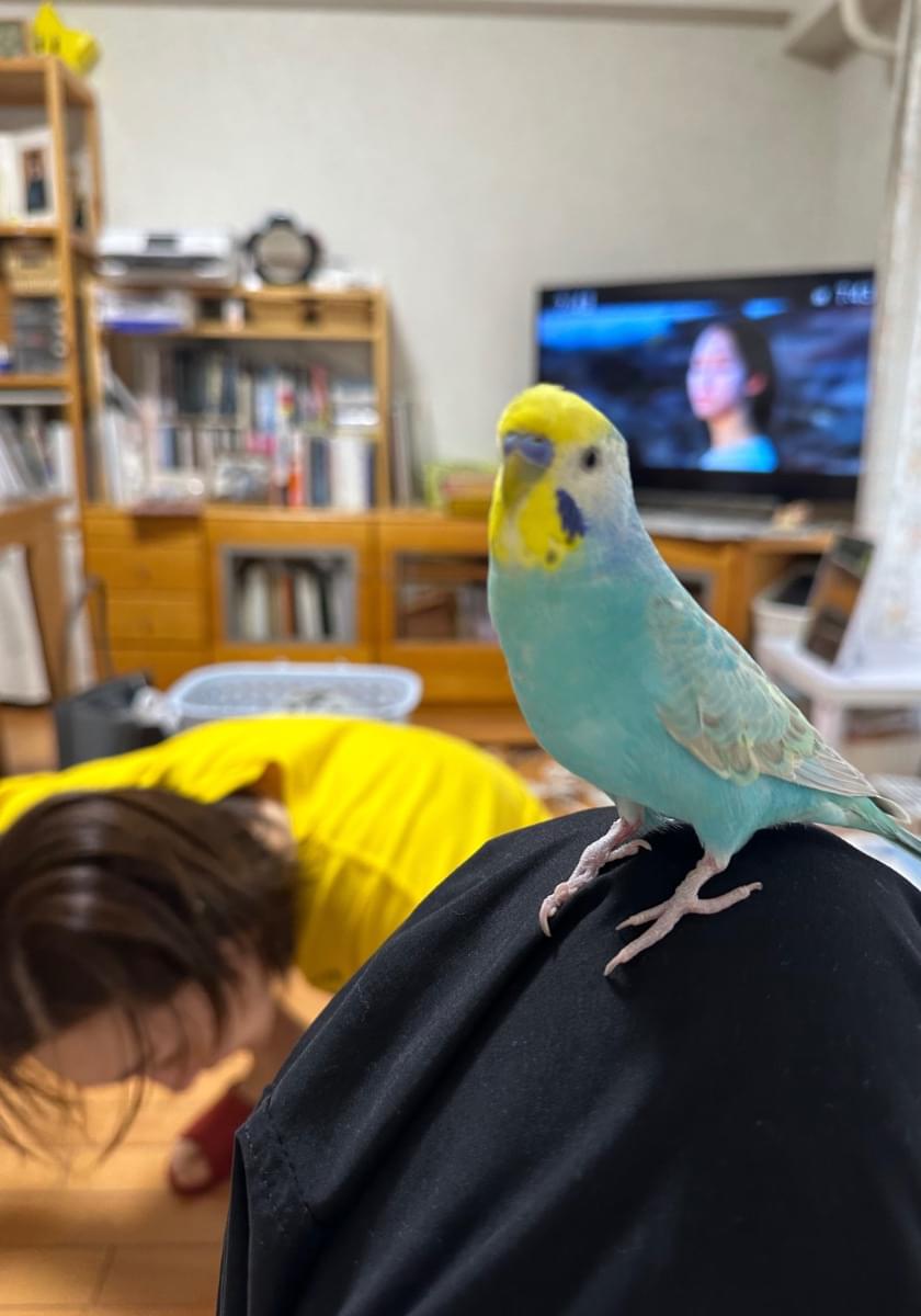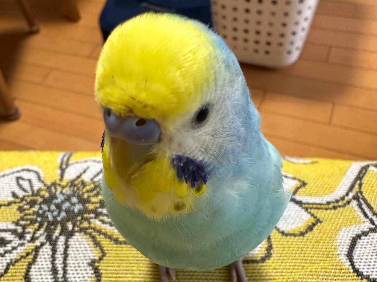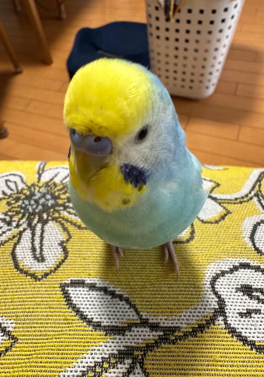 頭が黄色で背中が水色のセキセイインコを探しています。