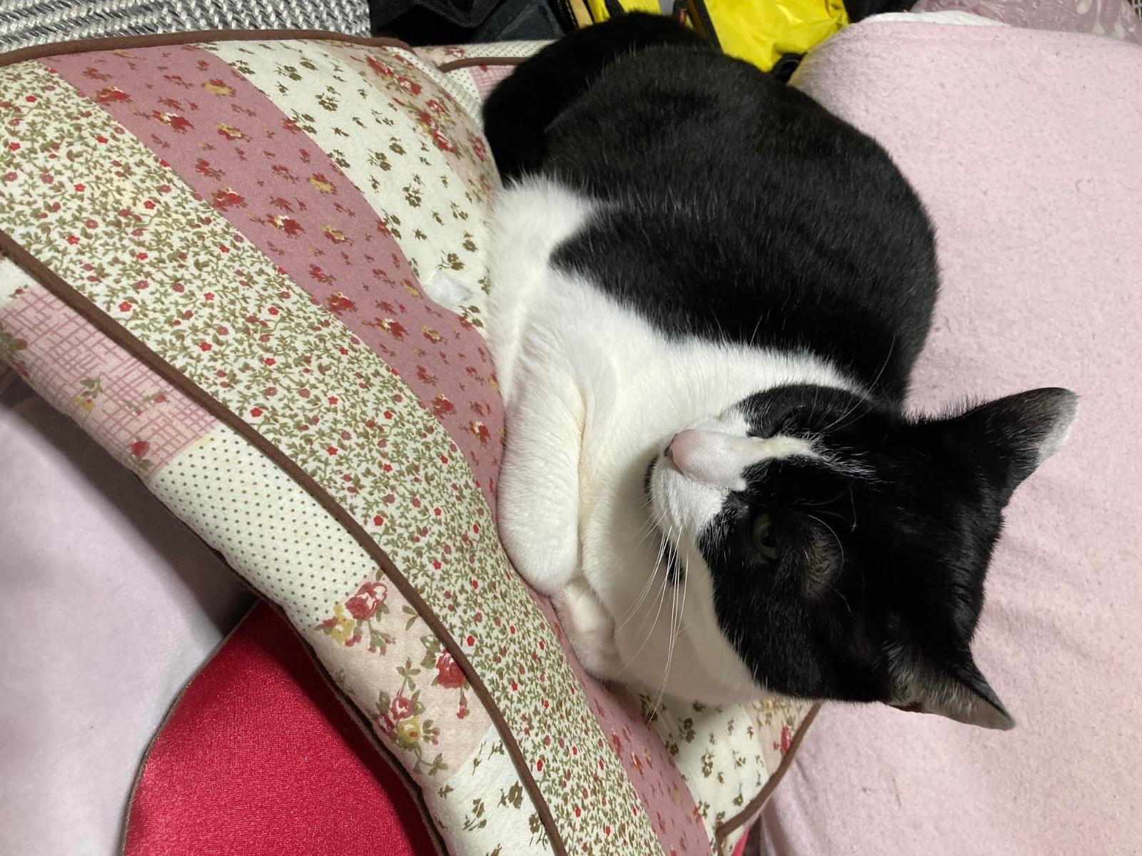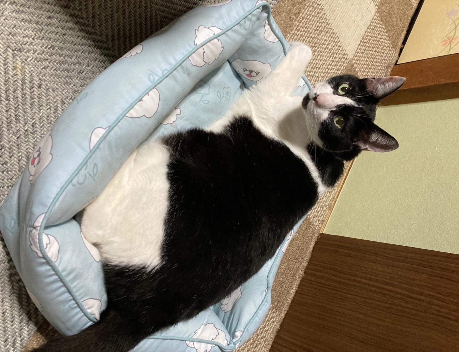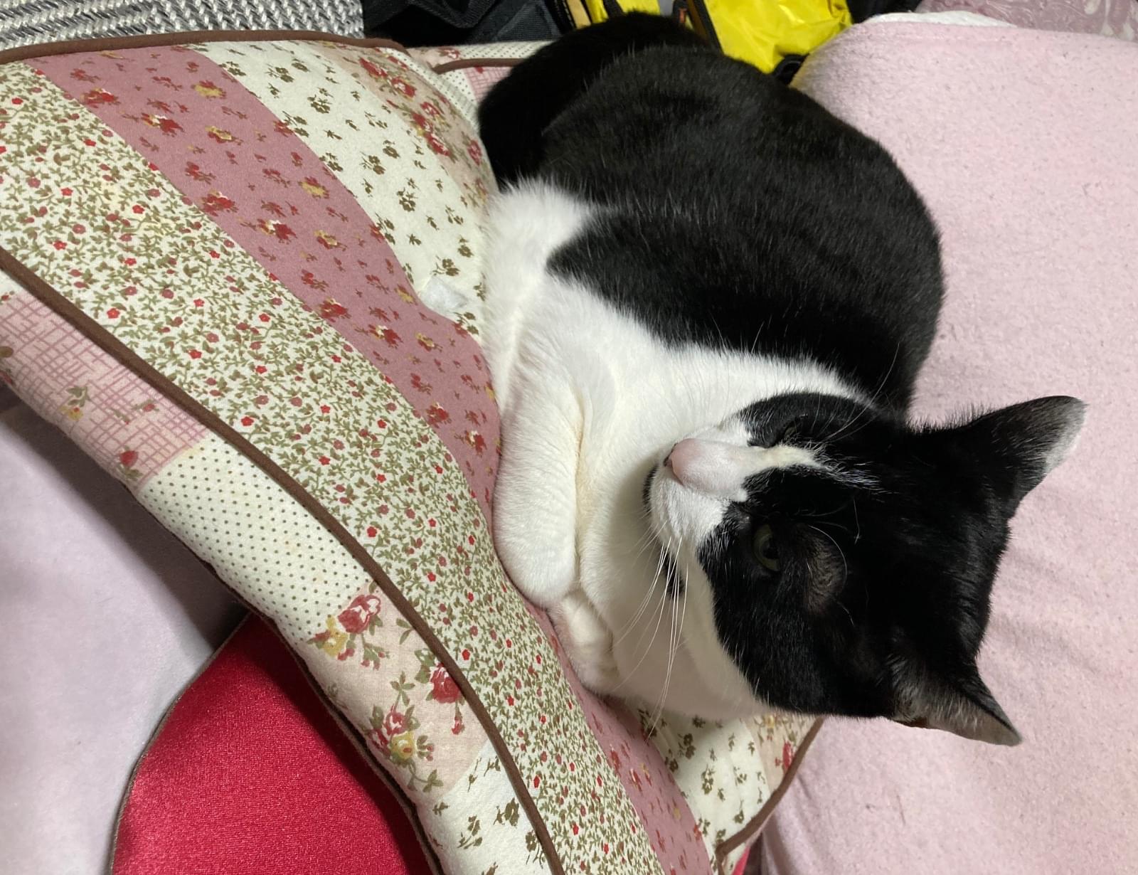 白黒の顔ははちわりで鼻の横にホクロのみたいかに黒い模様があり背中は黒いですがお腹と足は白いです