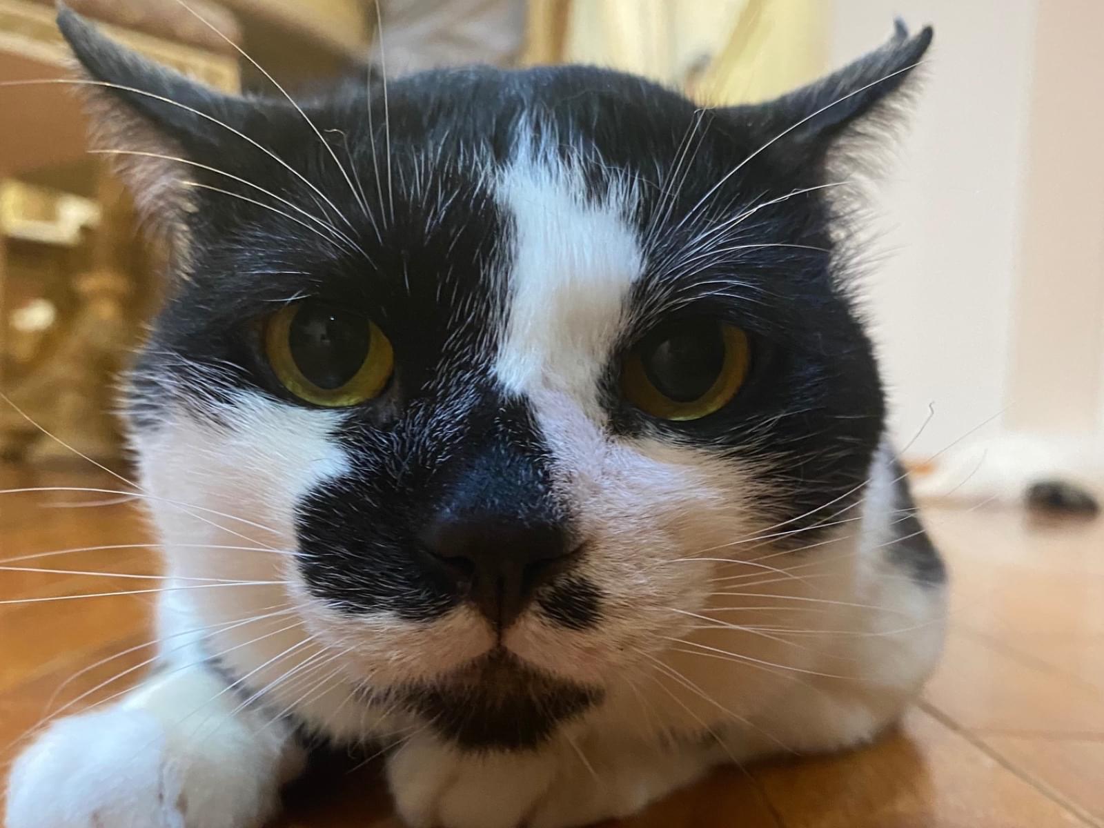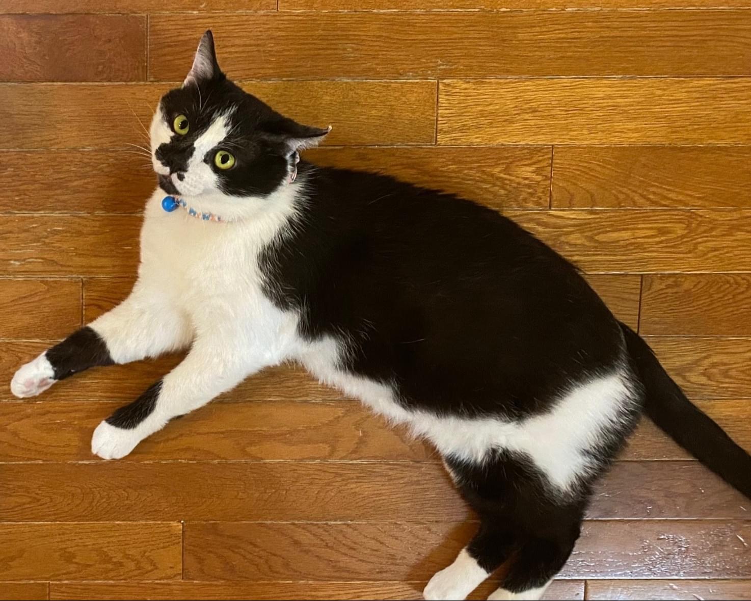黒白の去勢済みオスで、左耳にカットがあります。