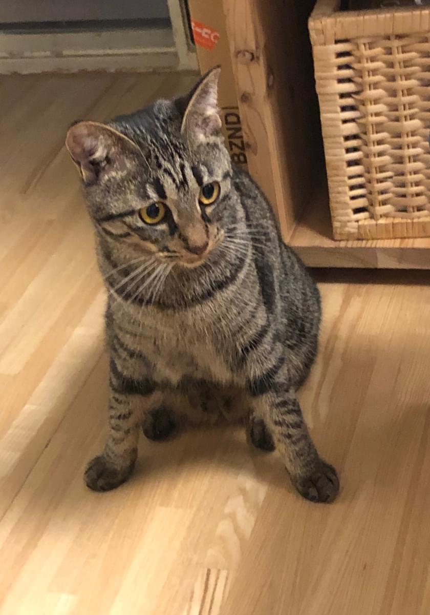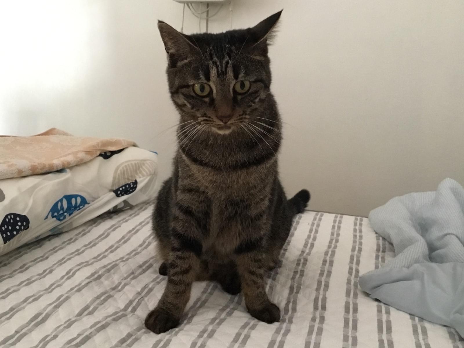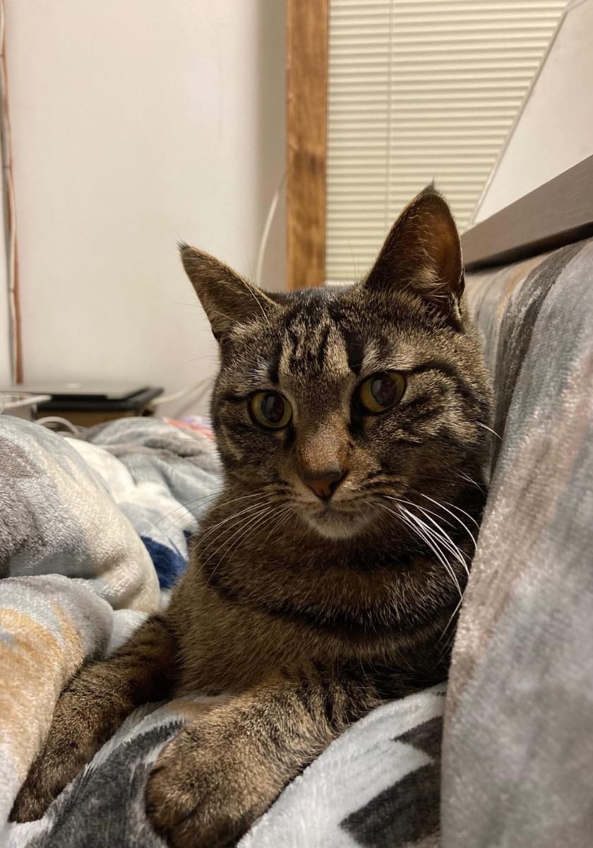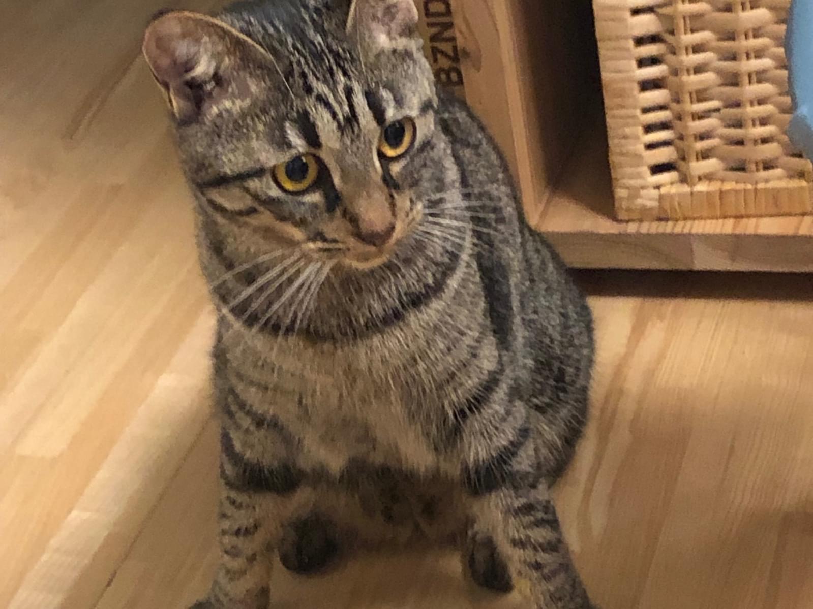鳴き声は高い声で泣きます。色はキジトラの中でも茶色い方と思います。
