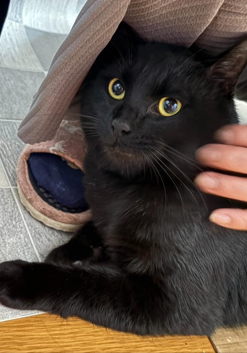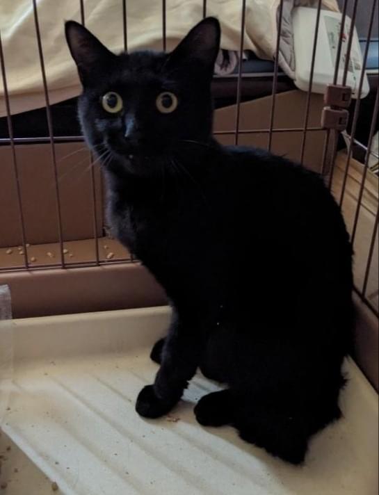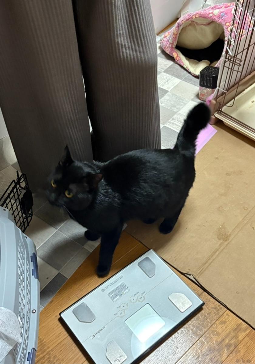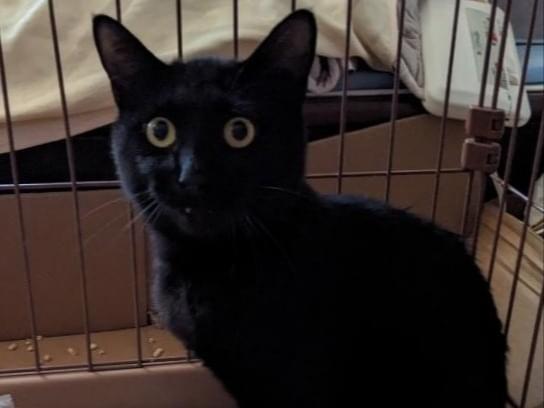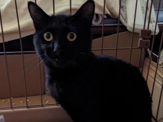 真っ黒でシッポの先が丸まっています。首輪無し去勢手術済ですが桜耳カットしていません。