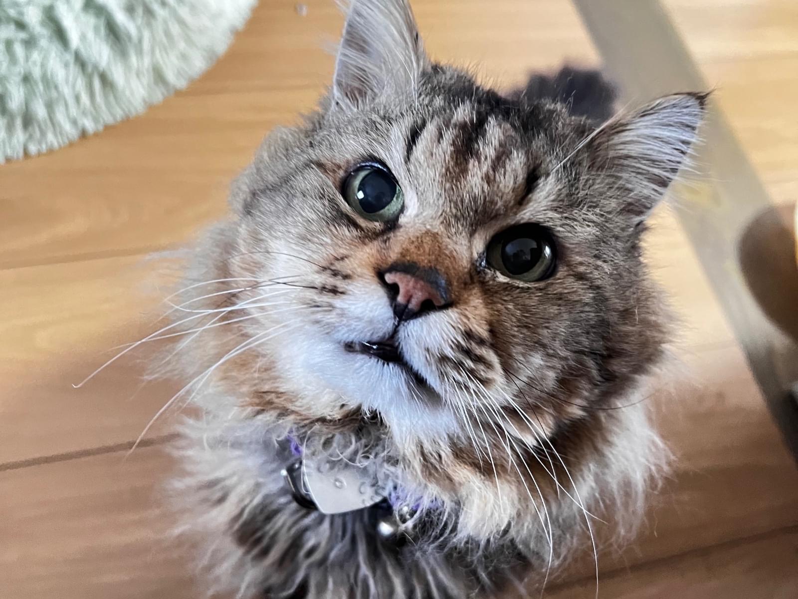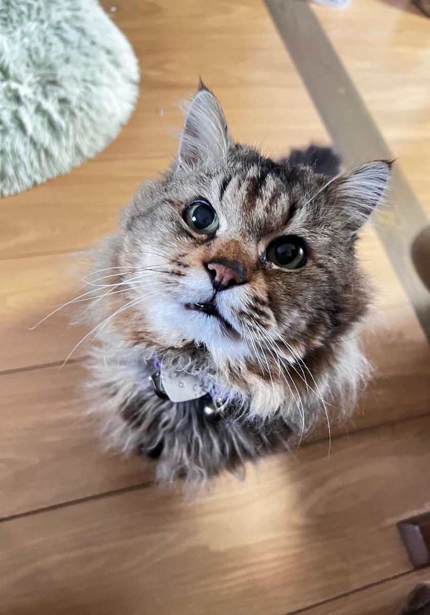 モフモフとした長毛のキジトラです。紫色とシルバーのハート型のペンダント、2本を付けてます。