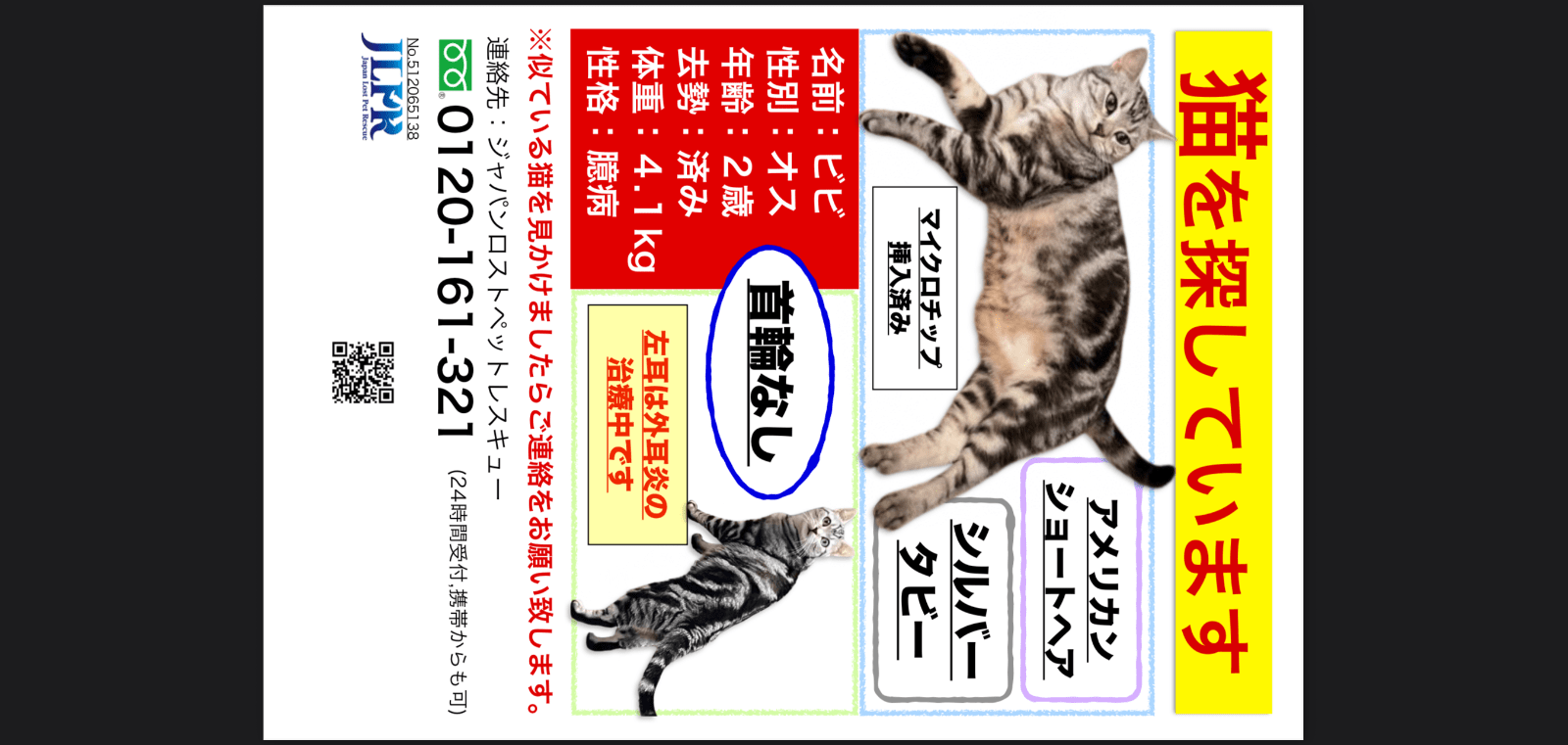 家の玄関を開けた瞬間に駆け出していきました。猫種はアメリカンショートヘア。色柄はシルバータビー。性格は臆病、怖がりです。去勢手術済み。家出する前の体重は約4キロありましたが少し落ちてるかもしれません。