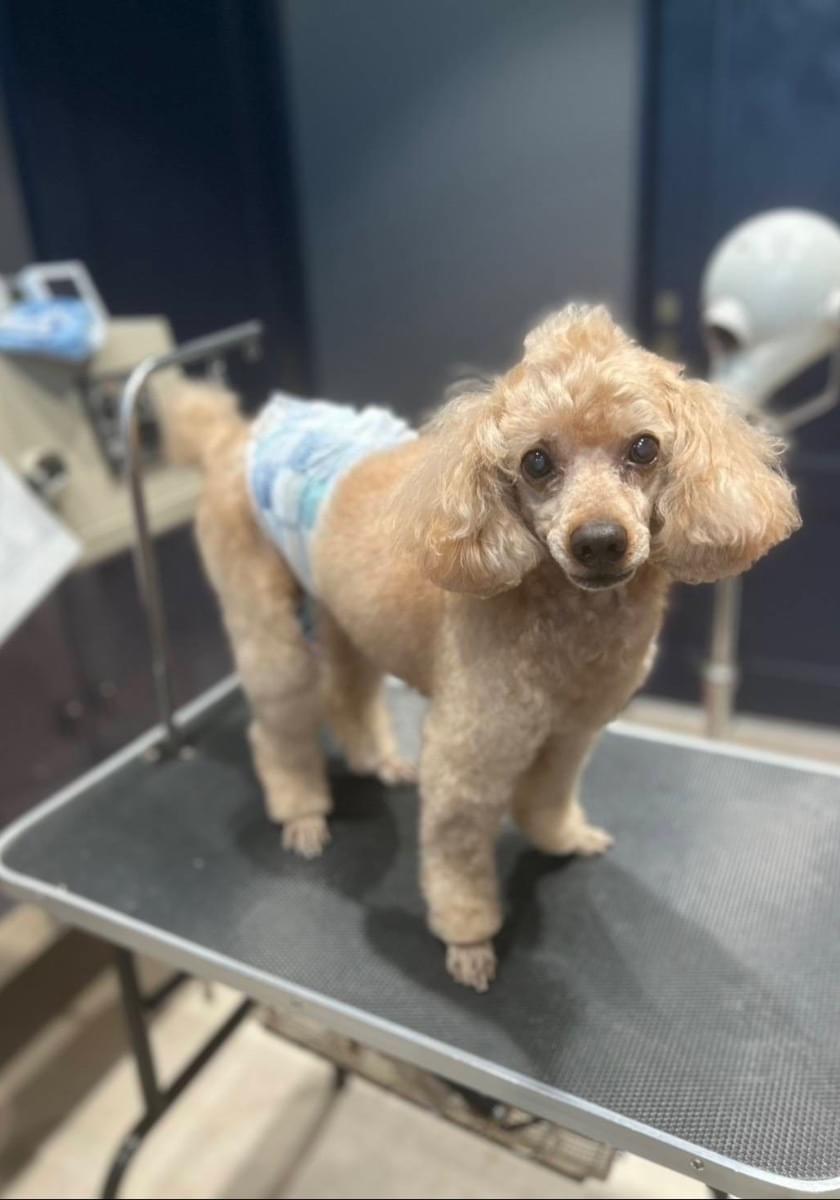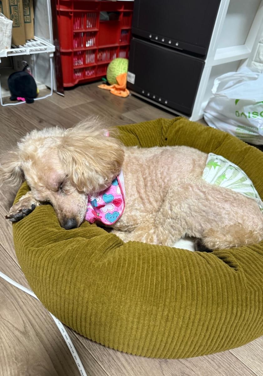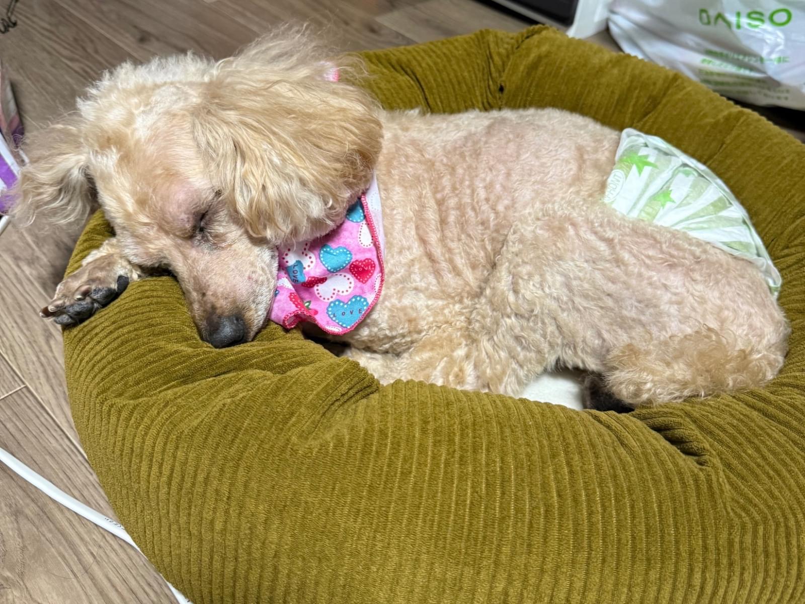 色はアプリコットですが、14歳の高齢のため、色が薄くなってベージュっぽい色になっています。